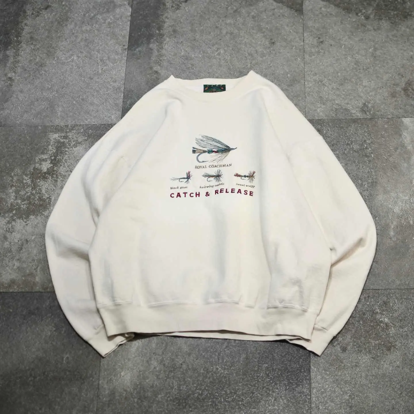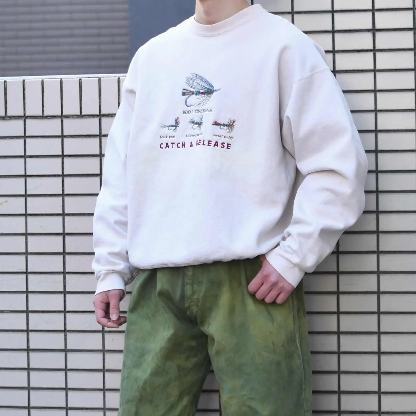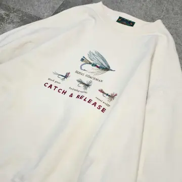 SIZE:L 着丈68cm 肩幅67cm 身幅67cm 袖丈62cm fabric/cotton・poly made in USA 着用画像 177cm/68kg どうやらフライフィッシングの中でも 有名な毛鉤のようです。 "ROYAL COACHMAN"、"Black gnat"、 "diving caddis"、"royal wulff" この4つを繊細な刺繍で施したスウェット。 アウトドアのスウェットらしいヘビーオンスな生地や、タグに色々な動物が棲んでいるのも推してます。 釣りには縁が無いけれど、クオリティと 抜けた塩梅に惹かれた一着です。 ※色味に関しましては、物撮りを参考に お願いいたします。 ※撮影状況により、実物と多少色が異なる場合が ございます。 ※古着を取り扱っているため、気づかない汚れや ほつれ等がある場合がございます。 ※サイズは着用感で選んでおり、 表記サイズは説明欄の最初に記載しております。 old vintage ヴィンテージ used 80's 90's アメリカ古着 ユーロ古着 POLO RALPH LAUREN Eddie Bauer OLD GAP LANDS' END ランズエンド LLBean エルエルビーン オールドギャップ エディーバウアー ラルフローレン ブルックスブラザーズ Brooks Brothers 生成り ベージュ などがお好きな方 #vintage #オーバーサイズ #old #used #90s #80s #古着 #ヴィンテージ #アメリカ古着 #ユーロ古着 #LLBean #エルエルビーン #EddieBauer #エディーバウアー #oldgap #オールドギャップ #LANDSEND #ランズエンド #NAUTICA #ノーティカ #ラルフローレン #POLORALPHLAUREN #ブルックスブラザーズ #BrooksBrothers #スウェット #トレーナー #デザインスウェット