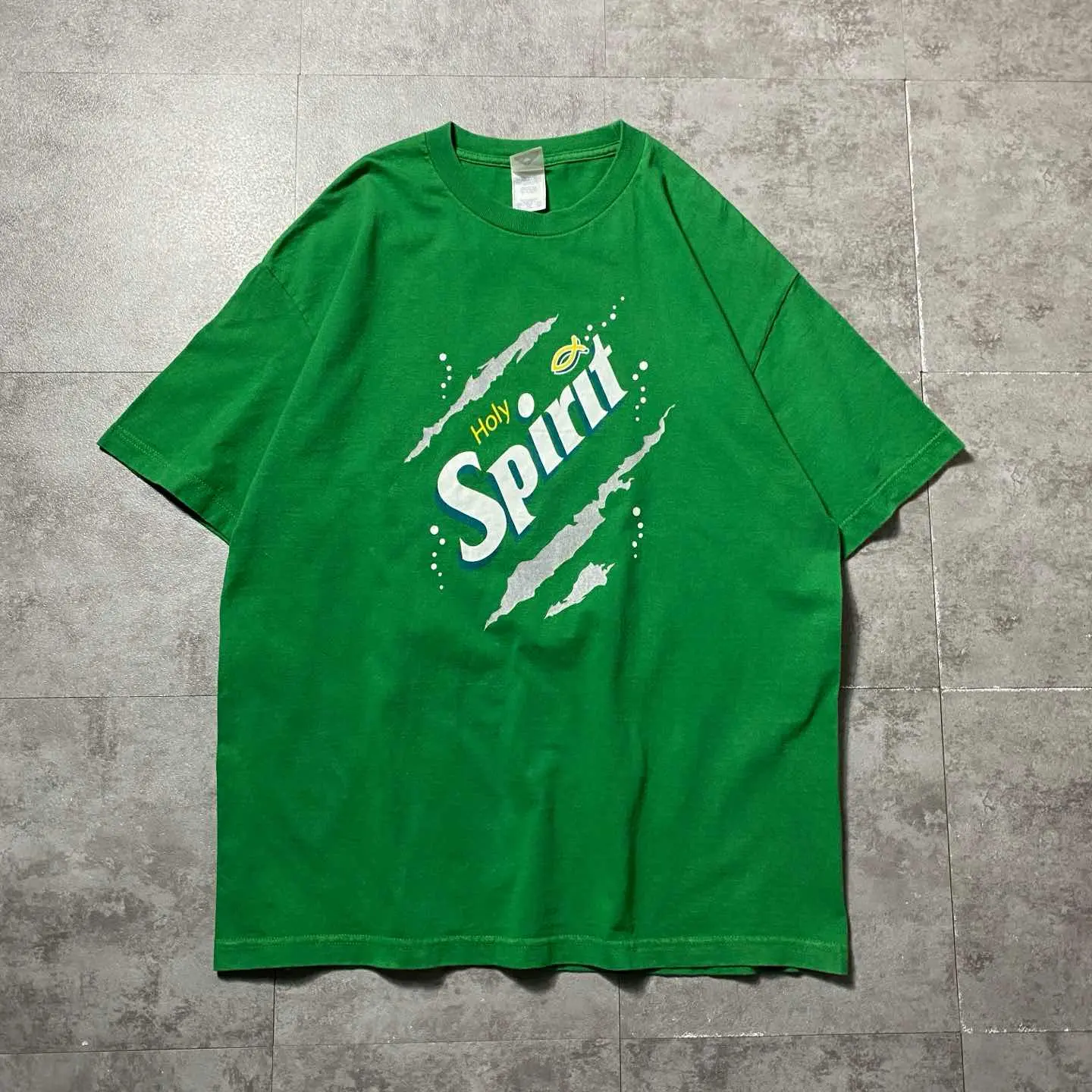 ◯ Explanation ◯ 2000年代頃のALSTYLEボディを使用したプリントTシャツ。 誰もが一度は目にしたことのある炭酸飲料「Sprite」のロゴをベースに、「Holy Spirit(聖霊)」へと落とし込んだユニークなパロディデザインが目を引く一着。 鋭く引き裂いたようなグラフィックとドットデザインが加わることで、単なるジョークTに留まらないストリート感のある仕上がりとなっています。 ボディは鮮やかなグリーンカラーで、フロントのホワイト×ブルーのロゴが映える好配色。 ALSTYLE特有のしっかりとしたコットン生地に、程よくゆとりのあるXLサイズで、現代のスタイリングにも取り入れやすいシルエットです。 宗教的メッセージとポップカルチャーを掛け合わせたこの手のデザインは海外でも評価が高く、他と被りにくい一点物としておすすめ。 一枚で主役になるインパクトを持ちつつも、ストリートスタイルに自然と馴染むバランスの良さも魅力です。 ○Size○ 表記→XL ・着丈76 ・身幅58 ・肩幅57 ・袖丈22 (cm) ○Color○ ・グリーン ○Material○ ・100%コットン ○Condition○ ・目立つ傷や汚れなし ○Caution○ 当店で取り扱っている商材は全て『古着』となっております。 そのため、多少の状態難(ほつれ、傷、汚れ、リブの伸び、使用感、擦れ、色あせ、etc)がある場合がございます。 新品同様の完璧なお品物をお求めの方は当店でのお買い物を控えて頂きますよう宜しくお願いします。 また、購入された商品に関しましては、購入日時から起算して『72時間以内に』発送手続きの方を取らせて頂きます。 お急ぎの場合は購入前に当店オンラインストアの方にお問い合わせ頂きますよう宜しくお願いします。 26/724