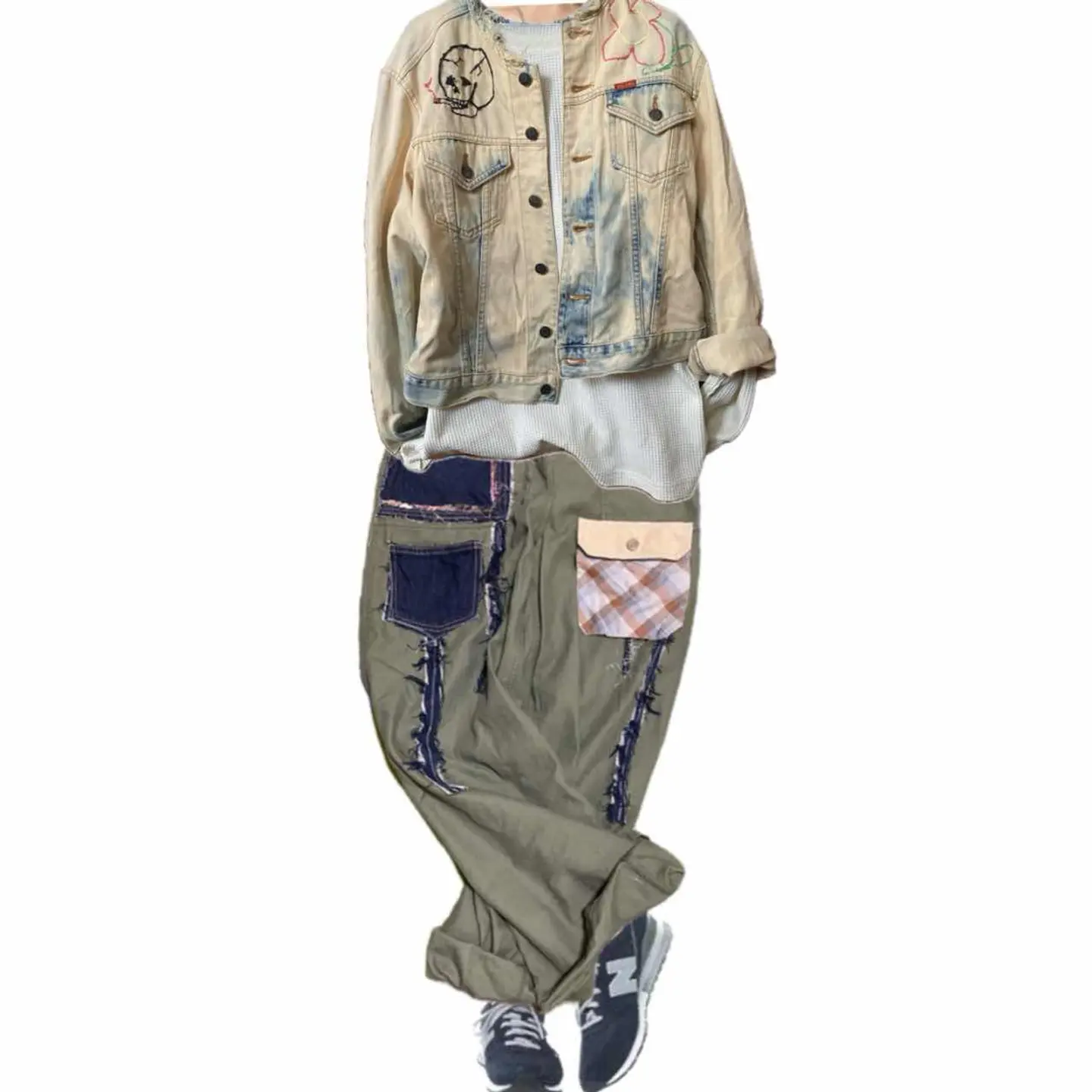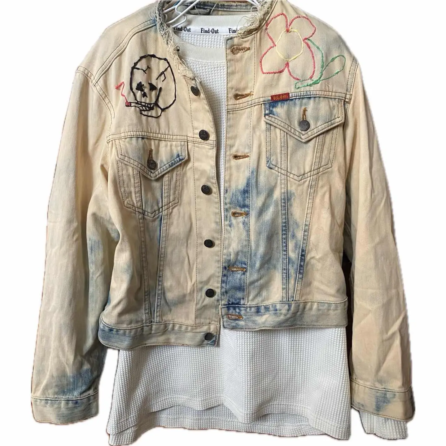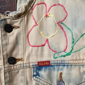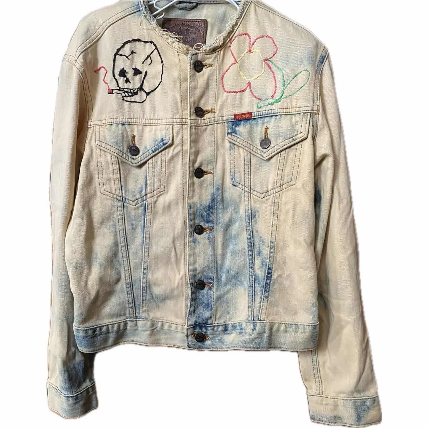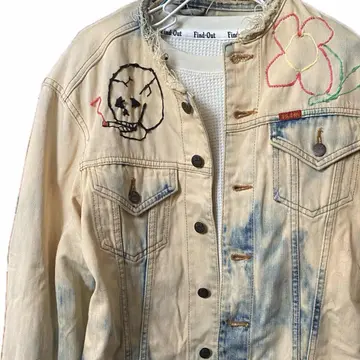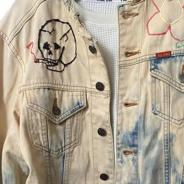 90s【コレクター必見】 MV602、廃盤 スカル刺繍Gジャン 赤タグ 90年代ヴィンテージのビックジョンの惜しまれながら生産終了になったMV602 赤ネーム、レザータグ、シリアルと、半端ないヴィンテージポイント全て残っているデッドストックをさらにかっこよくした。まずブリーチしてノーカラーにしてカットオフですね。ほつれ止め当たり前してます。 胸にスモーキングスカルフラワーの刺繍を手作業で施し、さらにバックにハードロックカフェのTシャツを切り縫い付けました。前後どちらでもパーフェクトだし、そもそもMV602は、知識ない人は安いものと勘違いしてるかもしれませんが、全く違います。めちゃくちゃ激レアですよ。だって復刻すらしないと言うポリシーの塊ですよ。 そしてさらにこのタイプが人気あるのはショート丈タイプなのに、めっちゃ着回しが効くことです。コーディネート参考にしてください。さらにリメイクのカーゴパンツとゆるだぼのチェックパンツそうアメリカンヨーロピアンカジュアルですね。ちなみに、インナーの柄シャツも私が作ったやつです。Tシャツだろうがなんだろうが。シャツだろうが、着回しききます、 さらに、世界に1つのデザインだったら、少しでも気になった人は確実にさせる自信がありますのでご購入ください ▷color◁ ブリーチカラー ※ブラウザで異なる場合ありますがかなり実物には、近づけてます、 ▷size◁ 平置き片面採寸【㎝表記】 表記size M表記だが、Lはある、 着丈/60 身幅/53 身幅L 肩幅/46 袖丈 /61 DSは袖はハンガー採寸 ※多少の誤差は理解下さい 170/Mジャスト体型の私が着て、✔️参考に ジャスト オーバーサイズ✔︎ ビックサイズ 【素材】 デニム 【状態】 最強、デットストック惜しみなく使った 検品、洗濯、検品で、3回チェックして発送しますので、ご安心して、お買い求め下さい!!