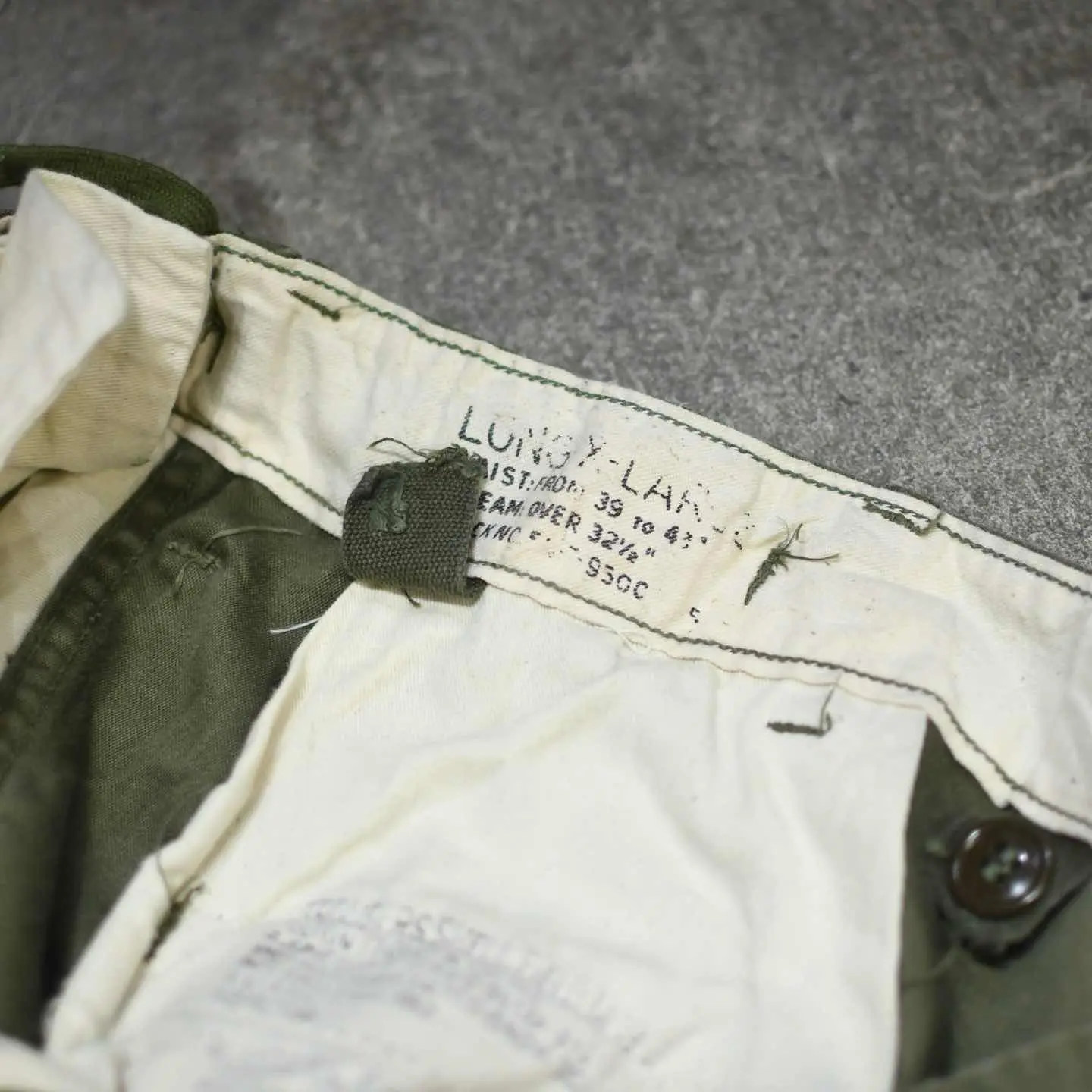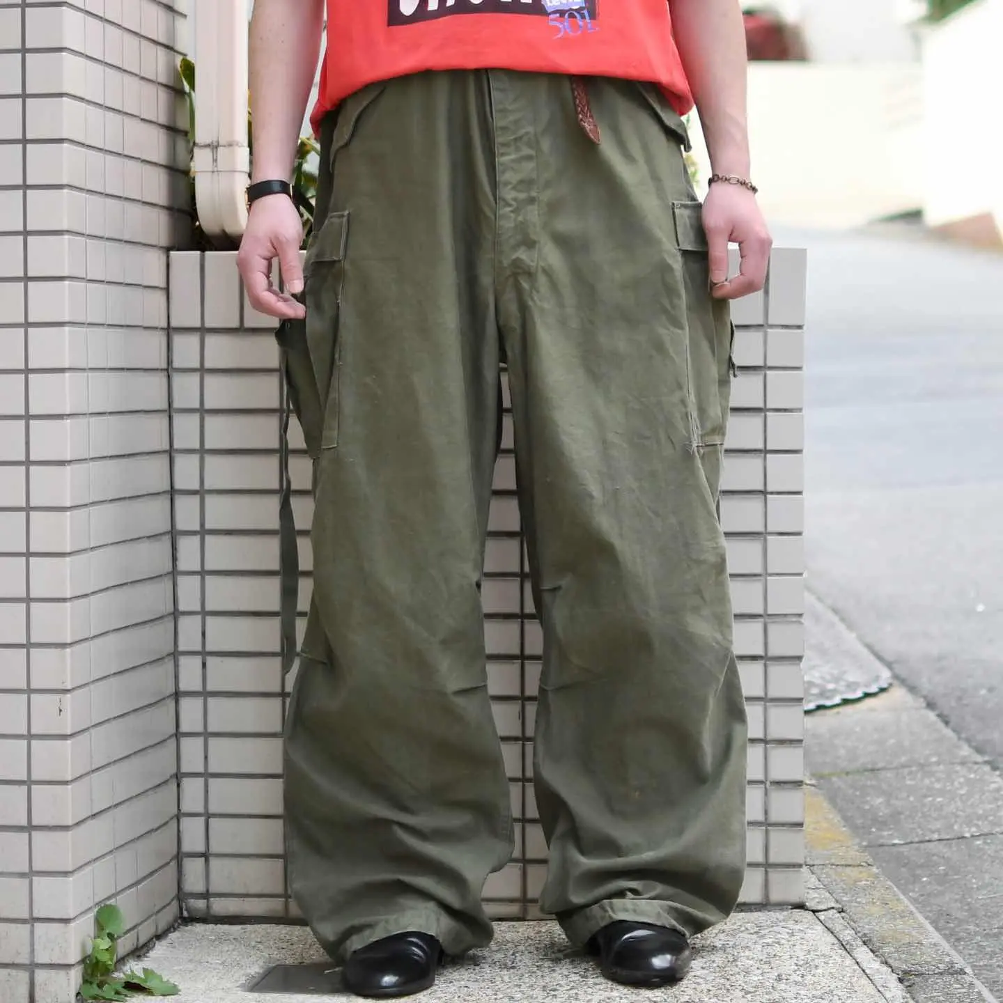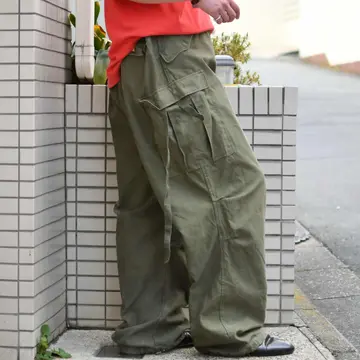 SIZE:LARGE-LONG ウエスト~110cm(アジャスター付き) 総丈120cm 股下80cm わたり47cm 裾幅~28.5cm(ドローコード付き) fabric/cotton 着用画像 177cm/68kg ”LARGE-LONG” この表記となると、大き過ぎるという 負の先入観を持ってしまいがち。 そして自分自身もこのサイズには 初めて足を通しましたが、一周回って良いなと 感じました。 足元のドローコードを絞れば、溜まった生地が 自然に落ち、ストレートかつワイドなシルエットを 生み出してくれるサイズ感。 生地に焦点を当てても65よりこちらの方が好みですし”名品を名品らしく”というよりか、 雑に、外しとしてそんなスタイリングにも 落とし込めたらなと。 街で見かける機会も減ってきましたし、 これから先はより活躍する一本ではないでしょうか。 ※背面に直し痕あり。 ※撮影状況により、実物と多少色が異なる 場合がございます。 ※古着を取り扱っているため、気づかない汚れや ほつれがある場合がございます。 ※サイズは着用感で選んでおり、 表記サイズは説明欄の最初に記載しております。 古着 オーバーサイズ old vintage ヴィンテージ used 80's 90's POLO RALPH LAUREN Eddie Bauer OLD GAP LANDS' END LLBean エディーバウアー ラルフローレン ミリタリー フィールドパンツ 50's イギリス軍 イタリア軍 スウェーデン軍 フランス軍 チェコ軍 ワイドパンツ m-51 m65 などがお好きな方 #vintage #old #used #90s #80s #古着 #ヴィンテージ #LLBean #エルエルビーン #EddieBauer #ラルフローレン #POLORALPHLAUREN #アメリカ軍 #フィールドパンツ #カーゴパンツ #m51 #m65 #50s