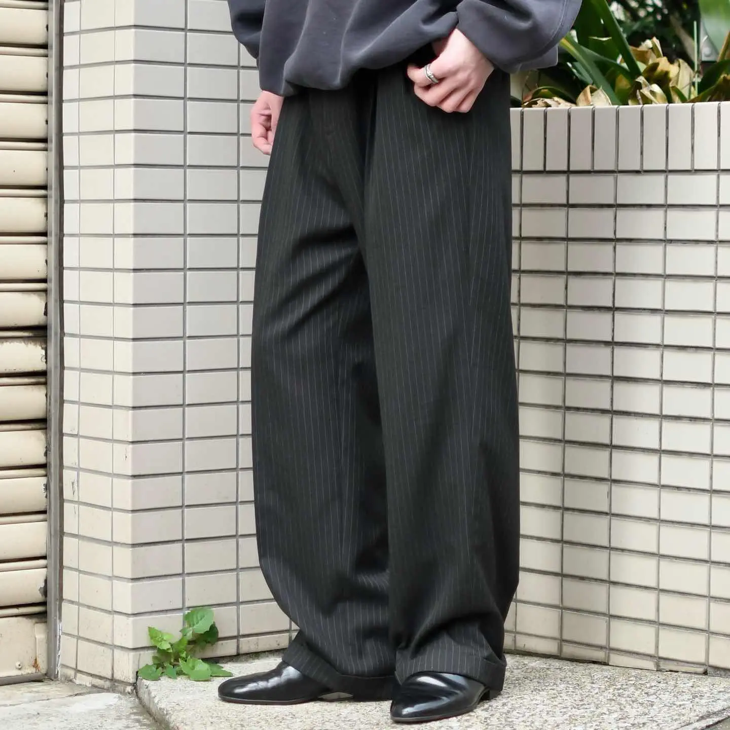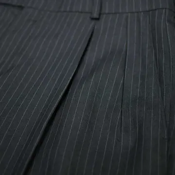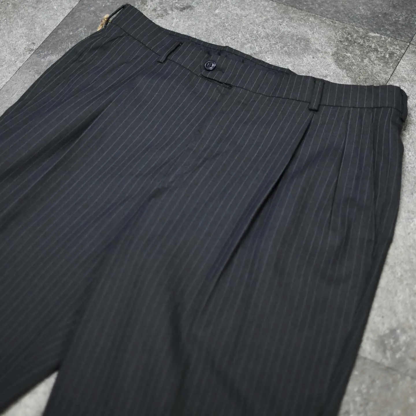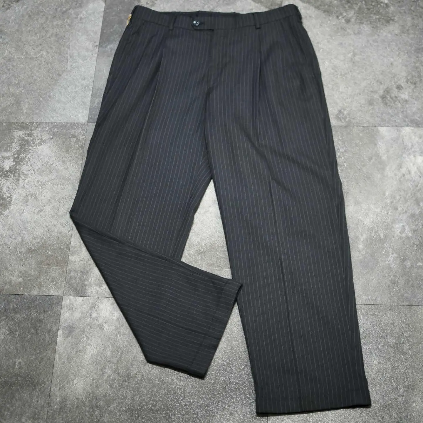 SIZE:34×30 ウエスト86cm 総丈105cm 股下75cm わたり38cm 裾幅24cm fabric/rayon・poly 着用画像 173cm/58kg 1926年アメリカ、テキサス州で創業を始めた "HAGGAR" そんなブランドの十八番、スラックス。 単色黒スラックスは手元にあるけれど、 もう少し幅を広げたい方へ。 フォーマルな印象があるピンストライプ柄を、 レーヨン混の動きのあるゆったりとした シルエットで中和、上品かつ差別化にも 落とし込める一本です。 探し始めると中々納得のいく個体が見つからない ストライプパンツ。 通年穿けるこんな個体を手元に迎えてみては どうでしょう。 ※裾上げ等のレングス直しにつきましては、 購入前に、必ずご連絡お願い致します。 ※撮影状況により、実物と多少色が異なる 場合がございます。 ※古着を取り扱っているため、気づかない汚れや ほつれがある場合がございます。 ※サイズは着用感で選んでおり、 表記サイズは説明欄の最初に記載しております。 古着 old vintage ヴィンテージ used 80's 90's POLO RALPH LAUREN Eddie Bauer OLD GAP LANDS' END ランズエンド LLBean エルエルビーン オールドギャップ エディーバウアー ラルフローレン ブルックスブラザーズ Brooks Brothers ブラック 黒 ストライプパンツ などがお好きな方 #vintage #old #used #90s #80s #古着 #ヴィンテージ #LLBean #エルエルビーン #EddieBauer #オールドギャップ #LANDSEND #ランズエンド #NAUTICA #ラルフローレン #POLORALPHLAUREN #ブルックスブラザーズ #BrooksBrothers #ワイドパンツ #スラックス #タックパンツ #ストライプパンツ