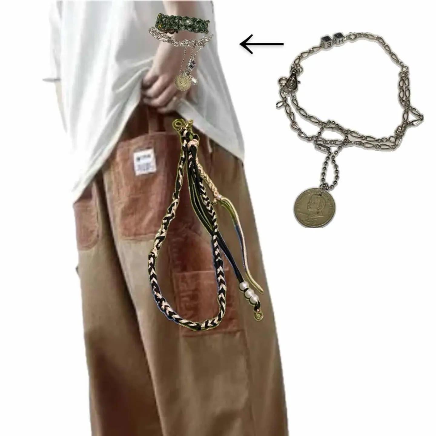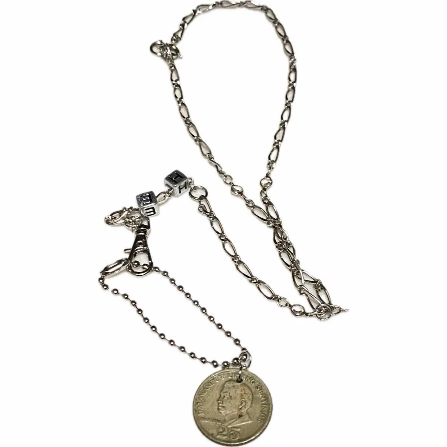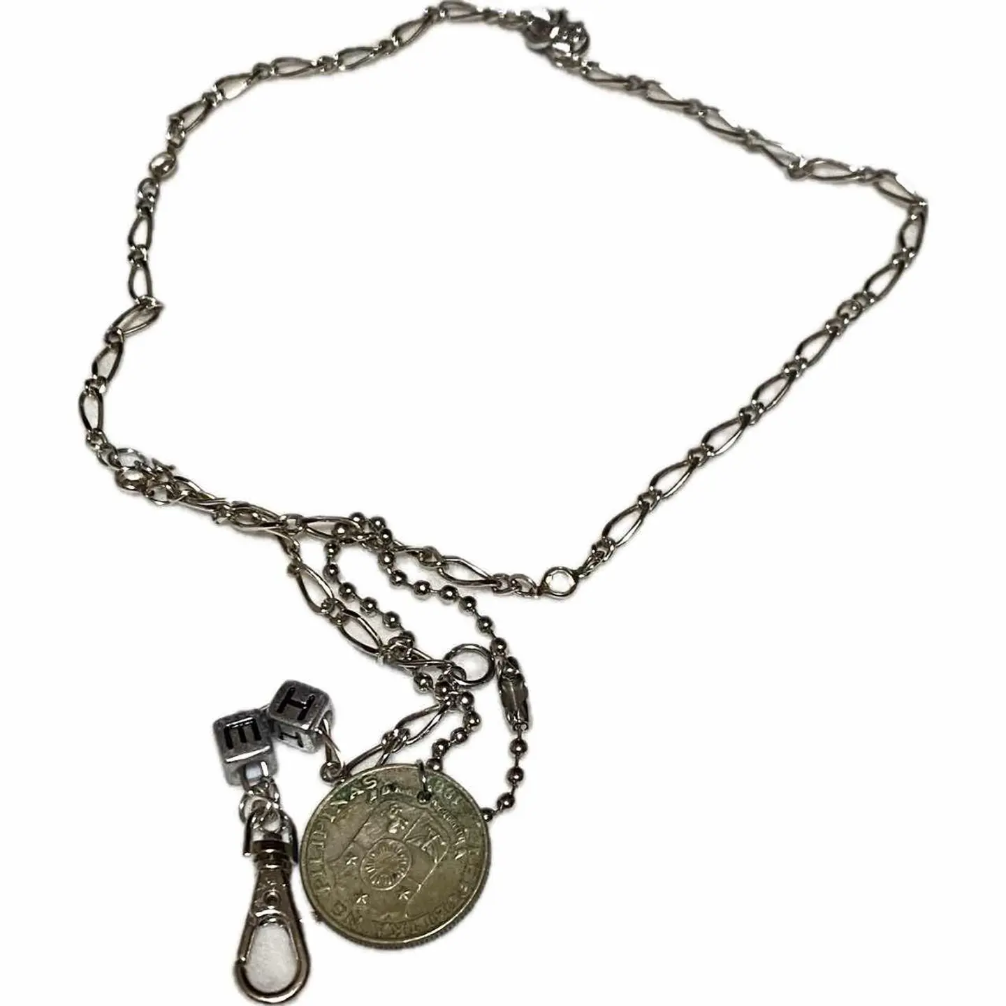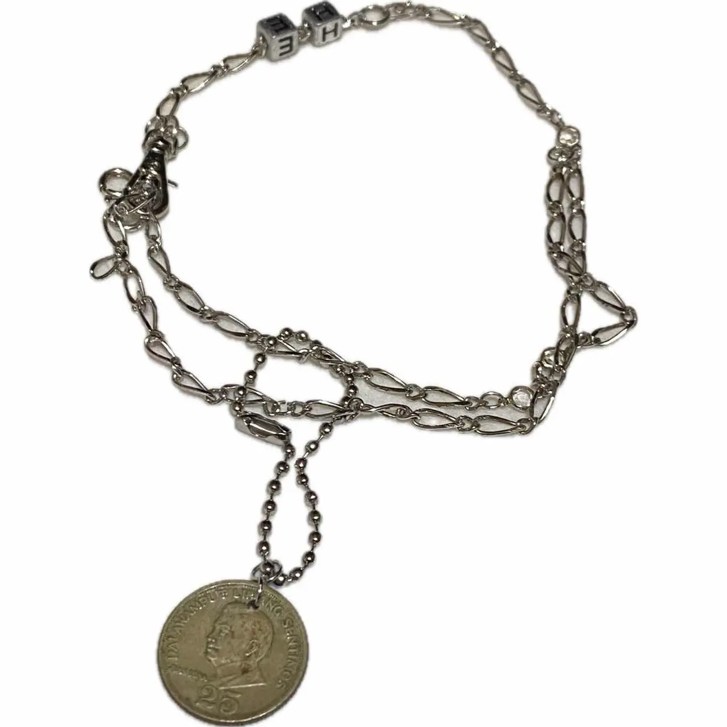 ハンドメイド 新品➕60s vintagecoin 2way ブレスレット 細かいとこにも拘るから、スタンスとか、拘りが見える、アクセにも、気を使えば、かなり、オシャレになります^_^ スクリューチェーンを、 全て繋ぎあわせ、これが 正直一番大変でした^_^ ダイス通し、穴あけかなり慎重にやりました!! ボールチェーンで、vintageコイン通し取り外し可能にする、 また、コーデ見てくださいね、ダブルチェーンにしあげてるから、高見えします、し、ちゃちくない、 また、エスケープフックといわれる技法これ、やる方中々いないっすよ、丁寧に作ってますので、破損はないですが、アクセサリーはたまに使い方で留め具とれたりする場合を考慮して、 ※予備の留め具を取り付けでます。 サイズ一周30センチまで対応、巻いてサイズ調整出来る、ボールチェーン5 コイン2です、