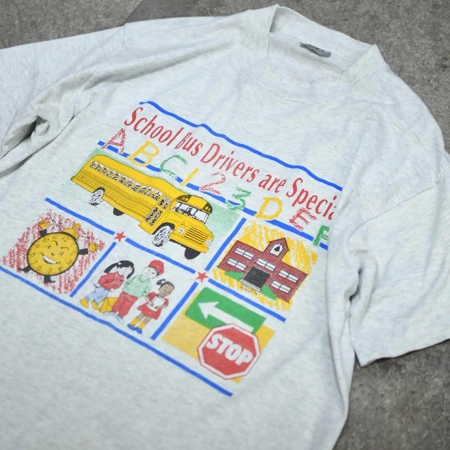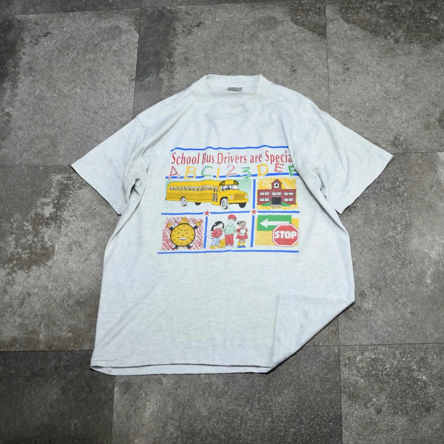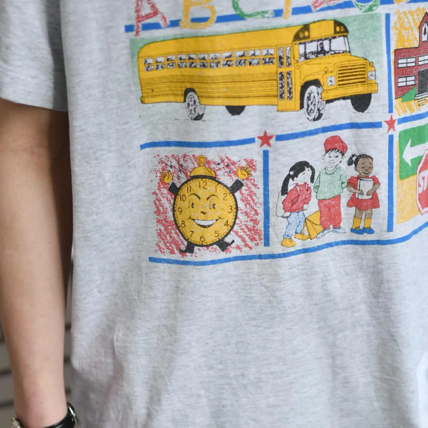 SIZE:L 着丈75cm 肩幅53cm 身幅58cm 袖丈20cm(シングルステッチ) fabric/cotton・poly made in USA 着用画像 173cm/58kg 恐らく当時の学生達が担当してくれていた スクールバスの運転手に向けて贈った Tシャツではないでしょうか。 詳しい情報はないけれど、 温かみのあるTシャツですし、 左下の目覚まし時計のキャラクターが推し... 整ったボディバランスと少し抜けの出るプリント。 個人的に好きなTシャツの類です。 ※撮影状況により、実物と多少色が異なる場合が ございます。 ※古着を取り扱っているため、気づかない汚れや ほつれ等がある場合がございます。 ※サイズは着用感で選んでおり、 表記サイズは説明欄の最初に記載しております。 古着 オーバーサイズ old vintage ヴィンテージ used 80's 90's アメリカ古着 ユーロ古着 POLO RALPH LAUREN Eddie Bauer OLD GAP LANDS' END ランズエンド LLBean エルエルビーン オールドギャップ エディーバウアー ラルフローレン ブルックスブラザーズ Brooks Brothers 灰色 半袖Tシャツ などがお好きな方 #vintage #オーバーサイズ #old #used #90s #80s #古着 #ヴィンテージ #アメリカ古着 #ユーロ古着 #LLBean #エルエルビーン #EddieBauer #エディーバウアー #oldgap #オールドギャップ #LANDSEND #ランズエンド #NAUTICA #ノーティカ #ラルフローレン #POLORALPHLAUREN #ブルックスブラザーズ #BrooksBrothers #シングルステッチ #Tシャツ #プリントTシャツ #半袖Tシャツ