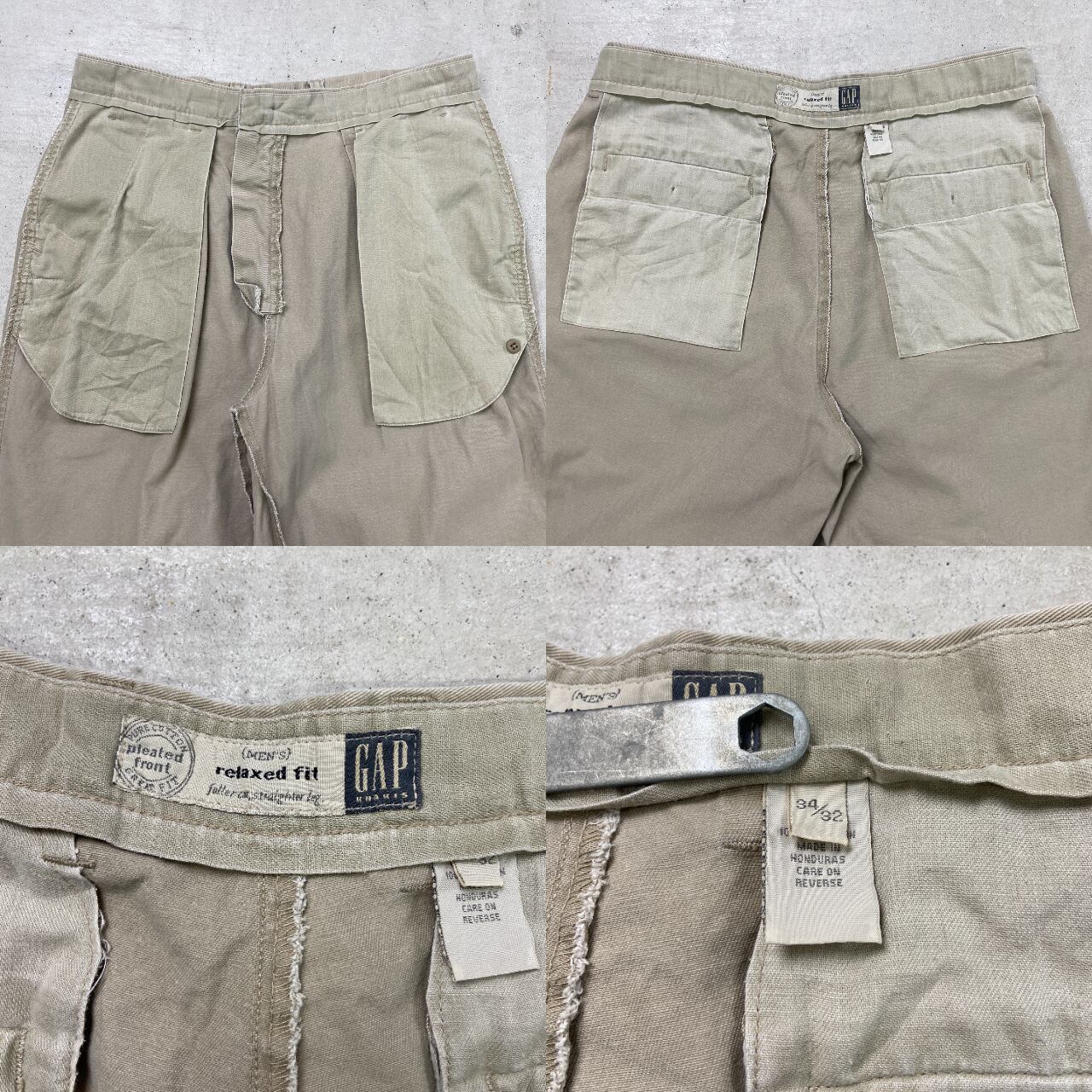 ■GAP ギャップ 2タック チノパンツ relaxed fit メンズW34 古着 アメカジ カーキ サンドベージュ 【チノパンツ,コットンパンツ】/ベージュ 【ブランド】GAP 【サイズ】表記 34/32 ※計測値をご確認ください。 ウエスト(平置き×2)…84 ワタリ幅…33 股上…32.5 股下…76 裾幅…21.5 【生産国】ホンジュラス製 【素材】コットン100% 【状態】ウエスト付近に小穴、裾付近や腿付近などに汚れが御座います。 また全体的に色あせや擦れが御座います。 画像にてご確認ください。 【c240919068】 ※古着は洗濯、検品などのケアを行っております。(新品・デッドストックは洗濯していません。) ※モニターの発色により実物と異なる場合がございます。予めご了承ください。 ※ 海外直輸入USED品になります。