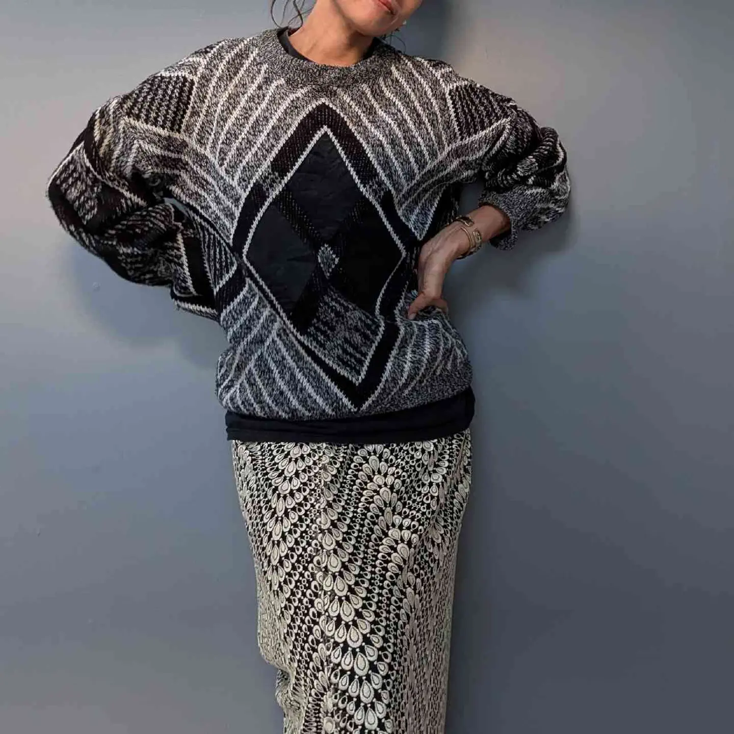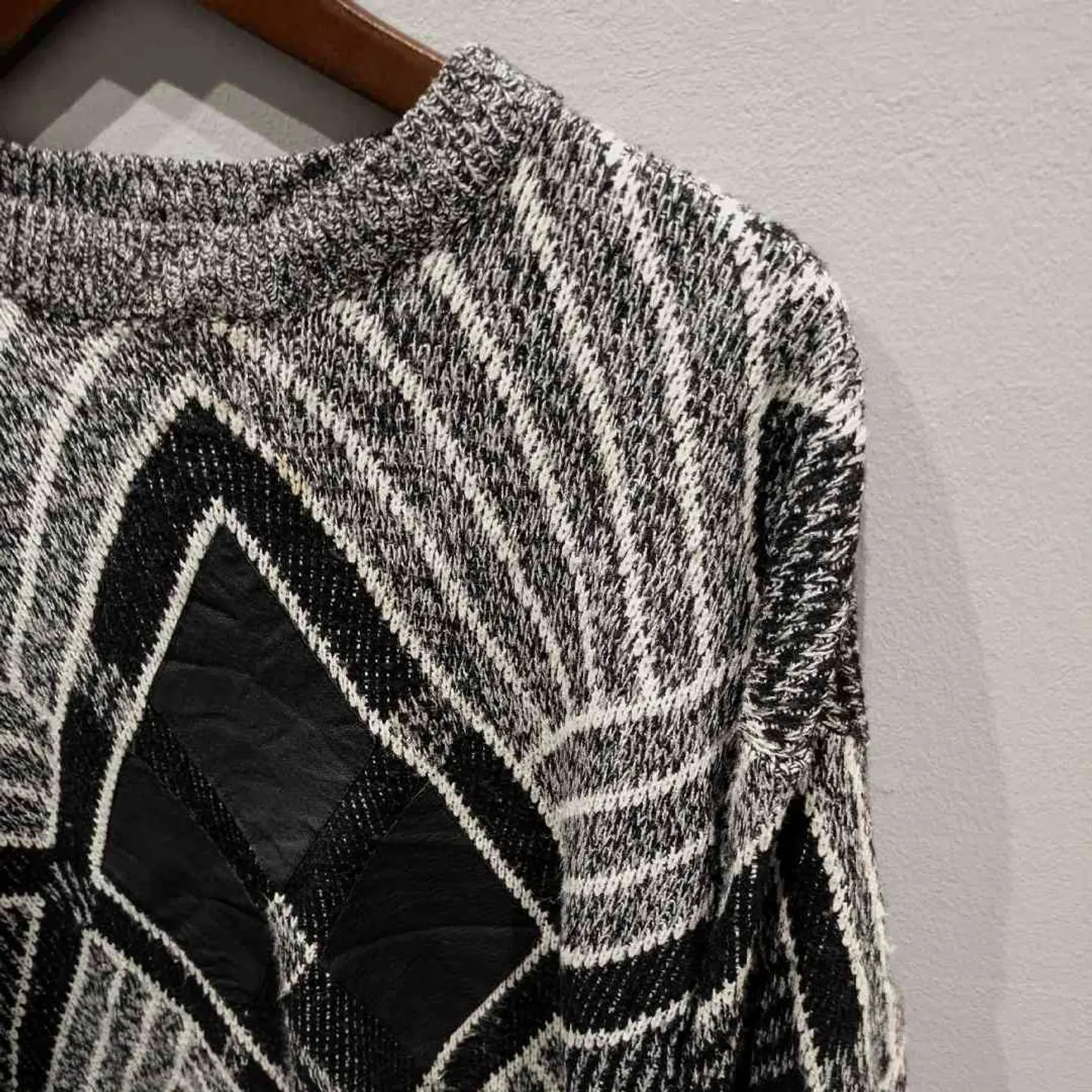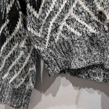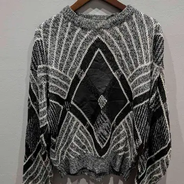 フロントのレザー×ニット切り替えや、 洗練されたモノトーンデザインが素敵なニットプルオーバー。 シンプルな中にエッジの効いたデザインが光り、デニムやスカートなど、どんなボトムスとも相性が良く、リラックスしたシルエットはユニセックスで楽しめます。 モデル身長/160cm 【素材】ニット部分: アクリル100% レザー部分: 牛革 【Size】着丈/70cm、身幅/60cm、裄丈/86cm 【コメント】 やや使用感はあるものの、特に目立つダメージはありません。こちらは1点物となりますので、気になる点がございましたらお気軽にお問い合わせください。基本的に返品交換はおこなっておりません。 #vintage #knitcode #モノトーンコーデ