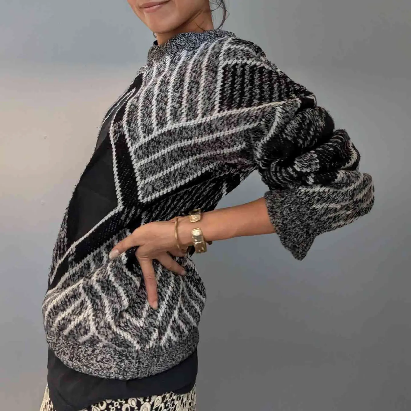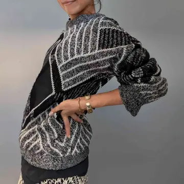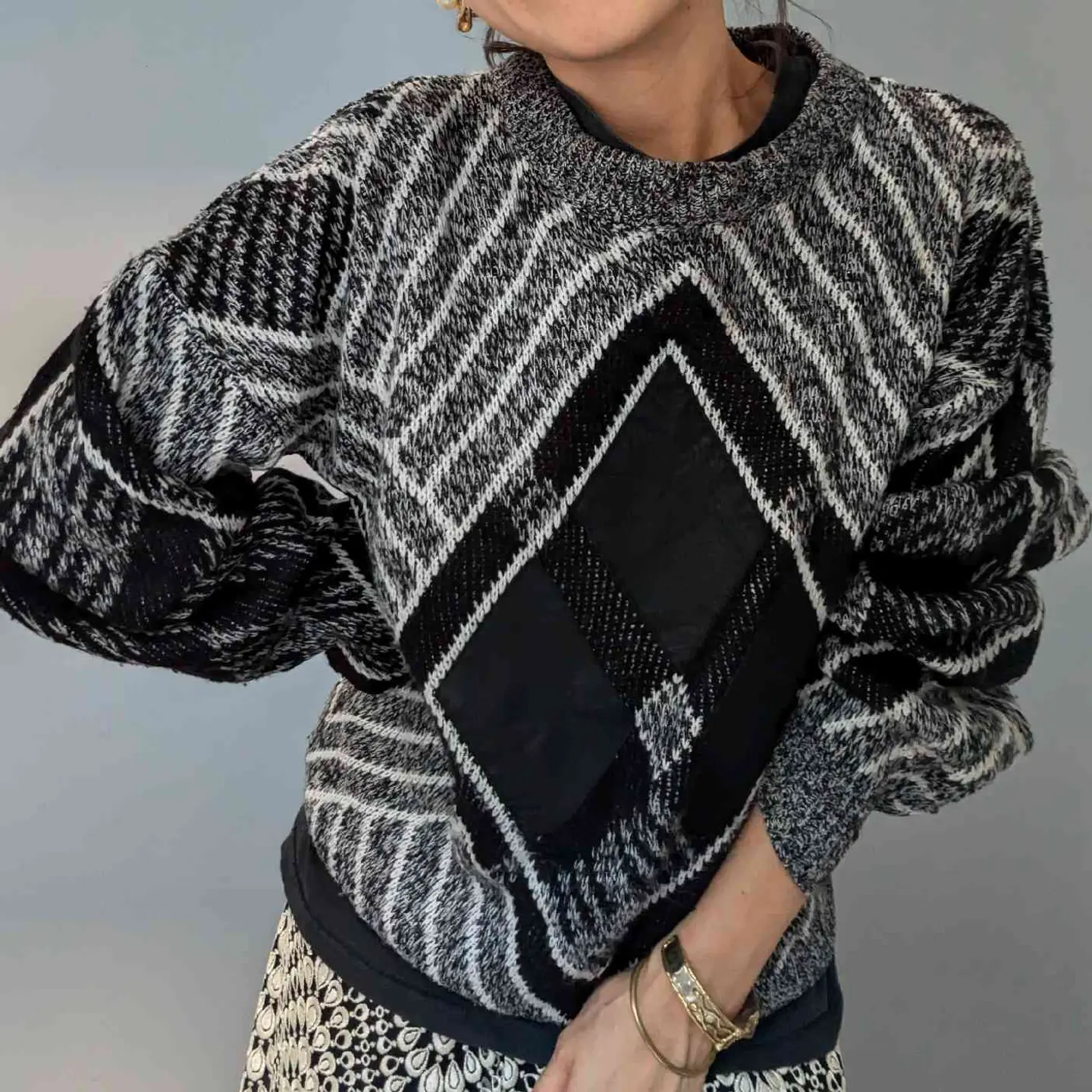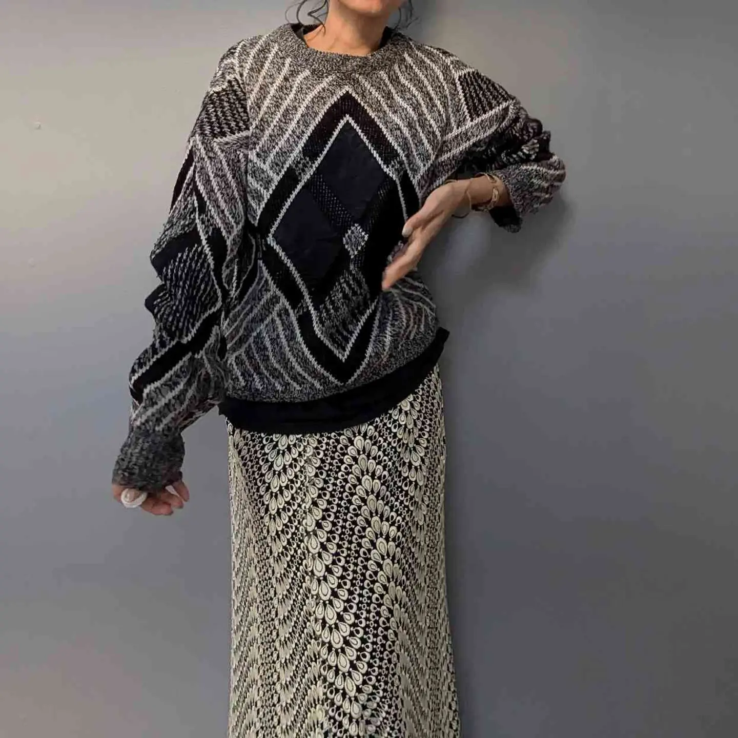 フロントのレザー×ニット切り替えや、 洗練されたモノトーンデザインが素敵なニットプルオーバー。 シンプルな中にエッジの効いたデザインが光り、デニムやスカートなど、どんなボトムスとも相性が良く、リラックスしたシルエットはユニセックスで楽しめます。 モデル身長/160cm 【素材】ニット部分: アクリル100% レザー部分: 牛革 【Size】着丈/70cm、身幅/60cm、裄丈/86cm 【コメント】 やや使用感はあるものの、特に目立つダメージはありません。こちらは1点物となりますので、気になる点がございましたらお気軽にお問い合わせください。基本的に返品交換はおこなっておりません。 #vintage #knitcode #モノトーンコーデ