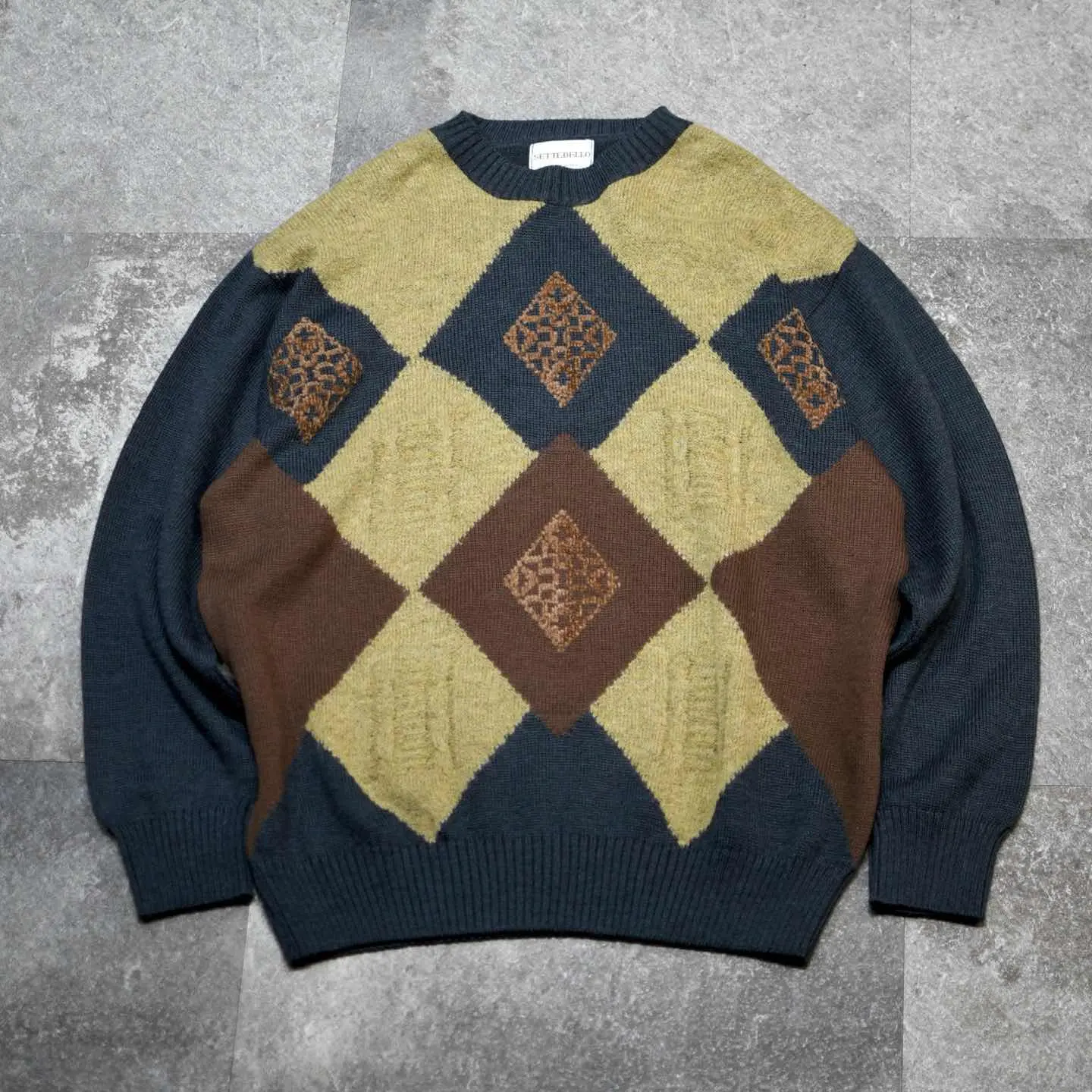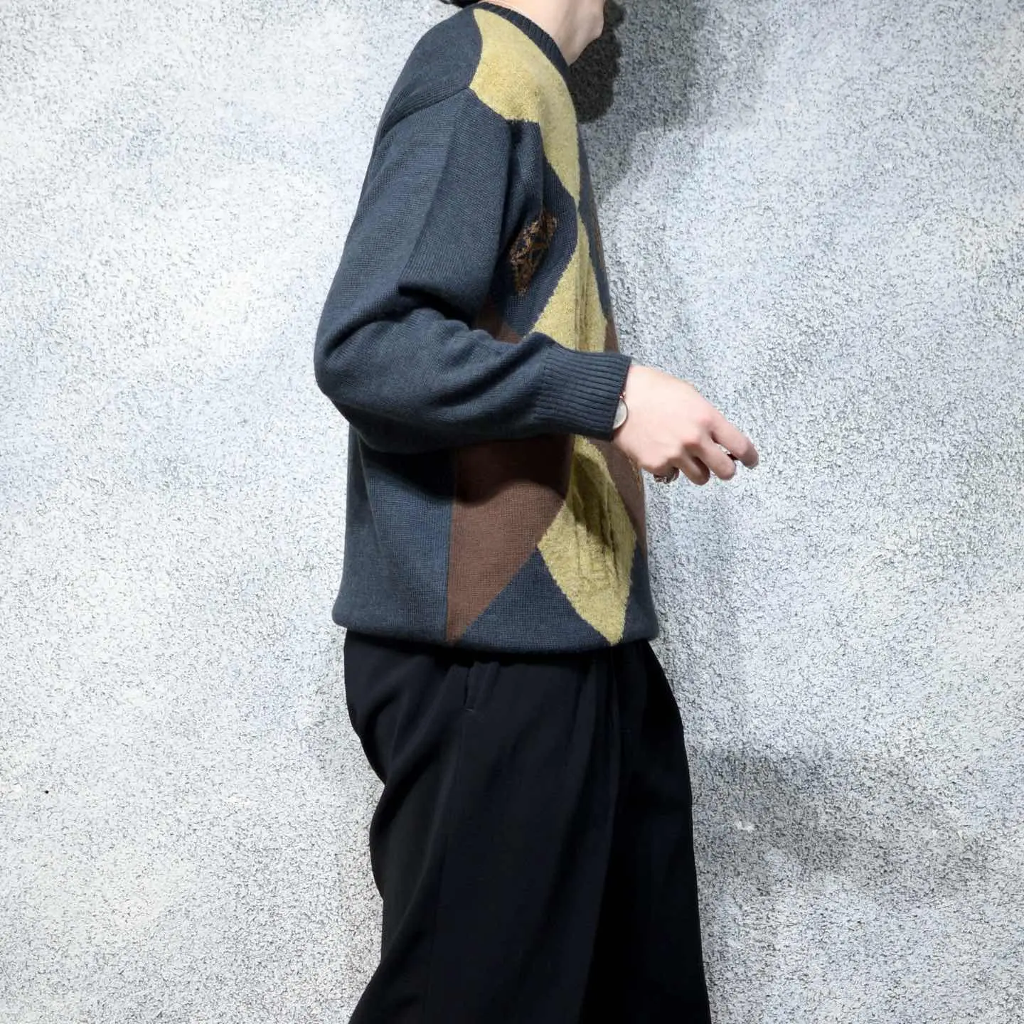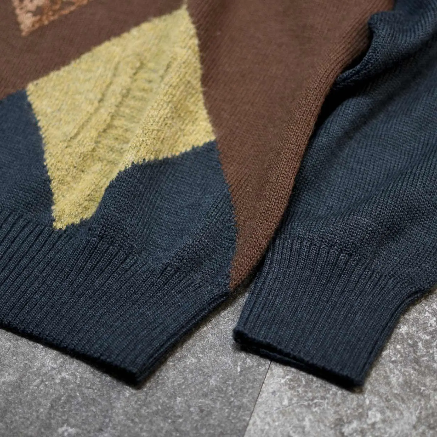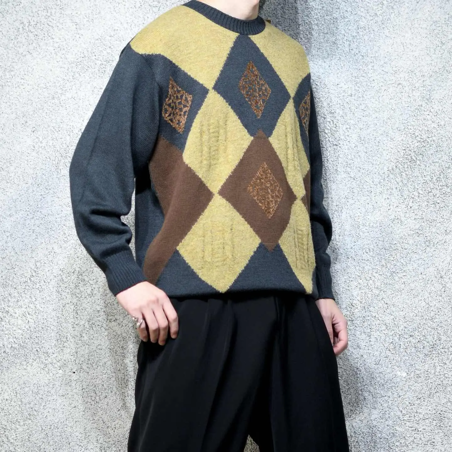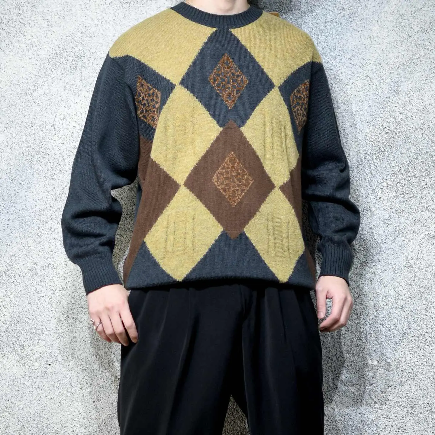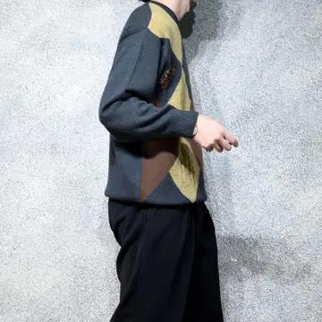 着丈69cm 肩幅56cm 身幅63cm 袖丈61cm fabric/virgin wool・acrylic made in italy 着用画像 177cm/64kg ウールとアクリルの2種類の素材で仕立てられた デザインニット。 アーガイルの中の中心は、ふわっとした アクリル生地で、他と差をつけたデザイン。 なんだか"一部だけ"ってところにも惹かれますし アースカラーとブラックカラーの組み合わせにも 惹かれた1着です。 1枚で個性を出すようなスタイリングから、 コートやヘビーアウターの中に、 ひっそりと忍ばせる可愛いニットとしても おすすめです。 ※撮影状況により、実物と多少色が異なる場合が ございます。 ※古着を取り扱っているため、気づかない汚れや ほつれ等がある場合がございます。 予めご了承ください。 ※サイズは着用感で選んでおり、表記サイズではございません。 古着 オーバーサイズ old vintage ヴィンテージ used 80's 90's アメリカ古着 ユーロ古着 メンズ レディース POLO RALPH LAUREN Eddie Bauer OLD GAP Eddie Bauer LANDS' END ランズエンド LLBean エルエルビーン オールドギャップ エディーバウアー ラルフローレン ブルックスブラザーズ Brooks Brothers ブラウン ベージュ 茶色 ブラック 黒 ニット セーター などがお好きな方 #vintage #オーバーサイズ #old #used #90s #80s #古着 #ヴィンテージ #アメリカ古着 #ユーロ古着 #古着男子 #古着女子 #LLBean #エルエルビーン #EddieBauer #エディーバウアー #oldgap #オールドギャップ #LANDSEND #ランズエンド #NAUTICA #ノーティカ #ラルフローレン #POLORALPHLAUREN #ブルックスブラザーズ #BrooksBrothers #ニット #セーター #アクリルニット #ウールニット #デザインニット #アーガイル柄