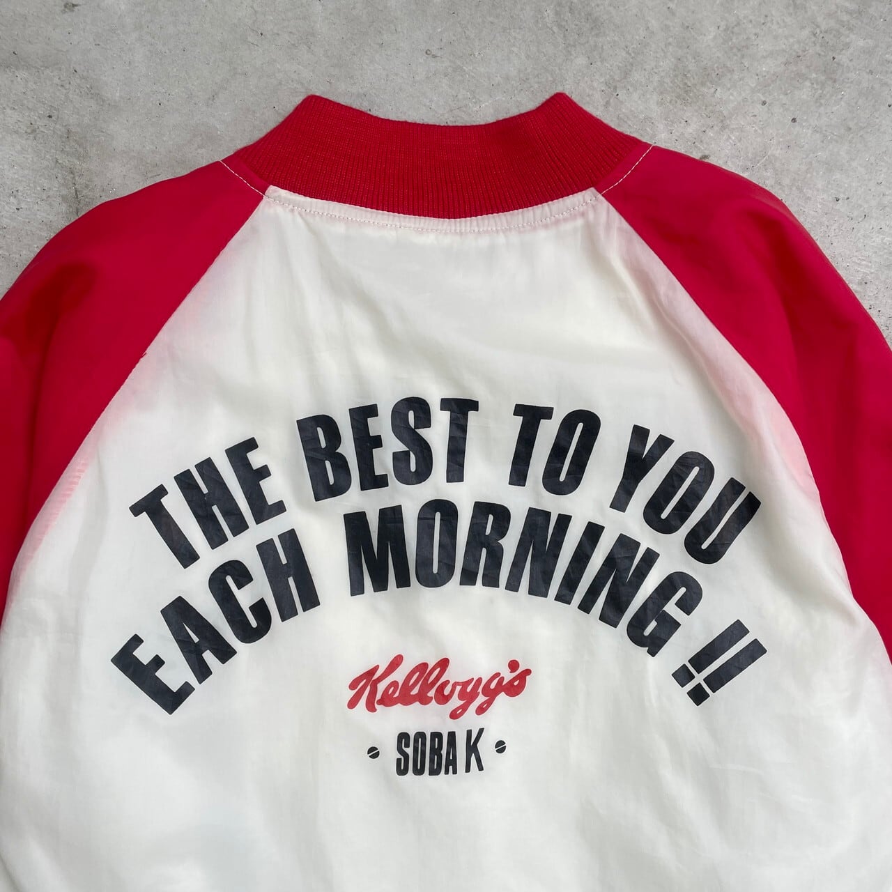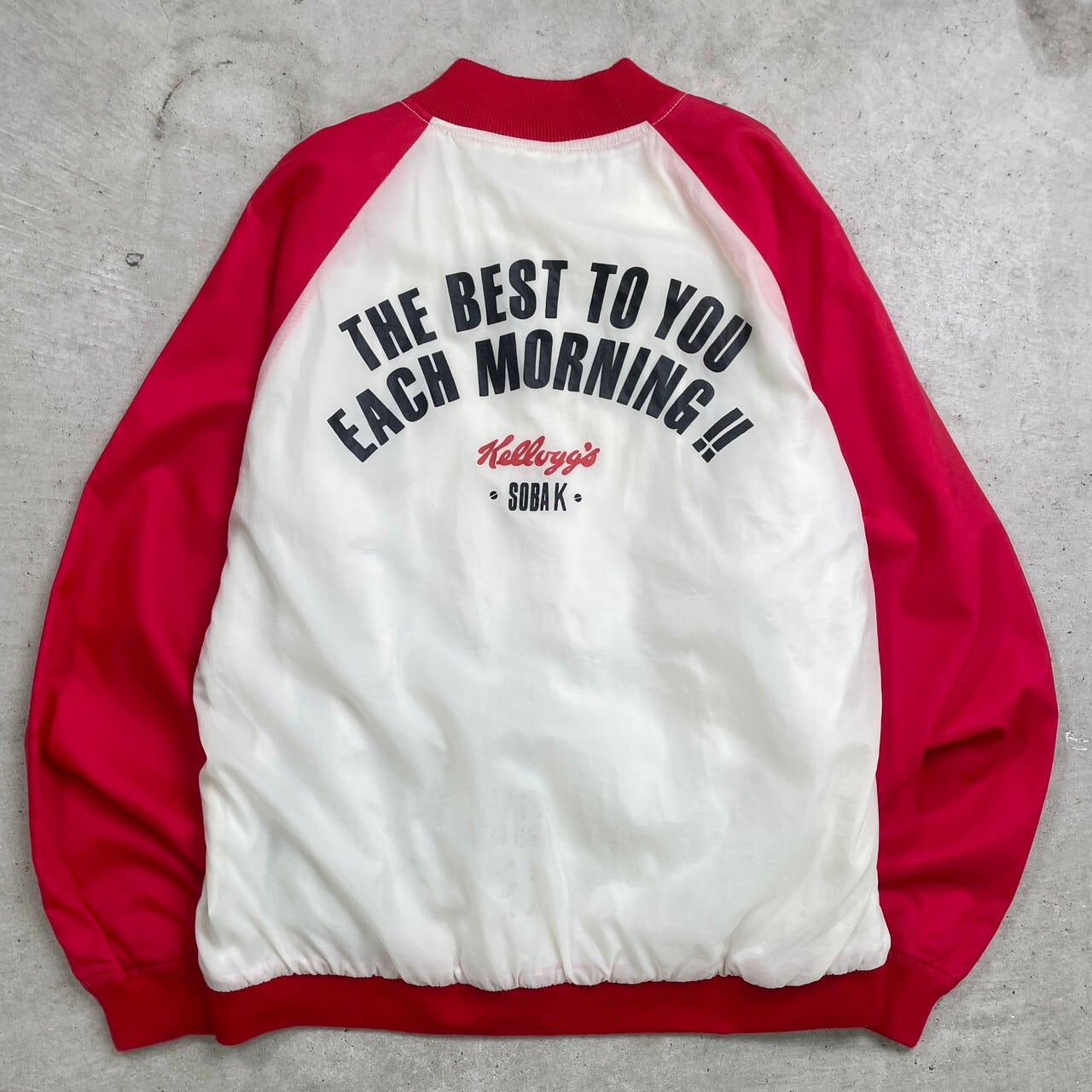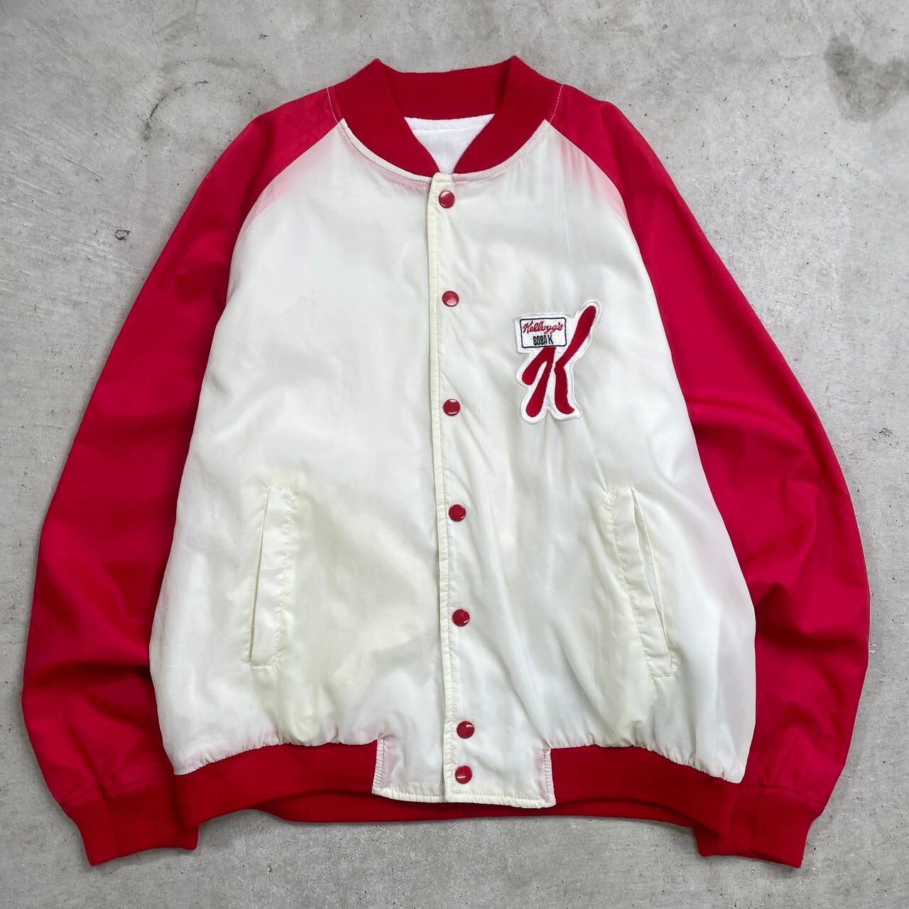 ■ Kellogg's ケロッグ サテンスタジャン 企業ロゴワッペン バックプリントメンズM相当 古着 アメカジ ラグランスリーブ レッド×オフホワイト【ナイロンジャケット】/マルチカラー ◎薄手のナイロン生地のスタジャンです。 【ブランド】 Kellogg's ケロッグ 【サイズ】表記不明(メンズM相当) ※計測値をご確認ください。 着丈…62 身幅…58.5 肩幅…76.5 袖丈…55 【生産国】表記不明 【素材】ナイロン100% 裏地 パイル100% リブ ポリエステル100% 【状態】全体的に使用感による色落ち等ございます。 リブに若干の毛羽立ちがあります。 バックサイド下部にシミ汚れがあります。 画像にてご確認ください。 【c241128228】 ※古着は洗濯、検品などのケアを行っております。(新品・デッドストックは洗濯していません。) ※モニターの発色により実物と異なる場合がございます。予めご了承ください。 ※ 海外直輸入USED品になります。
