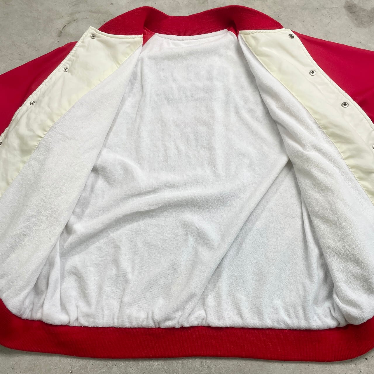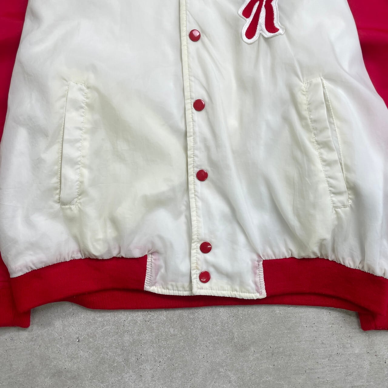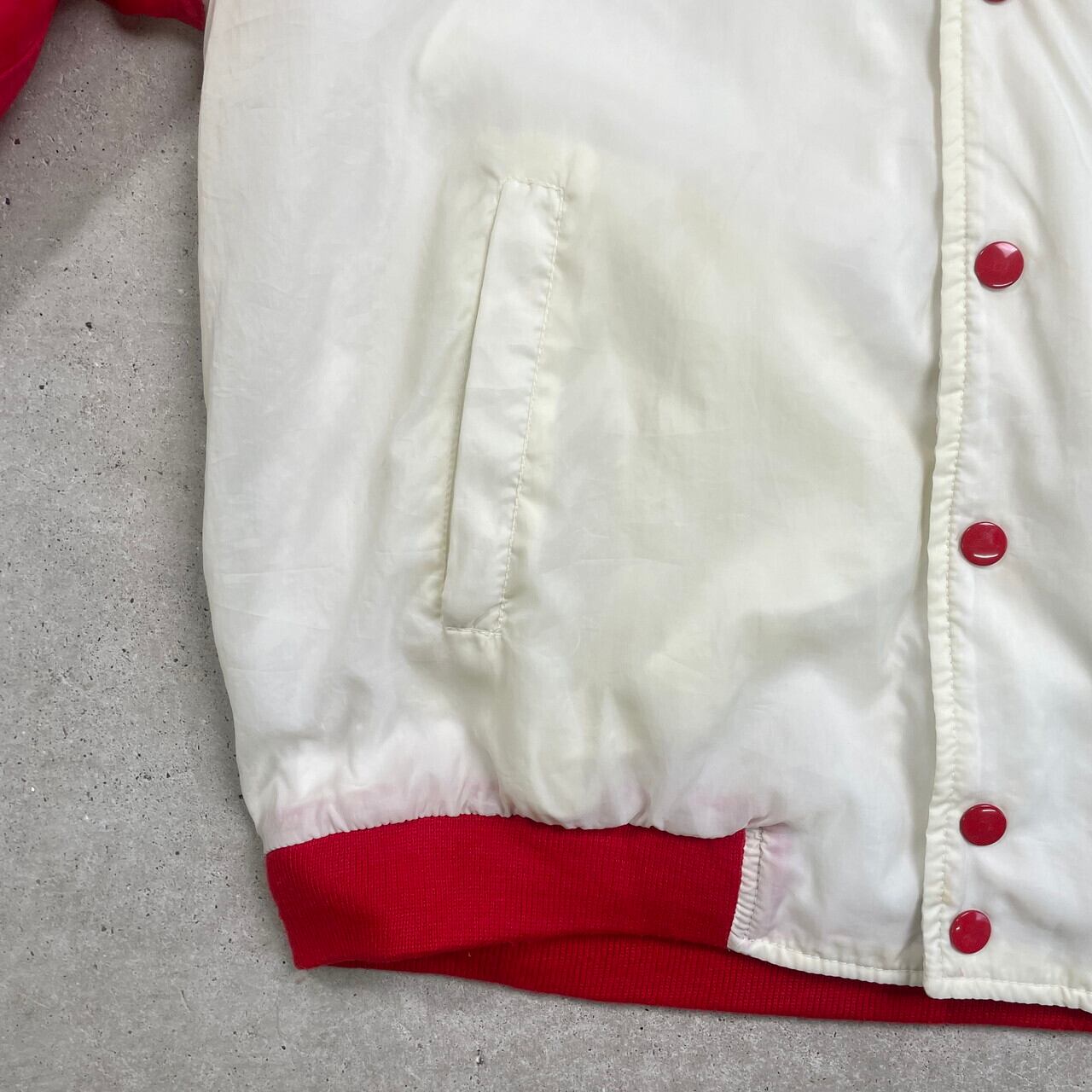 ■ Kellogg's ケロッグ サテンスタジャン 企業ロゴワッペン バックプリントメンズM相当 古着 アメカジ ラグランスリーブ レッド×オフホワイト【ナイロンジャケット】/マルチカラー ◎薄手のナイロン生地のスタジャンです。 【ブランド】 Kellogg's ケロッグ 【サイズ】表記不明(メンズM相当) ※計測値をご確認ください。 着丈…62 身幅…58.5 肩幅…76.5 袖丈…55 【生産国】表記不明 【素材】ナイロン100% 裏地 パイル100% リブ ポリエステル100% 【状態】全体的に使用感による色落ち等ございます。 リブに若干の毛羽立ちがあります。 バックサイド下部にシミ汚れがあります。 画像にてご確認ください。 【c241128228】 ※古着は洗濯、検品などのケアを行っております。(新品・デッドストックは洗濯していません。) ※モニターの発色により実物と異なる場合がございます。予めご了承ください。 ※ 海外直輸入USED品になります。