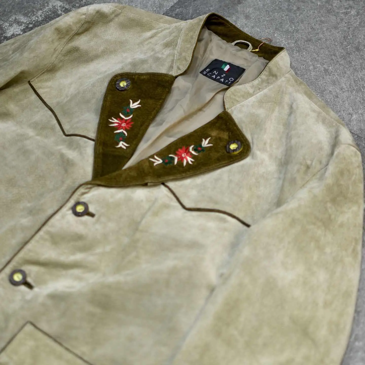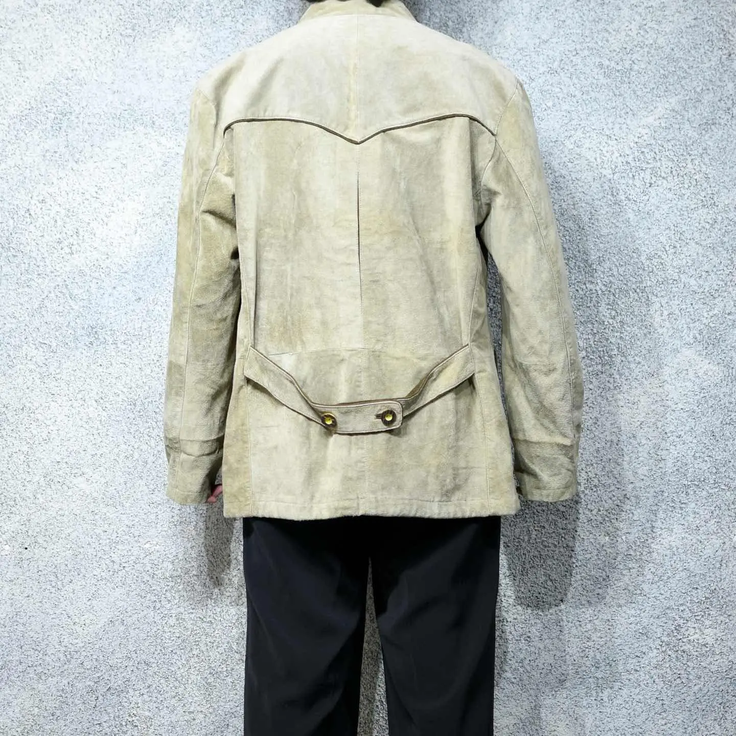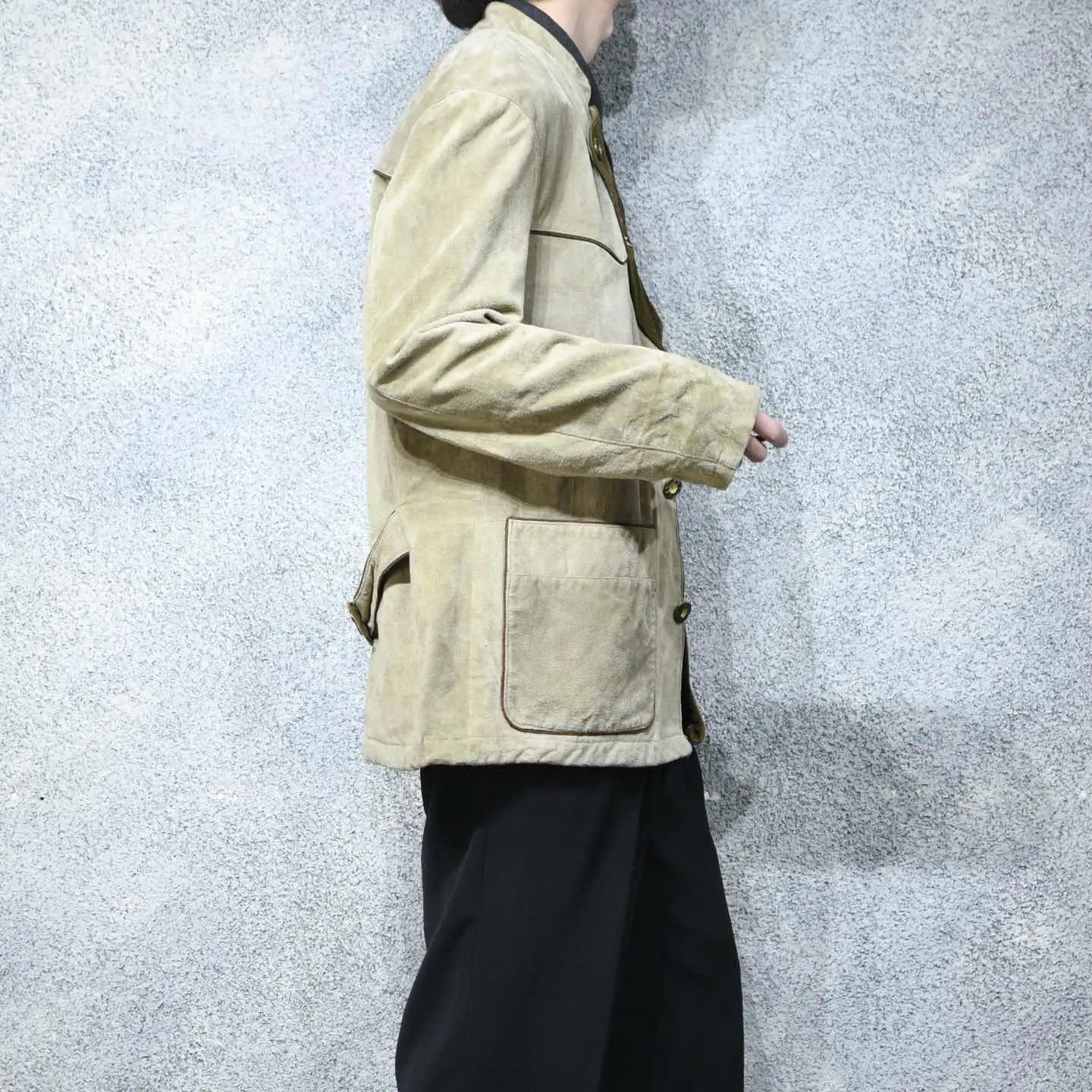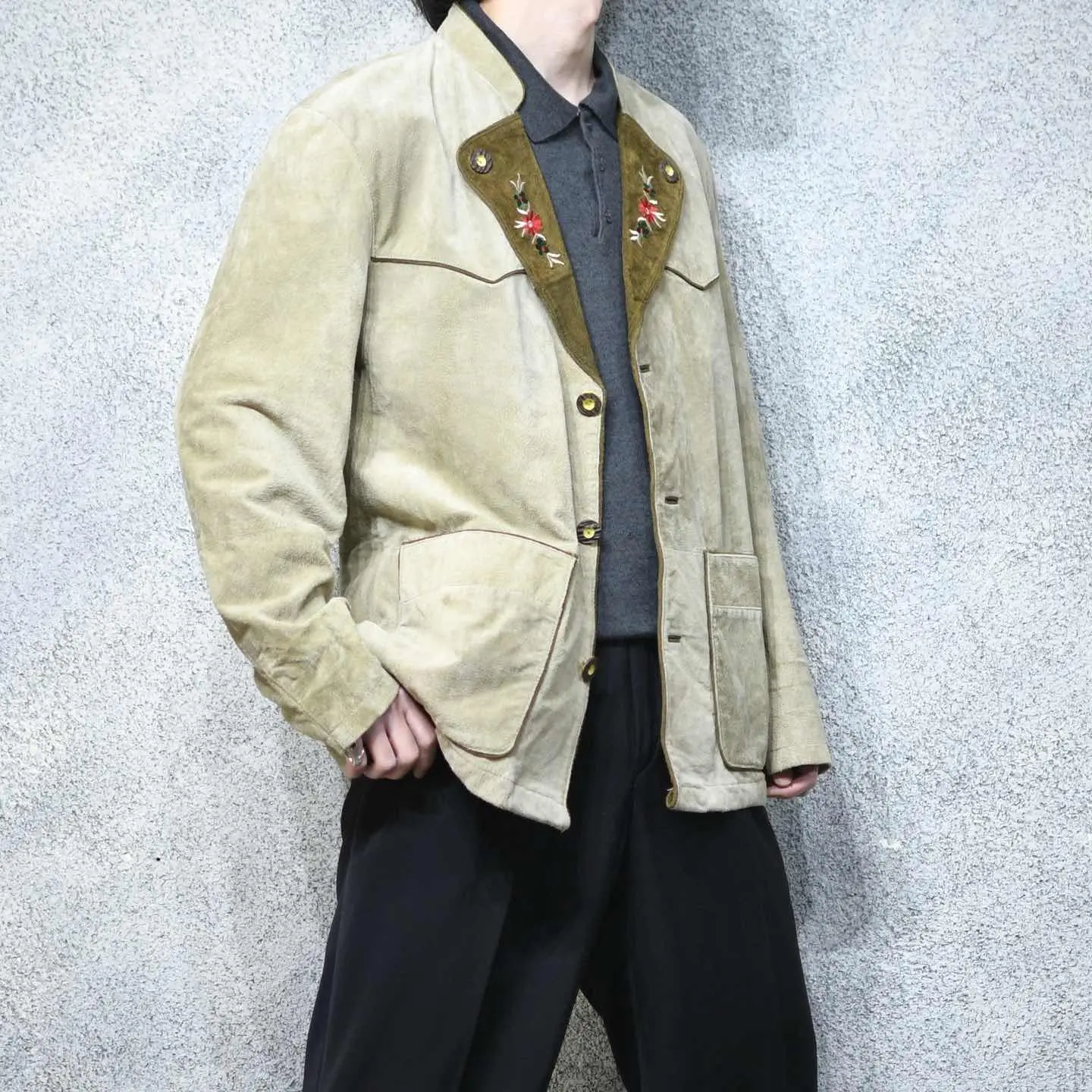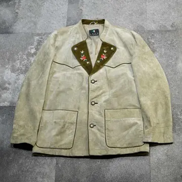 着丈77cm 肩幅53cm 身幅63cm 袖丈66cm fabric/leather 着用画像 177cm/64kg スウェード生地で仕立てられた、チロリアンの テーラードジャケット。 ラペルの刺繍は、チロリアンアイテムらしく テーラードジャケットのかしこまった印象を いい塩梅で中和し、タウンユースなアイテムへと 昇華。 インナーにはシャツだけでなく、ニットなんかを 合わせると、よりかしこまり過ぎずに着れるかと 思います。 いつもより、ほんの少しだけ上品に、大人っぽく。 そんな日に。 ※撮影状況により、実物と多少色が異なる場合が ございます。 ※古着を取り扱っているため、気づかない汚れや ほつれ等がある場合がございます。 予めご了承ください。 ※サイズは着用感で選んでおり、表記サイズではございません。 古着 オーバーサイズ old vintage ヴィンテージ used 80's 90's アメリカ古着 ユーロ古着 メンズ レディース POLO RALPH LAUREN Eddie Bauer OLD GAP Eddie Bauer LANDS' END ランズエンド LLBean エルエルビーン オールドギャップ エディーバウアー ラルフローレン ブルックスブラザーズ Brooks Brothers 生成り ベージュ ジャケット レザージャケット などがお好きな方 #vintage #オーバーサイズ #old #used #90s #80s #古着 #ヴィンテージ #アメリカ古着 #ユーロ古着 #古着男子 #古着女子 #LLBean #エルエルビーン #EddieBauer #エディーバウアー #oldgap #オールドギャップ #LANDSEND #ランズエンド #NAUTICA #ノーティカ #ラルフローレン #POLORALPHLAUREN #ブルックスブラザーズ #BrooksBrothers #レザージャケット #テーラードジャケット #ジャケット #チロリアンジャケット