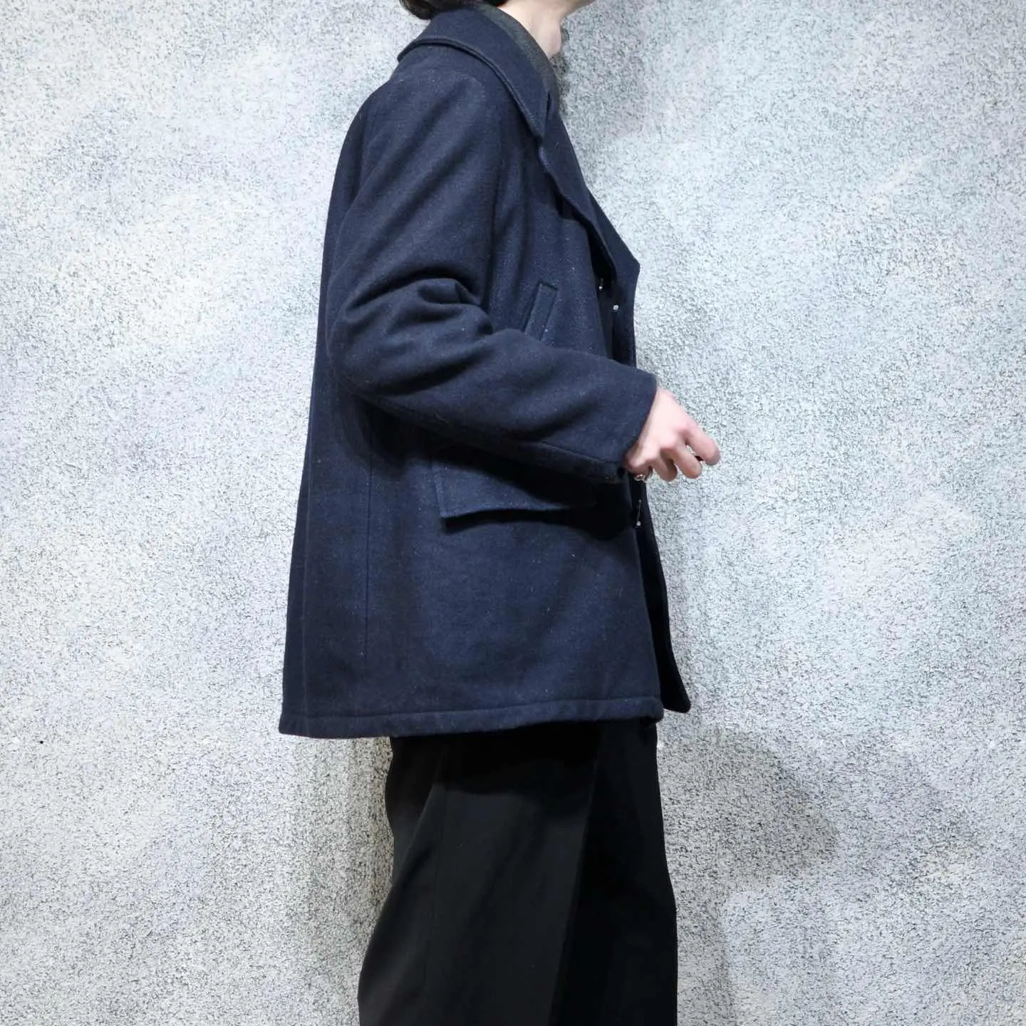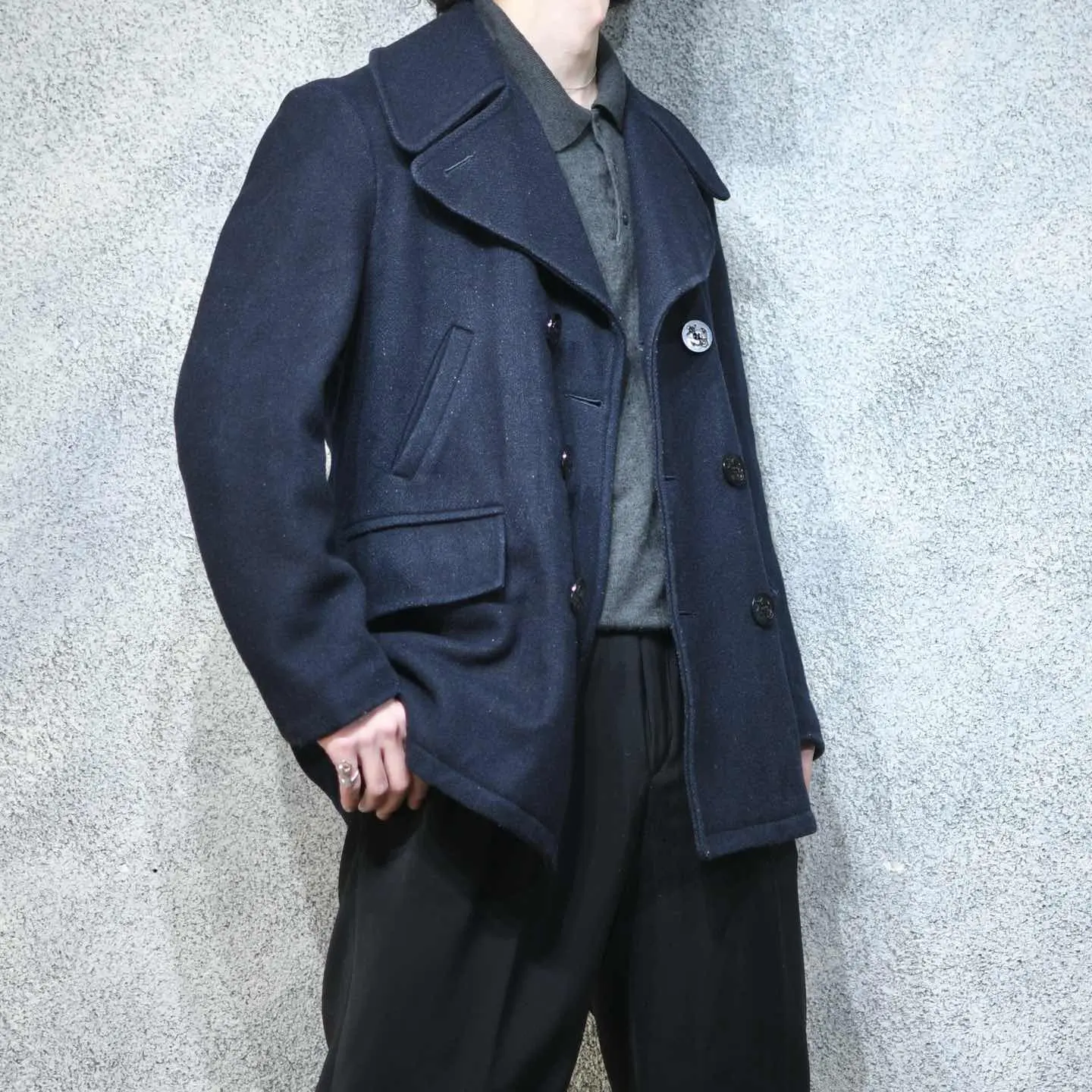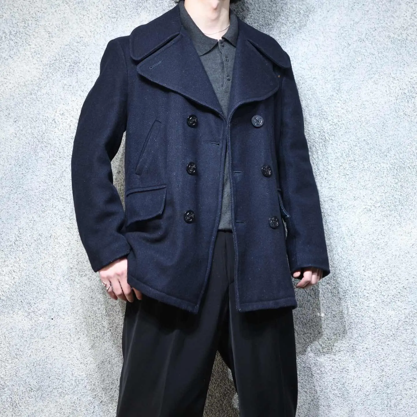 着丈83cm 肩幅48cm 身幅59cm 袖丈62cm fabric/wool 着用画像 177cm/64kg こちらはカナダで仕立てられたPコート。 ハンドウォーマーポケットに、フラップポケット。 このディテールは、アメリカ海軍などで採用された オリジナルのPコートには無いディテールかと 思っていましたが、1910年代などより古いの個体の ディテールとして取り入れられていた様です。 オリジナルよりも大振りな襟が魅力的で、 目の詰まったウール生地、ユニオンチケットが 付いているのも◎ 古着という大きな枠を越えて、ファッションの枠の 中でも名の知れたPコート。 こんな古着らしい雰囲気のある1着を、 手元に置いてみてはどうでしょう。 ※裏地に破れあり。 ※撮影状況により、実物と多少色が異なる場合が ございます。 ※古着を取り扱っているため、気づかない汚れや ほつれ等がある場合がございます。 予めご了承ください。 ※サイズは着用感で選んでおり、表記サイズではございません。 古着 オーバーサイズ old vintage ヴィンテージ used 80's 90's アメリカ古着 ユーロ古着 メンズ レディース POLO RALPH LAUREN Eddie Bauer OLD GAP Eddie Bauer LANDS' END ランズエンド LLBean エルエルビーン オールドギャップ エディーバウアー ラルフローレン ブルックスブラザーズ Brooks Brothers ネイビー 紺色 コート ピーコート ジャケット ユニオンチケット などがお好きな方 #vintage #オーバーサイズ #old #used #90s #80s #古着 #ヴィンテージ #アメリカ古着 #ユーロ古着 #古着男子 #古着女子 #LLBean #エルエルビーン #EddieBauer #エディーバウアー #oldgap #オールドギャップ #LANDSEND #ランズエンド #NAUTICA #ノーティカ #ラルフローレン #POLORALPHLAUREN #ブルックスブラザーズ #BrooksBrothers #ユニオンチケット #Pコート #ピーコート #ウールジャケット #ウールコート #ジャケット #コート #70s