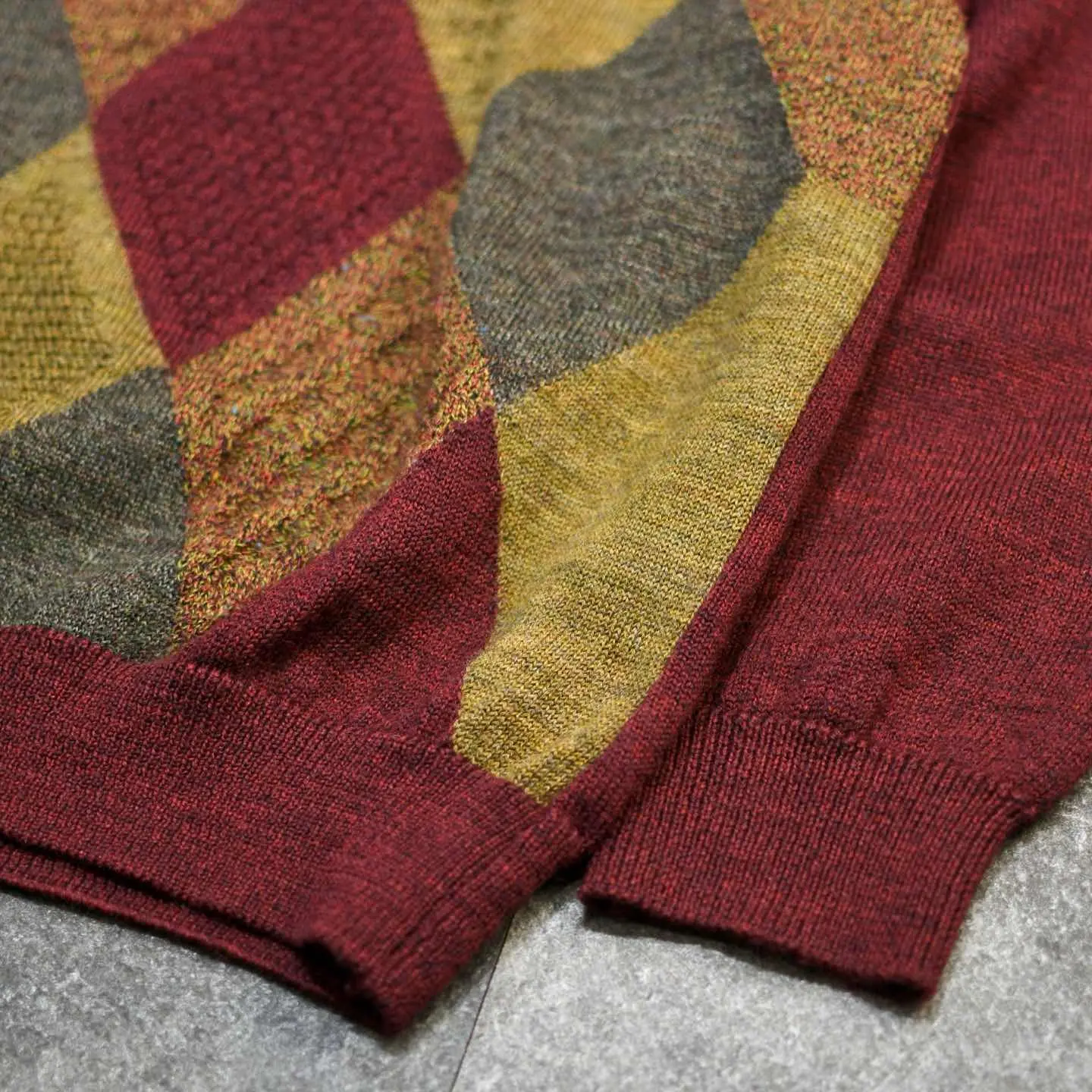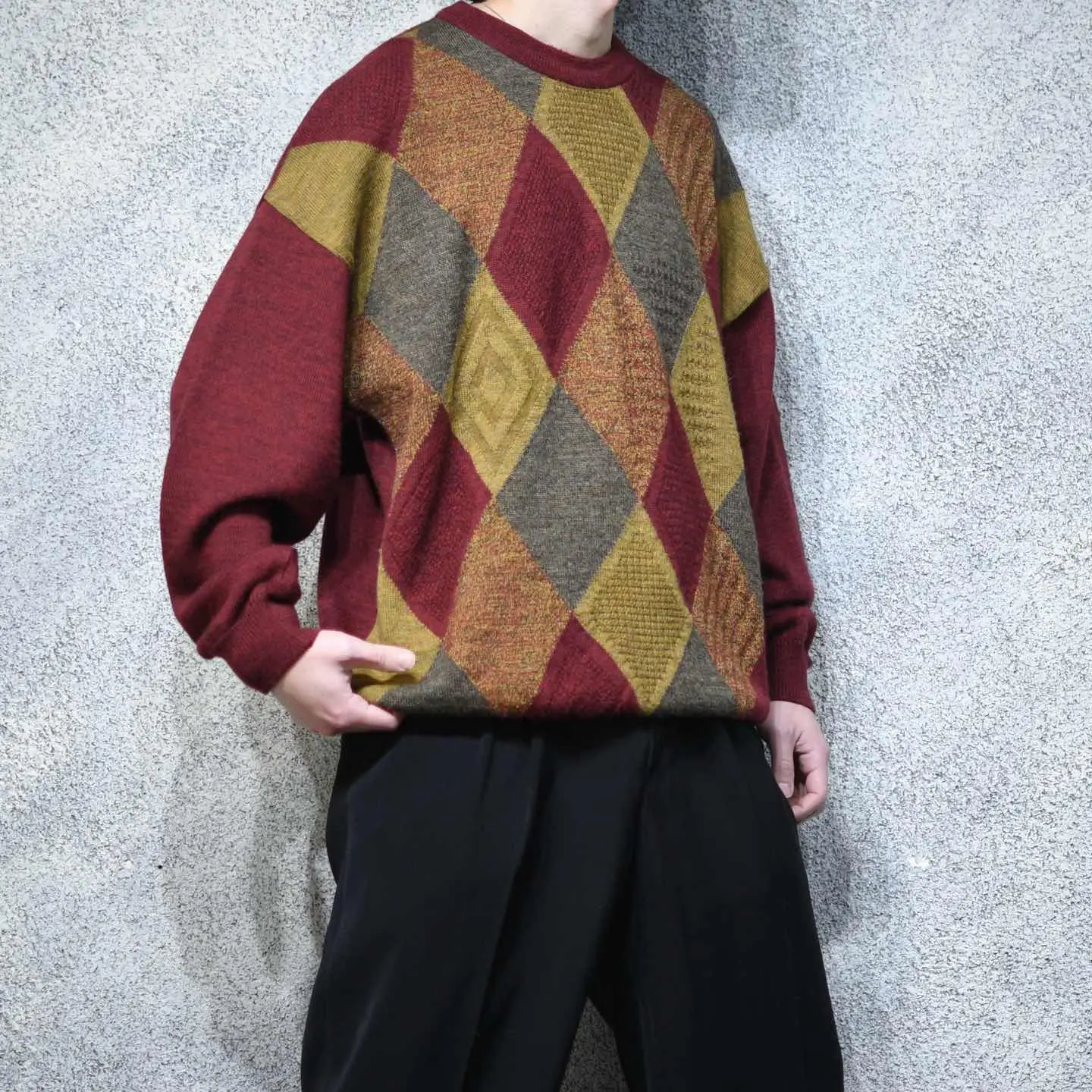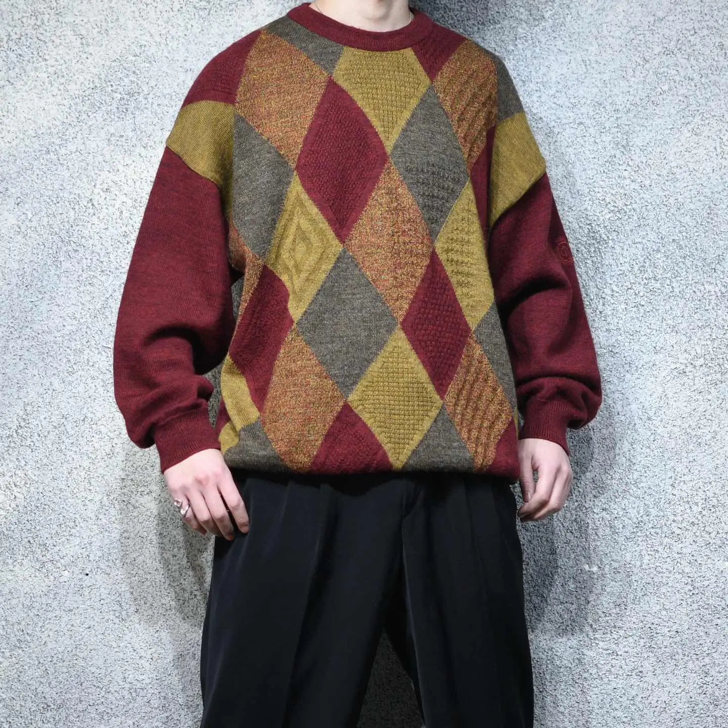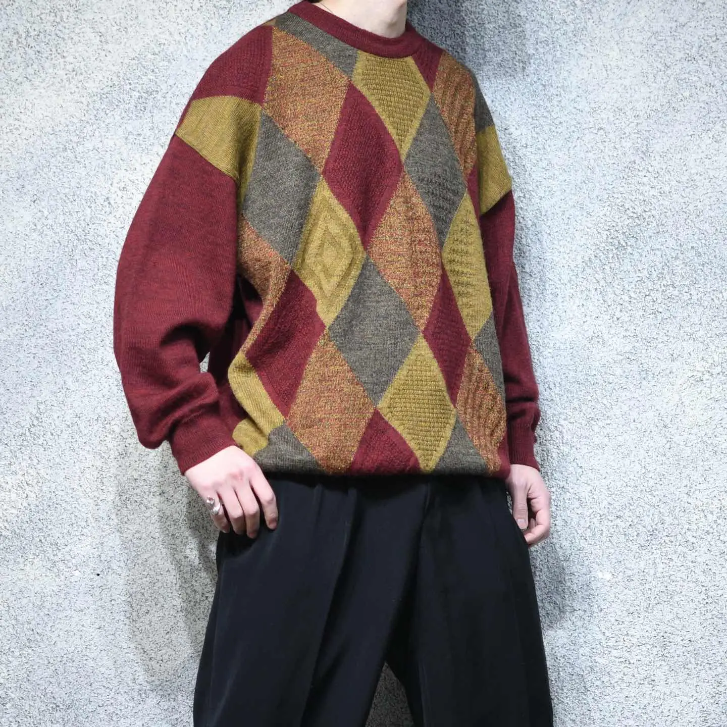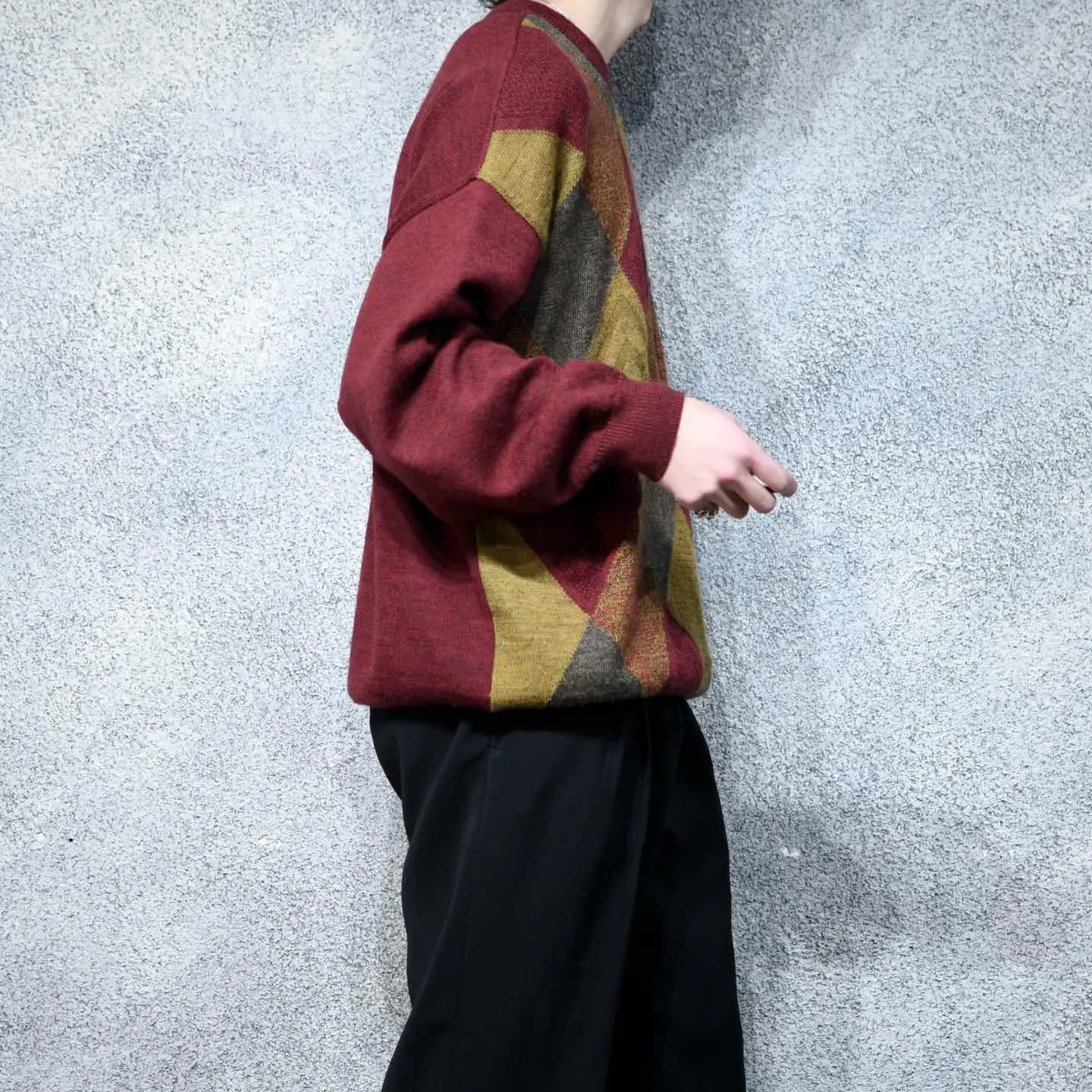 着丈73cm 肩幅71cm 身幅70cm 袖丈57cm fabric/質感よりacryl・wool 着用画像 177cm/64kg ニットの中でも数多く存在する、アーガイル柄の ニットですが、なかでもクオリティの高い逸品。 というのも、アーガイル柄の中にもうひとつ 幾何学模様が施されていたり、 編み方を変えていたり、さらにこの暖色の中に 水色のネップが入るという、塩梅の良い個性が 詰まったアイテム。 アースカラーのパンツと合わせたり、シンプルに 黒のスラックスなんかと合わせたいニットです。 ※撮影状況により、実物と多少色が異なる場合が ございます。 ※古着を取り扱っているため、気づかない汚れや ほつれ等がある場合がございます。 予めご了承ください。 ※サイズは着用感で選んでおり、表記サイズではございません。 古着 オーバーサイズ old vintage ヴィンテージ used 80's 90's アメリカ古着 ユーロ古着 メンズ レディース POLO RALPH LAUREN Eddie Bauer OLD GAP Eddie Bauer LANDS' END ランズエンド LLBean エルエルビーン オールドギャップ エディーバウアー ラルフローレン ブルックスブラザーズ Brooks Brothers ワインレッド バーガンディ 赤 レッド アクリルニット ウールニット などがお好きな方 #vintage #オーバーサイズ #old #used #90s #80s #古着 #ヴィンテージ #アメリカ古着 #ユーロ古着 #古着男子 #古着女子 #LLBean #エルエルビーン #EddieBauer #エディーバウアー #oldgap #オールドギャップ #LANDSEND #ランズエンド #NAUTICA #ノーティカ #ラルフローレン #POLORALPHLAUREN #ブルックスブラザーズ #BrooksBrothers #アーガイル柄 #ニット #セーター #デザインニット #アクリルニット #ウールニット