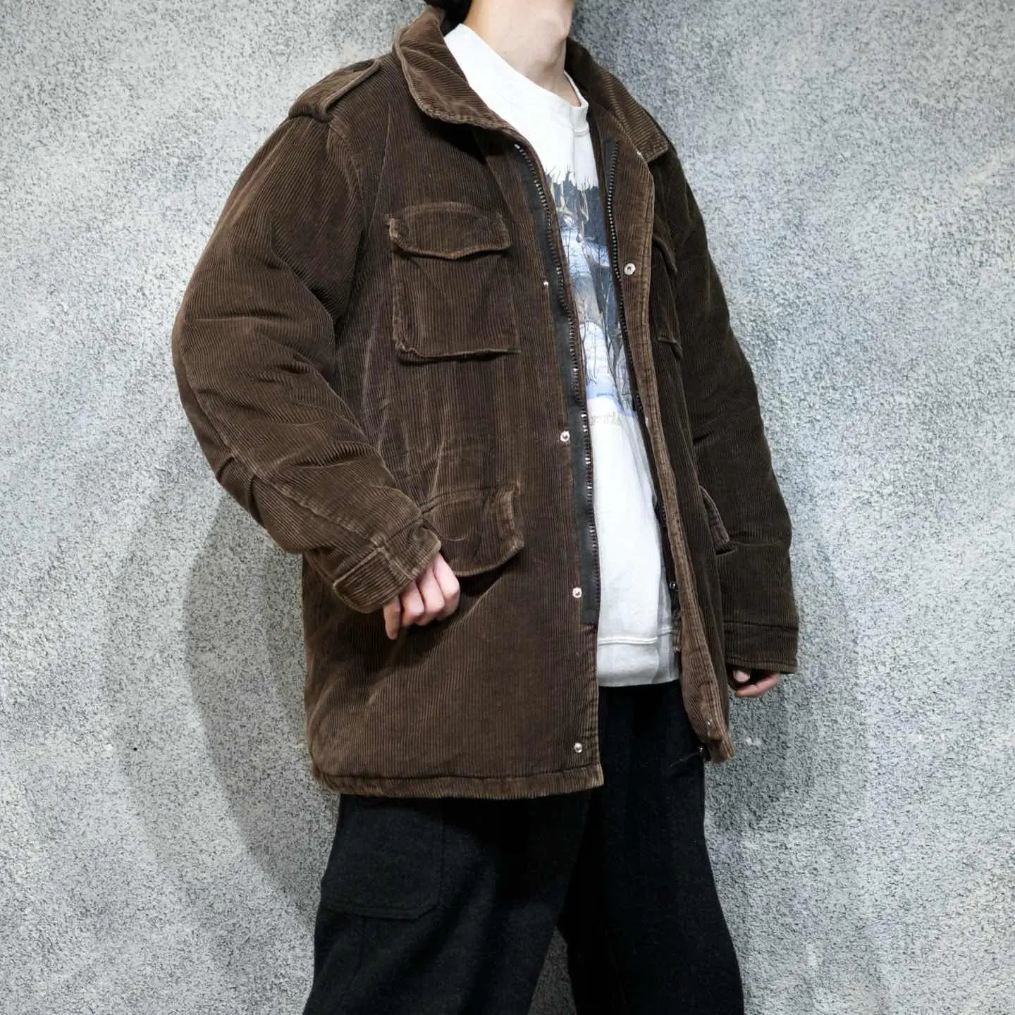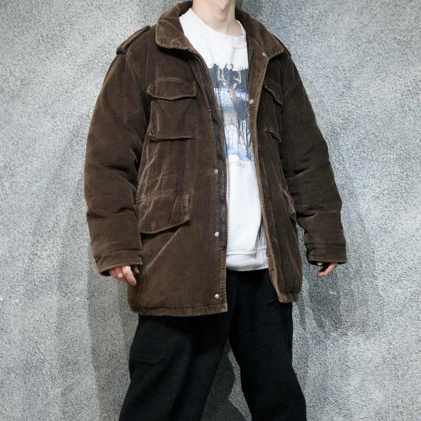 着丈86cm 肩幅54cm 身幅70cm 袖丈63cm fabric/cotton 着用画像 177cm/64kg コーデュロイでダウン。それだけで初見ですし スペシャルですが、こちらはアメリカ軍、 m65ジャケットを模したデザイン。 ドローコードの付く場所も、本体と同じで なおかつポケットの形まで。 65ジャケットの無骨さを、シルエットと コーデュロイの生地で中和し、タウンユースに 染めた逸品。 心躍る古着として。 ※右胸ポケットスナップボタン破損。 ※撮影状況により、実物と多少色が異なる場合が ございます。 ※古着を取り扱っているため、気づかない汚れや ほつれ等がある場合がございます。 予めご了承ください。 ※サイズは着用感で選んでおり、表記サイズではございません。 古着 オーバーサイズ old vintage ヴィンテージ used 80's 90's アメリカ古着 ユーロ古着 メンズ レディース POLO RALPH LAUREN Eddie Bauer OLD GAP Eddie Bauer LANDS' END ランズエンド LLBean エルエルビーン オールドギャップ エディーバウアー ラルフローレン ブルックスブラザーズ Brooks Brothers 茶色 ミリタリー アメリカ軍 usarmy フィールドジャケット イタリア軍 イギリス軍 フランス軍 スウェーデン軍 チェコ軍 ジャケット ダウン などがお好きな方 #vintage #オーバーサイズ #old #used #90s #80s #古着 #ヴィンテージ #アメリカ古着 #ユーロ古着 #古着男子 #古着女子 #LLBean #エルエルビーン #EddieBauer #エディーバウアー #oldgap #オールドギャップ #LANDSEND #ランズエンド #NAUTICA #ノーティカ #ラルフローレン #POLORALPHLAUREN #ブルックスブラザーズ #BrooksBrothers #usarmy #アメリカ軍 #m65 #フィールドジャケット #ダウン #ダウンジャケット #コーデュロイジャケット