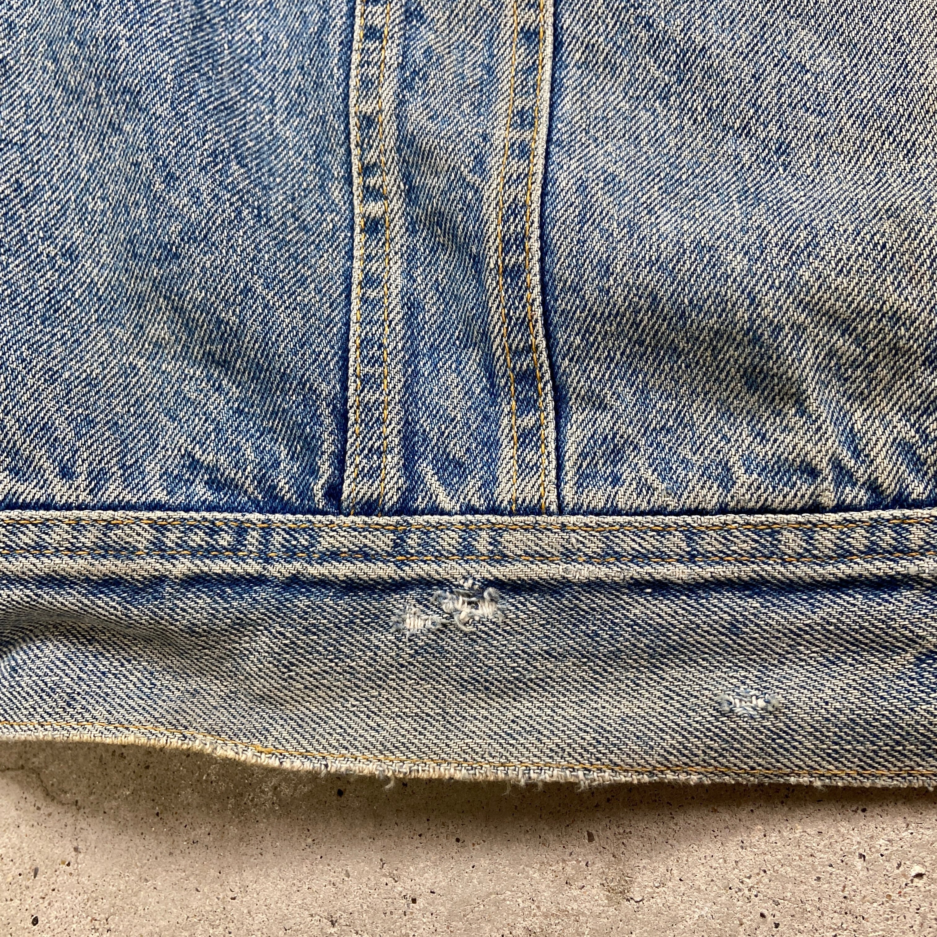 ■カナダ製 80年代 Lee STORM RIDERリー ストームライダー デニムジャケット メンズM相当 古着 ブランケットライナー 80s アメカジ VINTAGE ヴィンテージ【デニムジャケット】/ブルー 【ブランド】Lee リー 【サイズ】表記 不明(メンズM相当) ※計測値をご確認ください。 着丈…60 身幅…63.5 肩幅…51 袖丈…60.5 【素材】コットン100% 【状態】全体的に色落ちや汚れ、ダメージが御座います。また、タタキによるリペアが「施されている部分が御座います。画像にてご確認ください。 【c250114121】 ※古着は洗濯、検品などのケアを行っております。(新品・デッドストックは洗濯していません。) ※モニターの発色により実物と異なる場合がございます。予めご了承ください。 ※ 海外直輸入USED品になります。