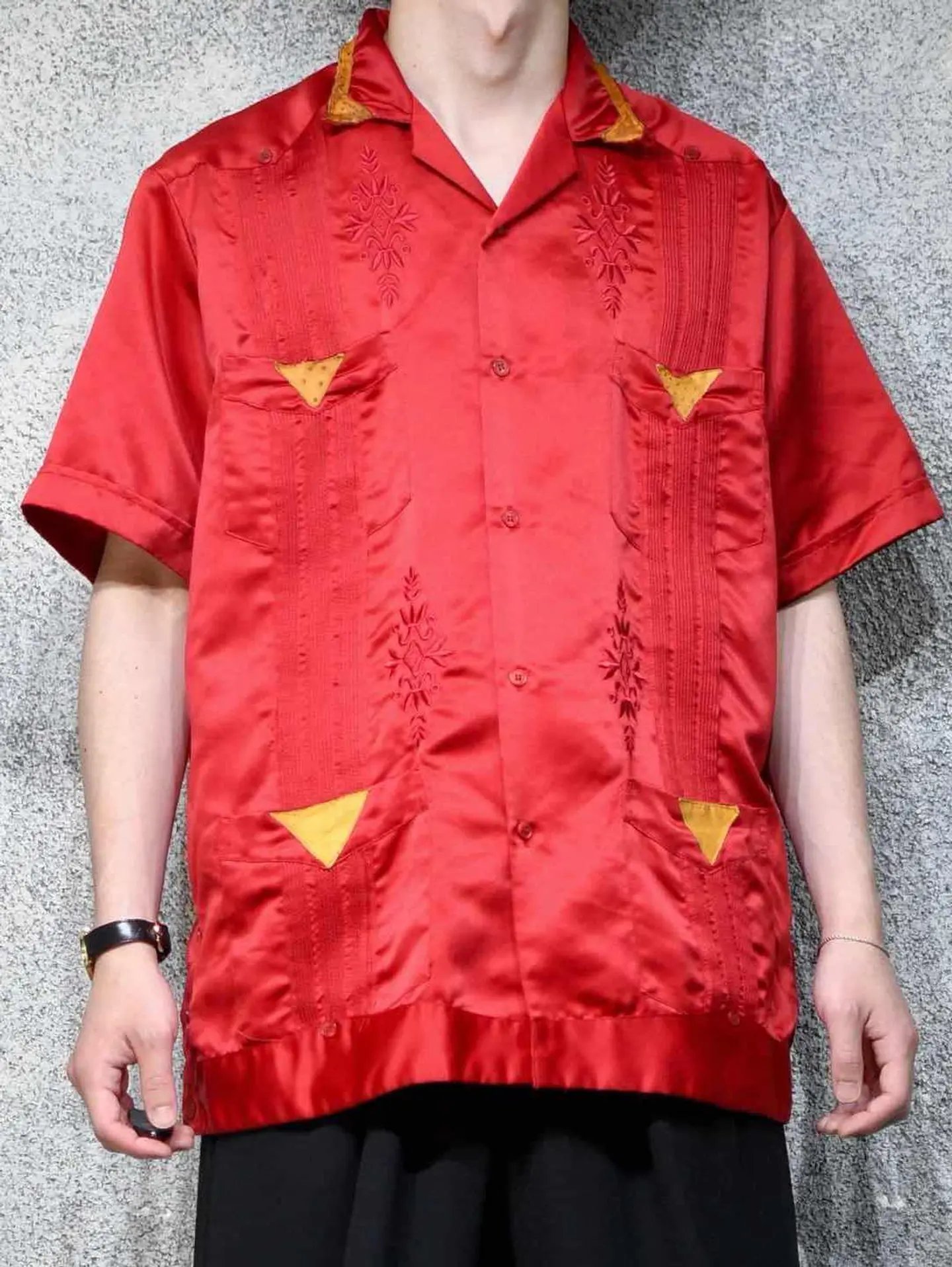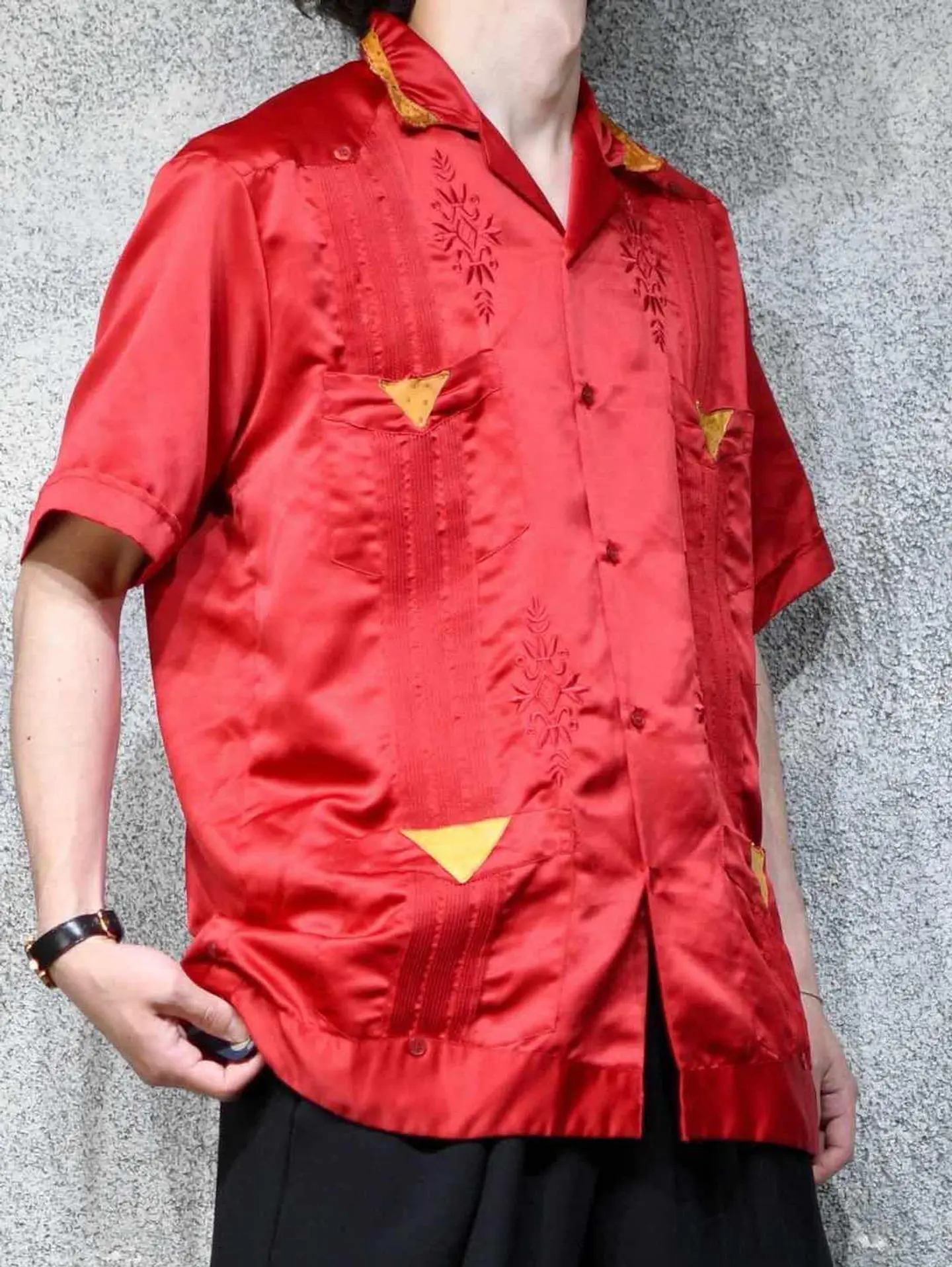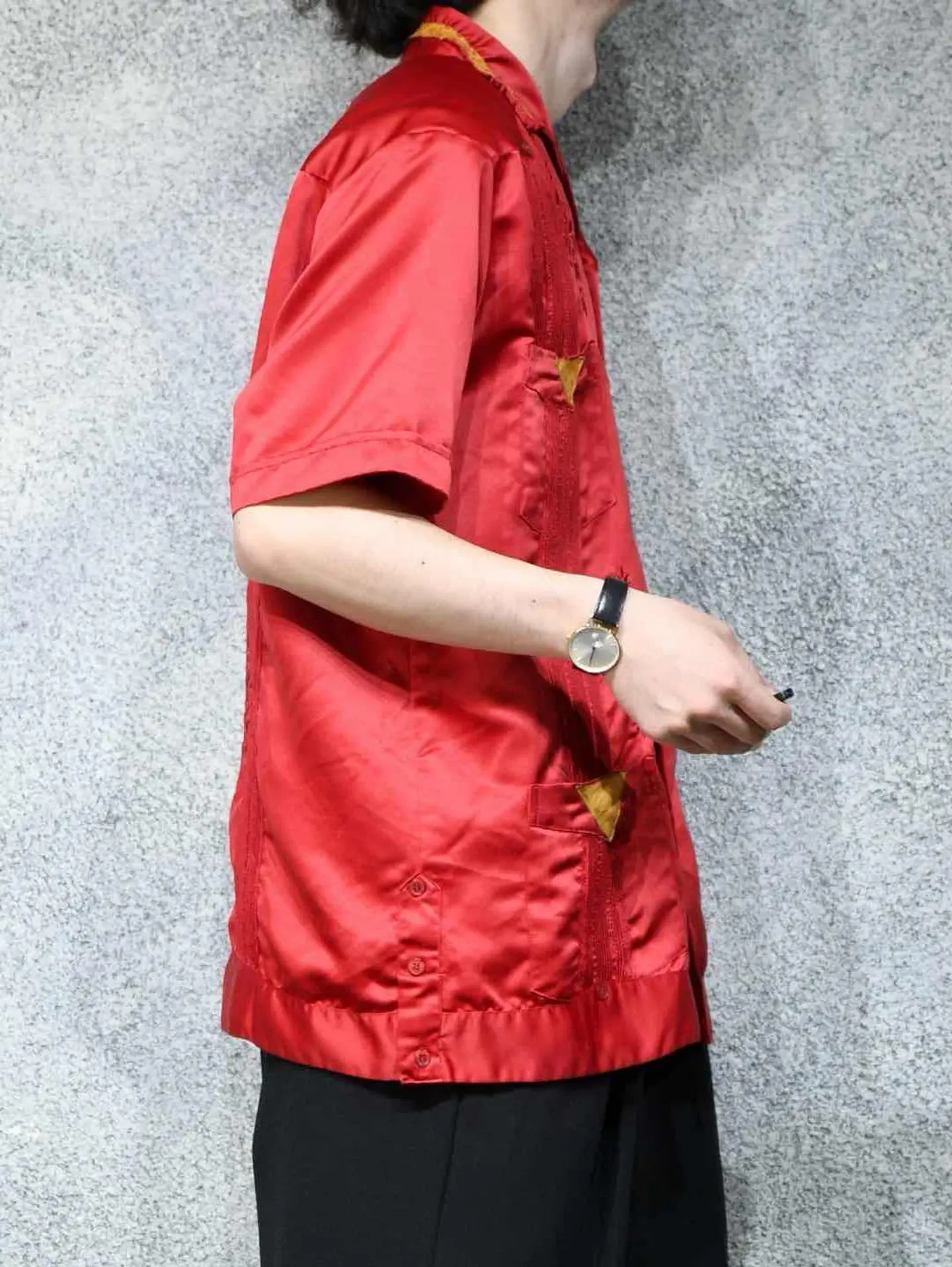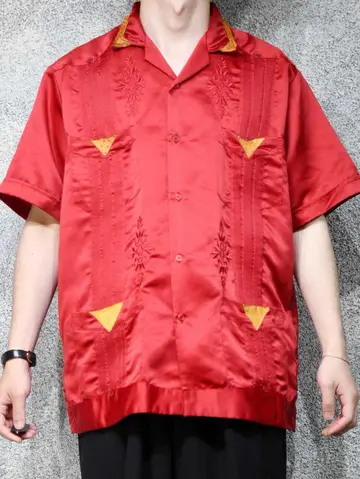 着丈72cm 肩幅52cm 身幅61cm 袖丈25cm fabric/poly 着用画像 177cm/64kg これを着たいと思える人がいるかどうか、 それももちろん大事な事ですが、 純粋に"服"として、"古着"として。 需要があるかどうかだけで判断する価値は なんだか寂しい気がします。 キューバシャツをサテンの生地で表現し、 レザーまであしらわれた、スペシャルな逸品。 "このシャツ面白い"そんな着る着ないだけじゃない 楽しさを伝える用。 ※撮影状況により、実物と多少色が異なる場合があります。 ※古着を取り扱っているため、気づかない汚れやほつれ等がある場合がございます。 予めご了承ください。 ※サイズは着用感で選んでおり、表記サイズではございません。 古着 オーバーサイズ old vintage ヴィンテージ used 80's 90's アメリカ古着 ユーロ古着 メンズ レディース POLO RALPH LAUREN Eddie Bauer OLD GAP Eddie Bauer LANDS' END ランズエンド LLBean エルエルビーン オールドギャップ エディーバウアー ラルフローレン ブルックスブラザーズ Brooks Brothers 赤 レッド 開襟シャツ オープンカラーシャツ デザインシャツ などがお好きな方 #vintage #オーバーサイズ #old #used #90s #80s #古着 #ヴィンテージ #アメリカ古着 #ユーロ古着 #古着男子 #古着女子 #LLBean #エルエルビーン #EddieBauer #エディーバウアー #oldgap #オールドギャップ #LANDSEND #ランズエンド #NAUTICA #ノーティカ #ラルフローレン #POLORALPHLAUREN #ブルックスブラザーズ #BrooksBrothers #キューバシャツ #サテンシャツ #オープンカラーシャツ #半袖シャツ #デザインシャツ