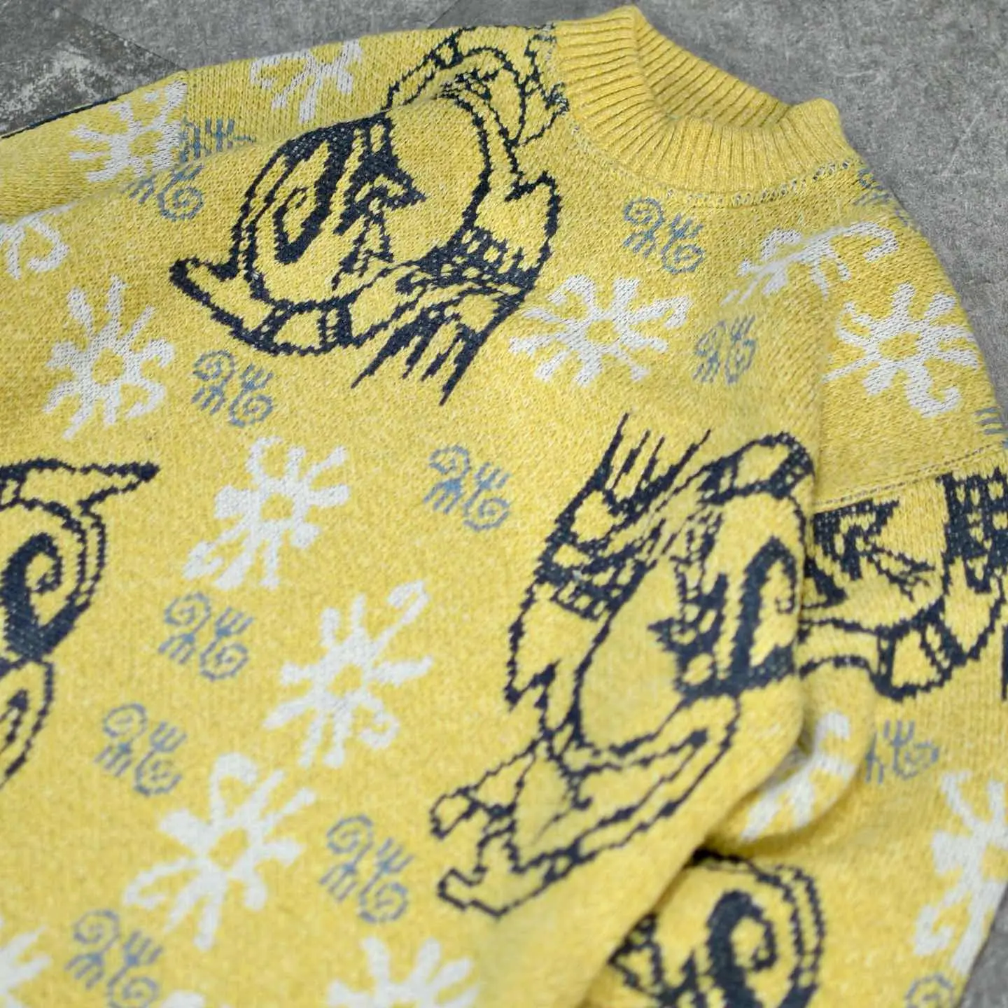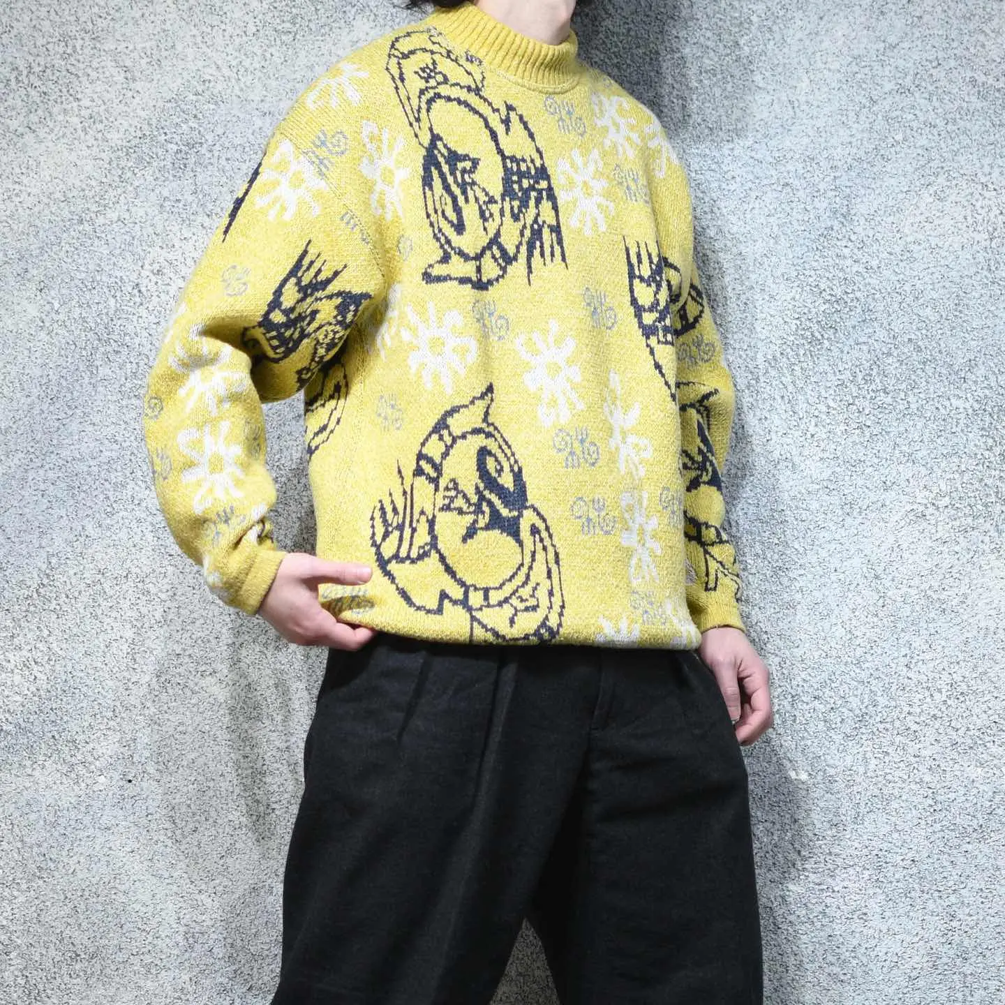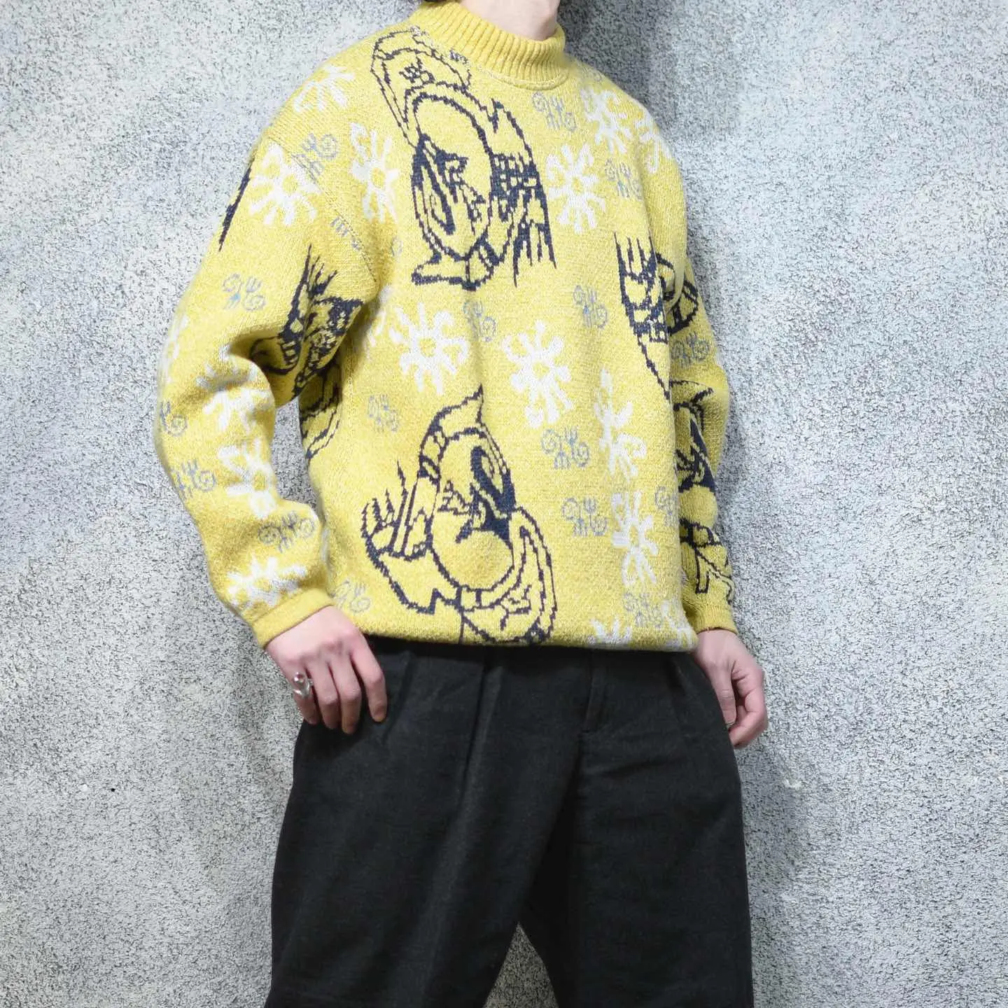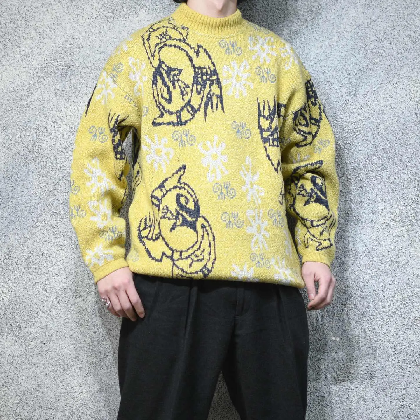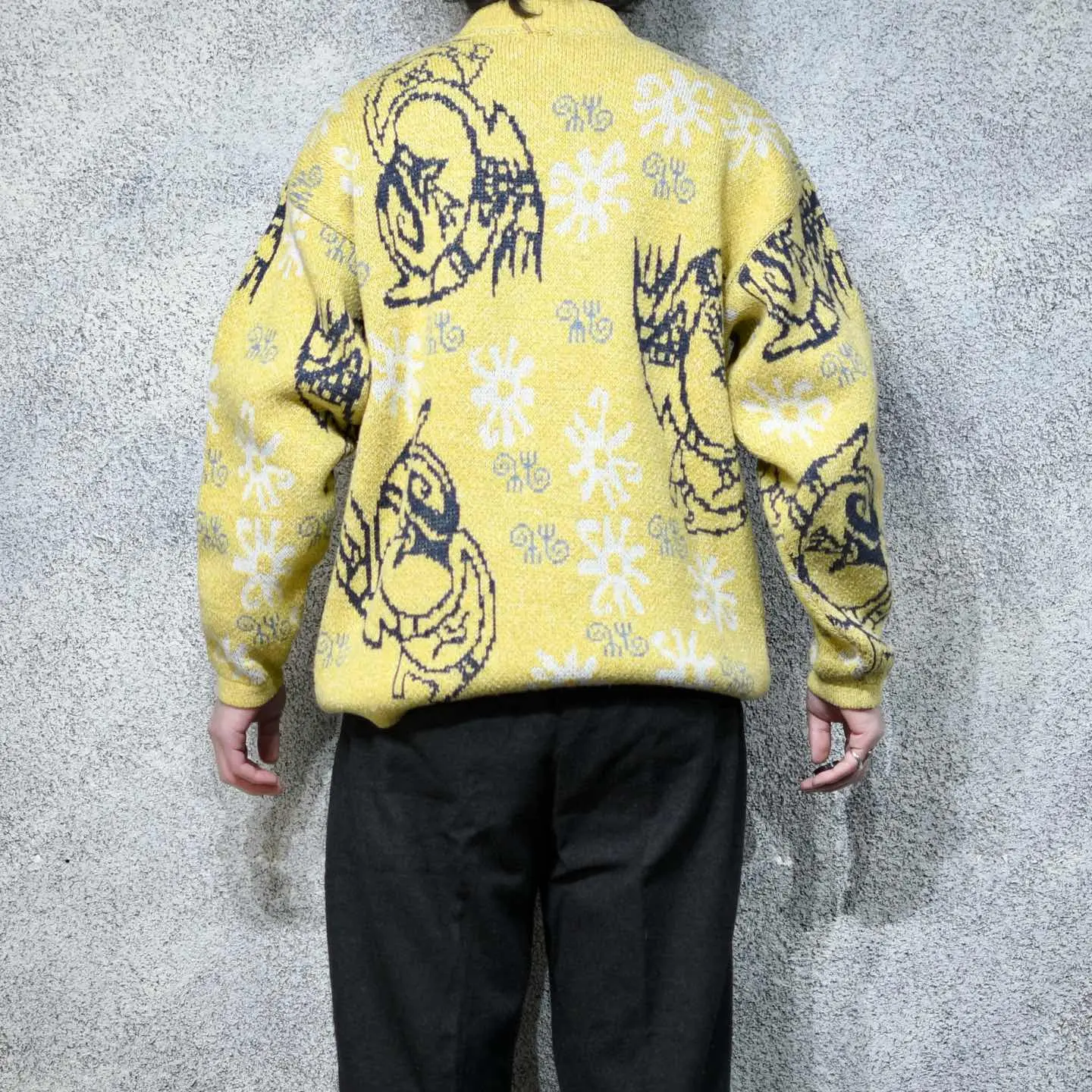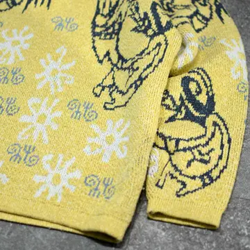 着丈70cm 肩幅64cm 身幅63cm 袖丈61cm fabric/acryl・cotton・wool・viscose 着用画像 177cm/64kg 何かのキャラクターでしょうか。 アーガイル柄やノルディック柄など、 他で代用出来る柄とは違った、個性溢れる 可愛い柄。 そんな珍しい柄と、映えるカラーリングとの 組み合わせは、キレイめで深みのあるパンツとの 相性も抜群。 裾にはリブが付いておらず、 シャツとのレイヤードにもどうでしょう。 ※撮影状況により、実物と多少色が異なる場合が ございます。 ※古着を取り扱っているため、気づかない汚れや ほつれ等がある場合がございます。 予めご了承ください。 ※サイズは着用感で選んでおり、表記サイズではございません。 古着 オーバーサイズ old vintage ヴィンテージ used 80's 90's アメリカ古着 ユーロ古着 メンズ レディース POLO RALPH LAUREN Eddie Bauer OLD GAP Eddie Bauer LANDS' END ランズエンド LLBean エルエルビーン オールドギャップ エディーバウアー ラルフローレン ブルックスブラザーズ Brooks Brothers 黄色 アクリルニット 総柄ニット 柄ニット などがお好きな方 #vintage #オーバーサイズ #old #used #90s #80s #古着 #ヴィンテージ #アメリカ古着 #ユーロ古着 #古着男子 #古着女子 #LLBean #エルエルビーン #EddieBauer #エディーバウアー #oldgap #オールドギャップ #LANDSEND #ランズエンド #NAUTICA #ノーティカ #ラルフローレン #POLORALPHLAUREN #ブルックスブラザーズ #BrooksBrothers #デザインニット #ニット #セーター #アクリルニット #総柄ニット #柄ニット