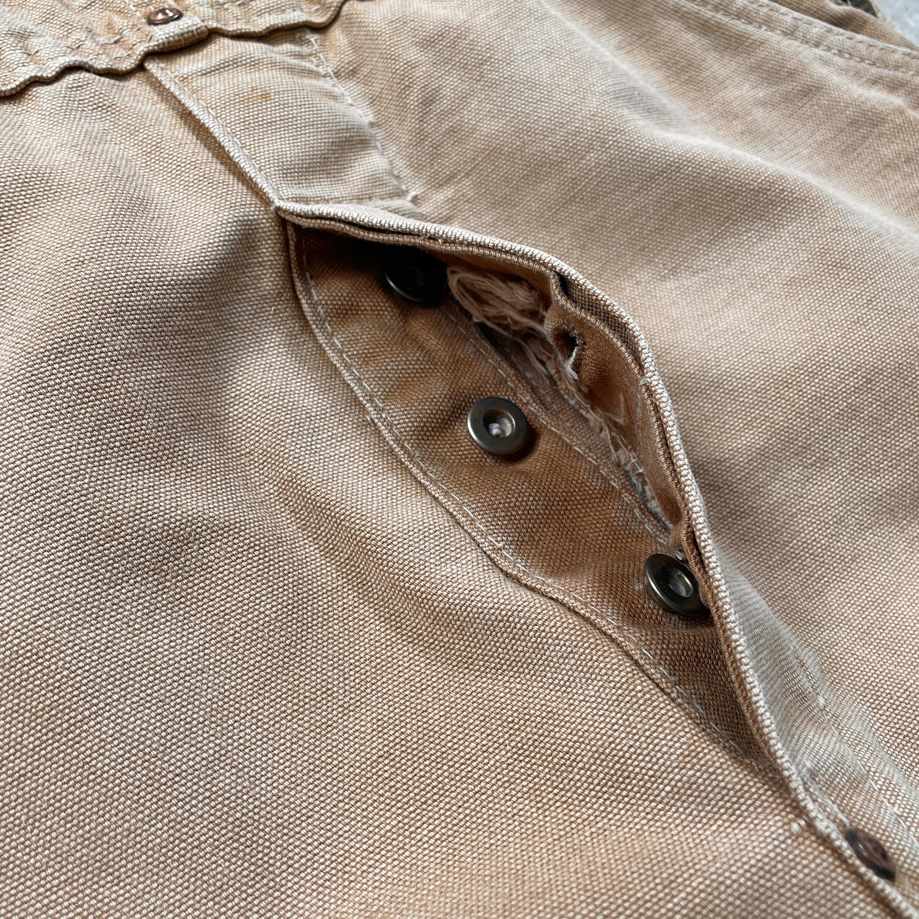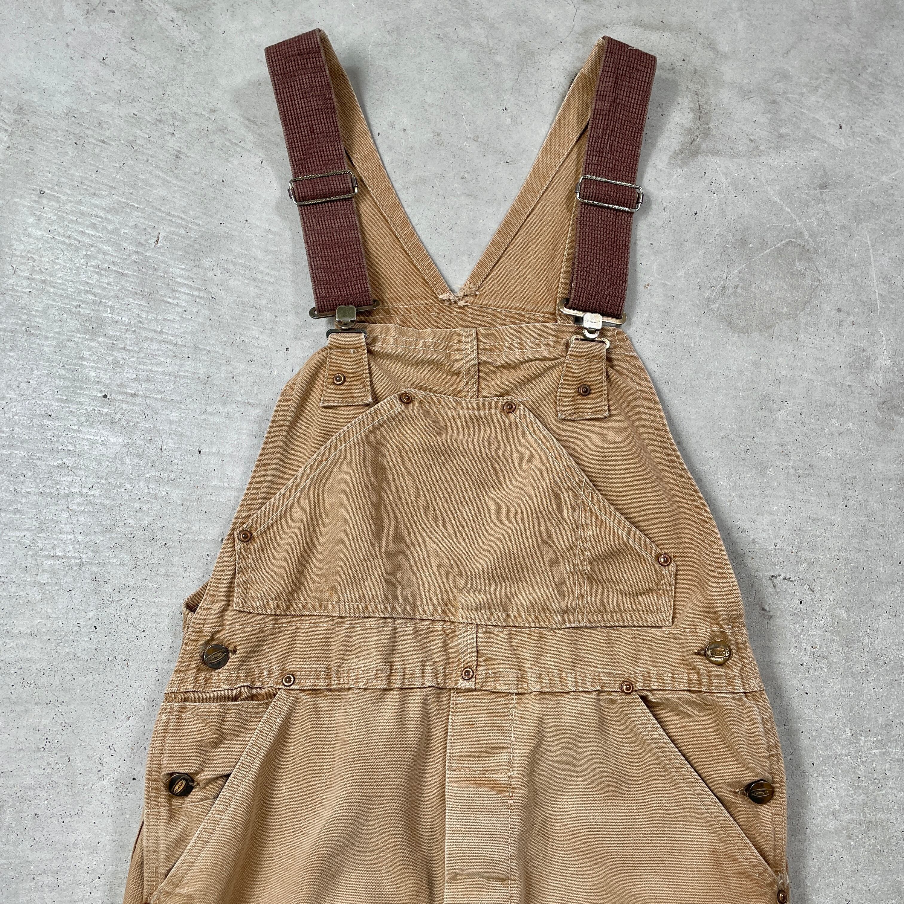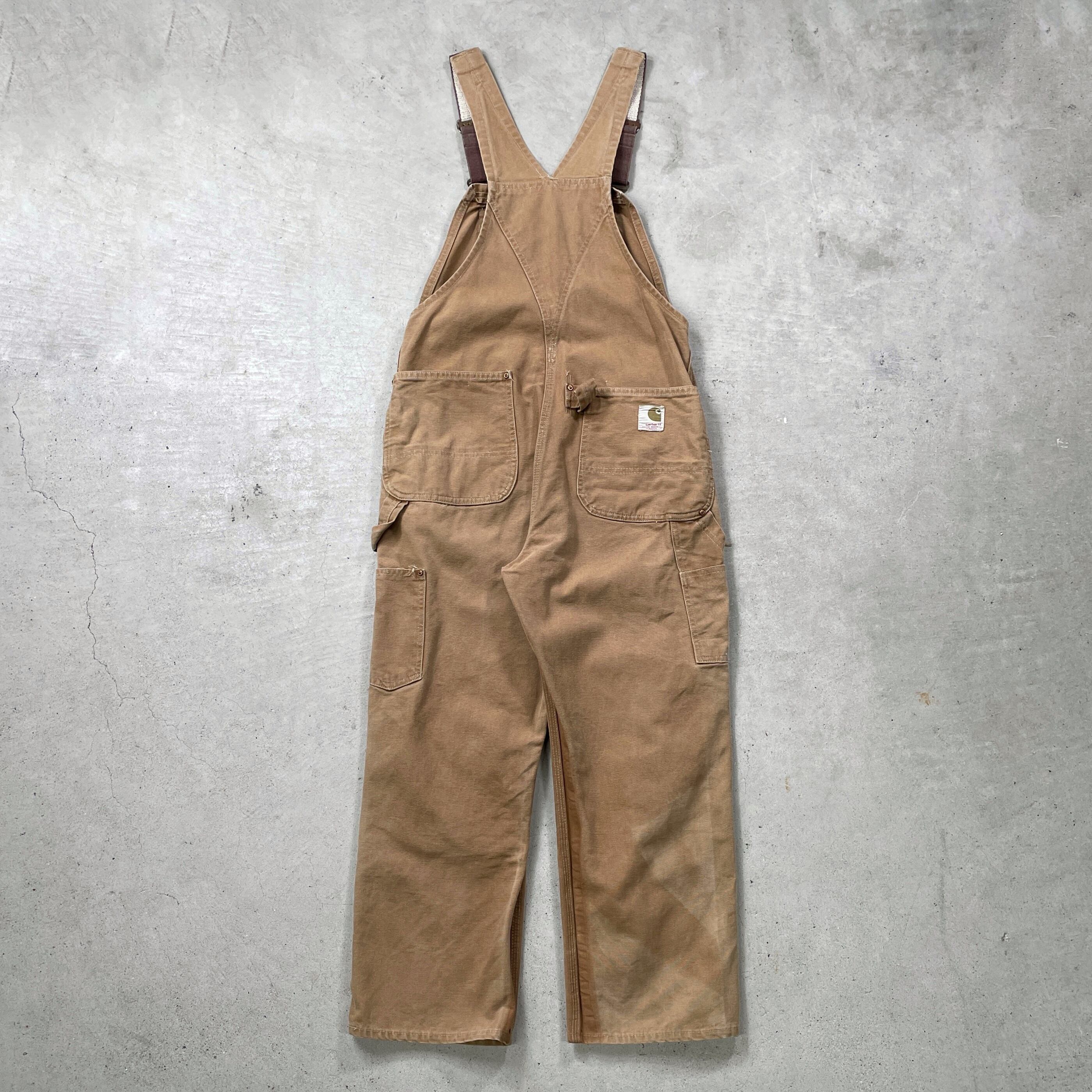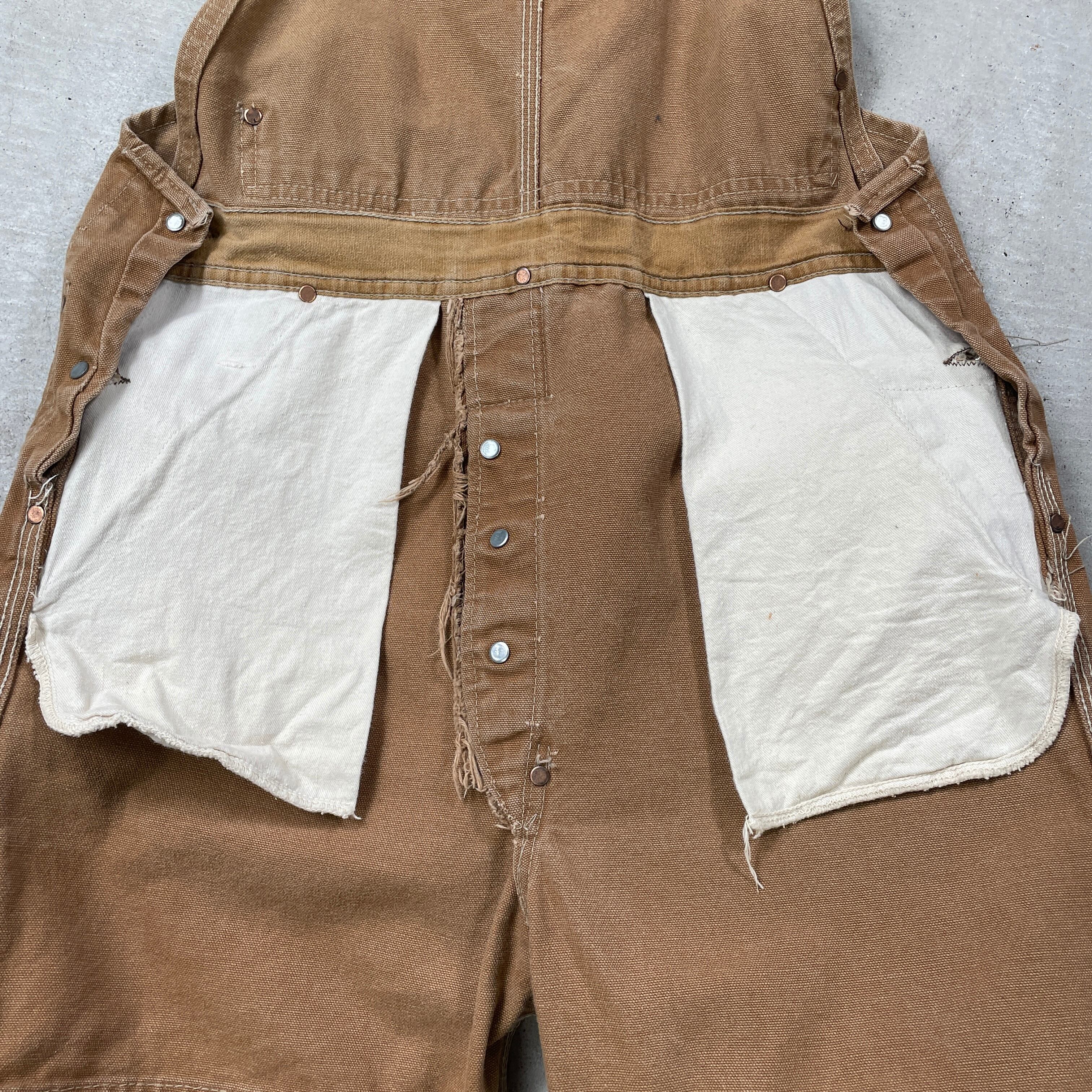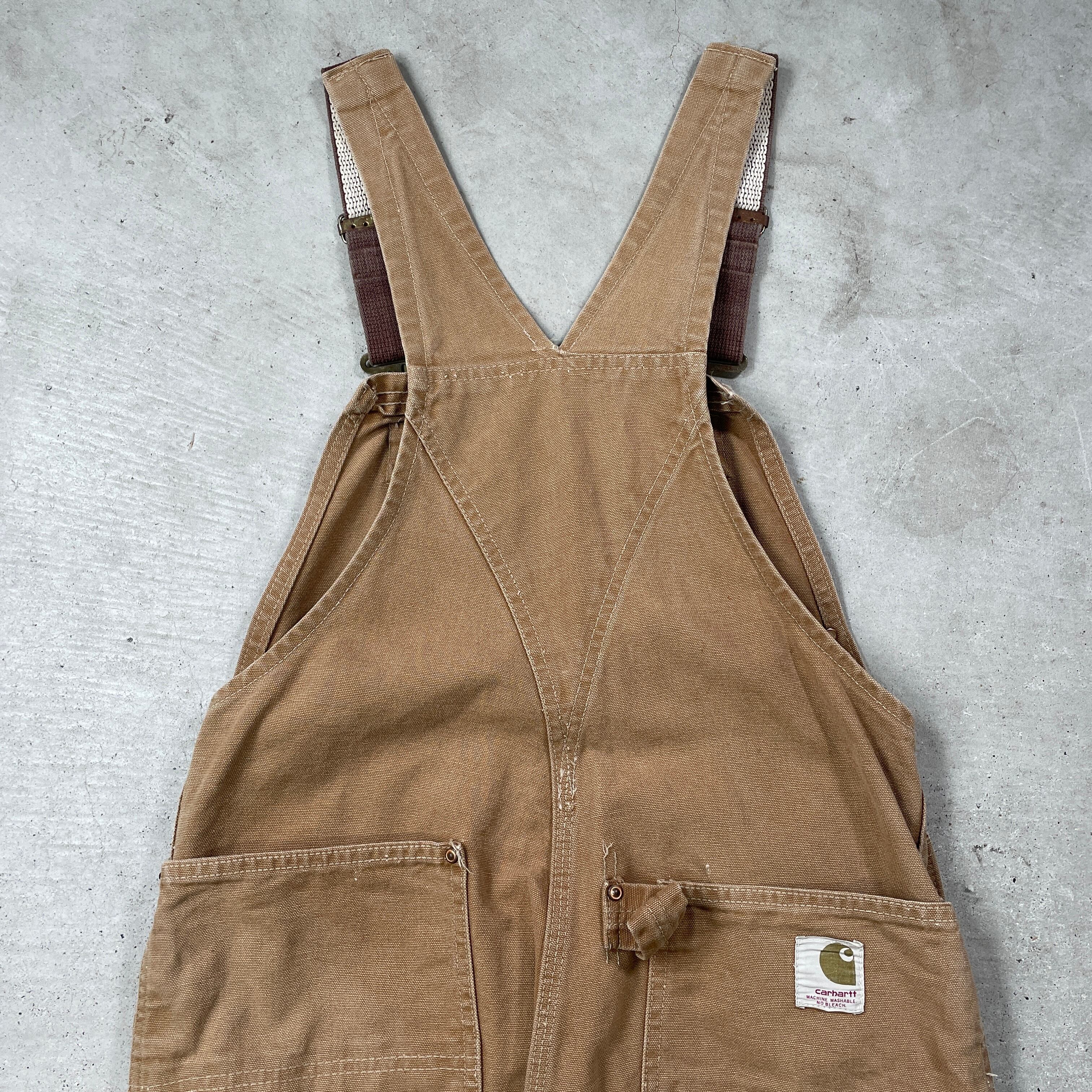 ■60年代 Carhartt カーハート ダック地 オーバーオール ダブルニー メンズW32相当 古着 60s VINTAGE ヴィンテージ ボタンフライ 山ポケ キャメル【オーバーオール】/ベージュ 【ブランド】Carhartt カーハート 【サイズ】表記 不明(実寸32×27相当) ※計測値をご確認ください。 総丈(肩から裾)…140(写真の状態の長さです。調節も可能になっています。) ウエスト…(平置き計測?2)…83 ワタリ幅…32.5 股下…68 裾幅…24 【生産国】不明(おそらくUSA製かと思われます。) 【素材】不明(おそらくコットンかと思われます。) 【状態】 全体的に汚れやダメージ、色あせ等のヴィンテージワークウェアらしい使用感がございます。 画像にてご確認ください。 【c250128102】 ※古着は洗濯、検品などのケアを行っております。(新品・デッドストックは洗濯していません。) ※モニターの発色により実物と異なる場合がございます。予めご了承ください。 ※ 海外直輸入USED品になります。