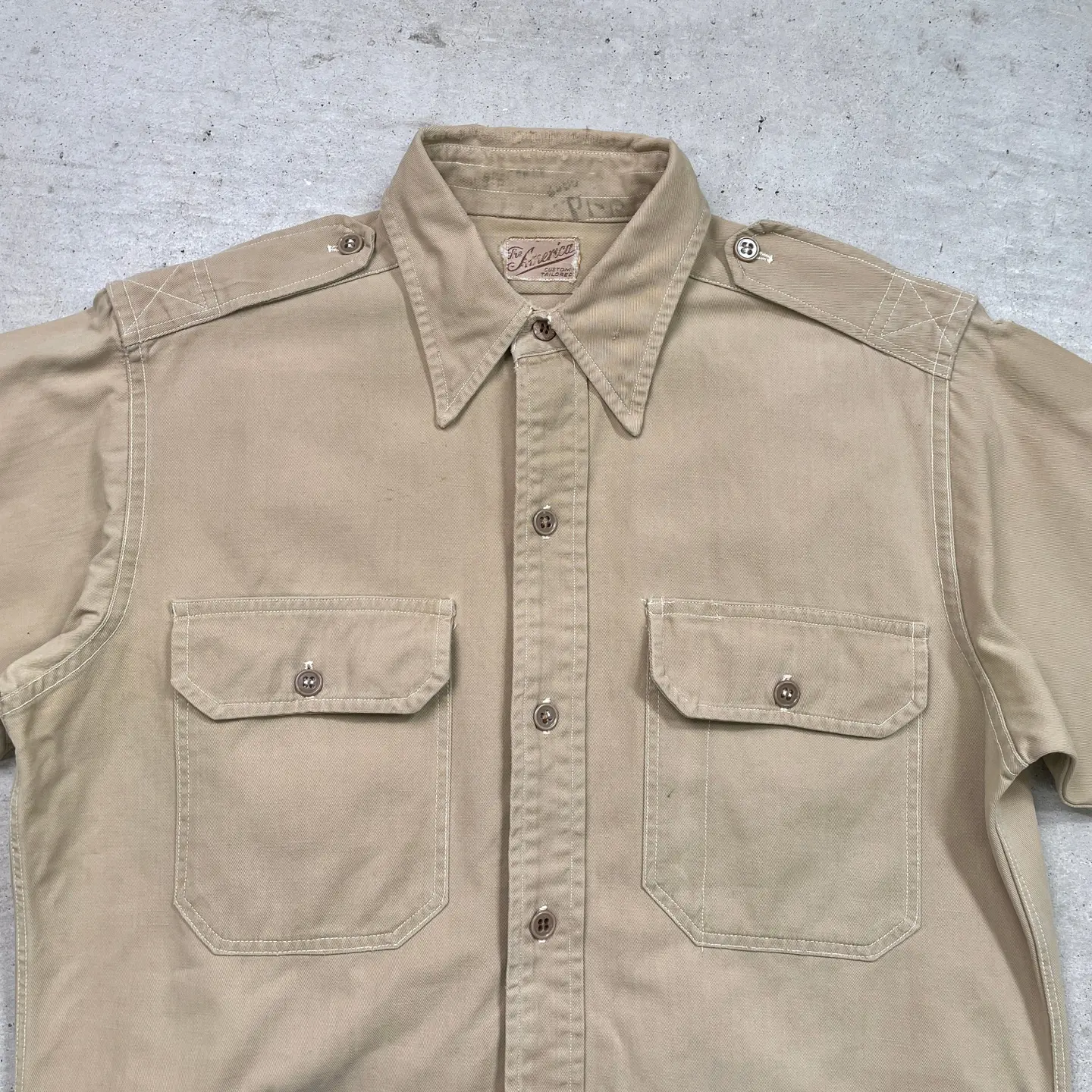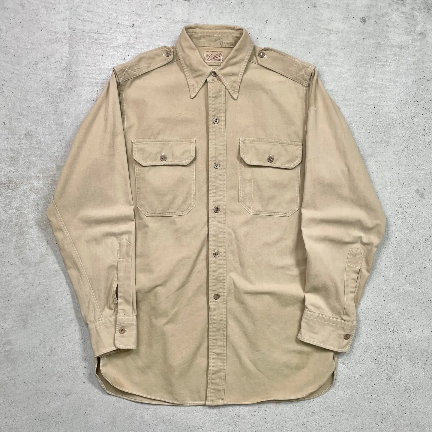 ■50年代 米軍実品 U.S.ARMY 長袖シャツ ミリタリーシャツ メンズS-M相当 古着 50s アメカジ VINTAGE ヴィンテージ カーキ【長袖シャツ】/ベージュ 【ブランド】The America 【サイズ】表記 不明(着用感メンズS-M相当) ※計測値をご確認ください。 着丈…76 身幅…52.5 肩幅…42.5 袖丈…59 【生産国】不明 【素材】不明(おそらくコットンかと思われます。) 【状態】全体的に多少の汚れが御座います。また、肩のワッペンが取れている跡がございます。画像にてご確認ください。 【c250205102】 ※古着は洗濯、検品などのケアを行っております。(新品・デッドストックは洗濯していません。)