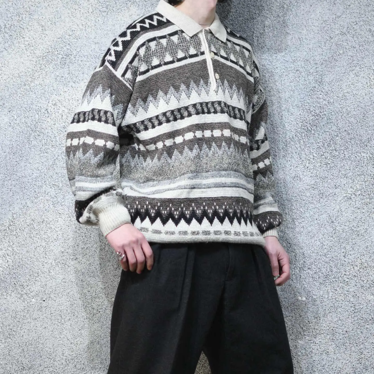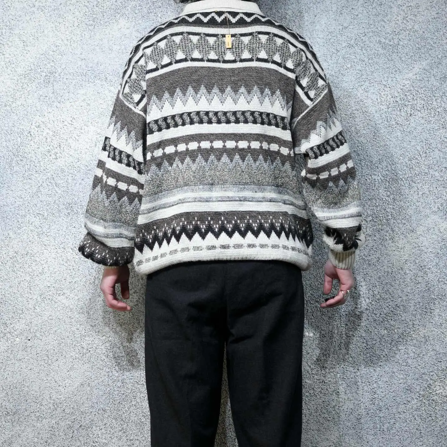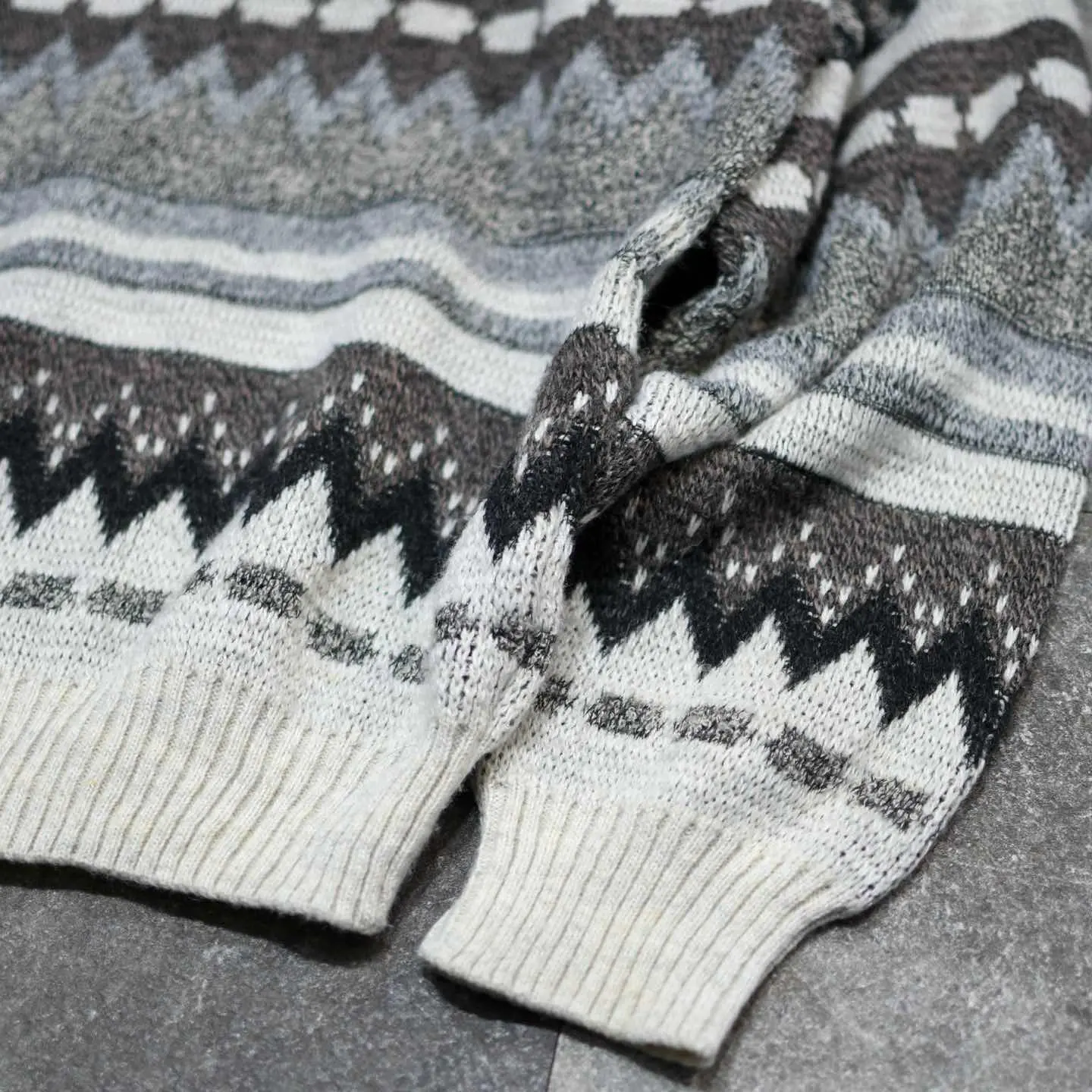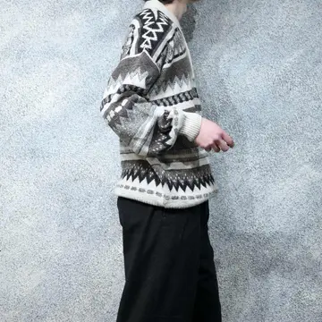 着丈71cm 肩幅67cm 身幅65cm 袖丈61cm fabric/acrylic・wool・nylon 着用画像 177cm/64kg 密かに力を入れているカテゴリー、"ニットポロ" その中でも一際惹かれた個体がこちら。 デザインの切り替えしの箇所の縫製が、 なんだか独特で、ギザギザ縫い。 そこに気付いていなければ、柄について 謳っていたであろうニットポロですが、 全てその縫製に魅力を持っていかれました。 服の細部に一癖あるのが好きな方、 そんな細部は関係なく、柄に惹かれた方、 共におすすめです。 ※撮影状況により、実物と多少色が異なる場合が ございます。 ※古着を取り扱っているため、気づかない汚れや ほつれ等がある場合がございます。 予めご了承ください。 ※サイズは着用感で選んでおり、表記サイズではございません。 古着 オーバーサイズ old vintage ヴィンテージ used 80's 90's アメリカ古着 ユーロ古着 メンズ レディース POLO RALPH LAUREN Eddie Bauer OLD GAP Eddie Bauer LANDS' END ランズエンド LLBean エルエルビーン オールドギャップ エディーバウアー ラルフローレン ブルックスブラザーズ Brooks Brothers グレー ウールニット 総柄ニット 柄ニット 灰色 セーター ニット プルオーバー などがお好きな方 #vintage #オーバーサイズ #old #used #90s #80s #古着 #ヴィンテージ #アメリカ古着 #ユーロ古着 #古着男子 #古着女子 #LLBean #エルエルビーン #EddieBauer #エディーバウアー #oldgap #オールドギャップ #LANDSEND #ランズエンド #NAUTICA #ノーティカ #ラルフローレン #POLORALPHLAUREN #ブルックスブラザーズ #BrooksBrothers #ニットポロ #プルオーバー #デザインニット #ニット #セーター #ウールニット #アクリルニット #総柄ニット #柄ニット