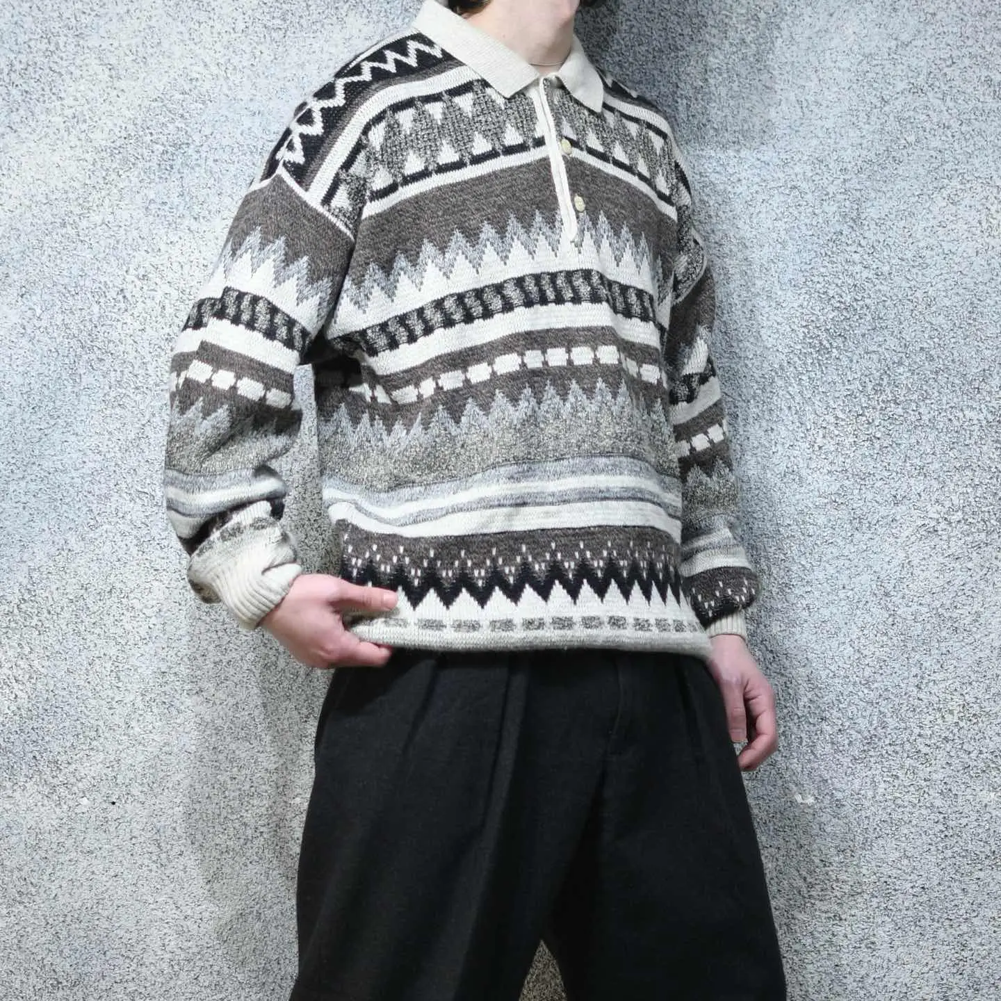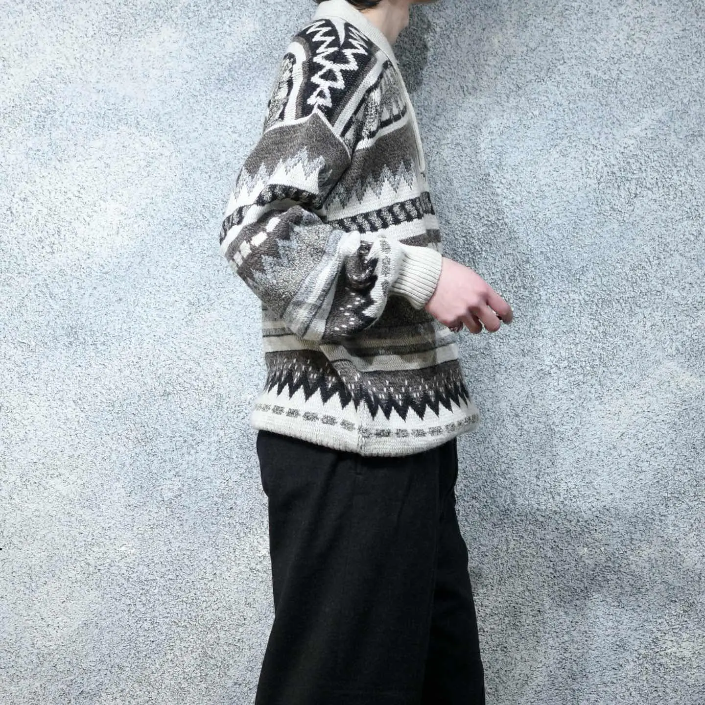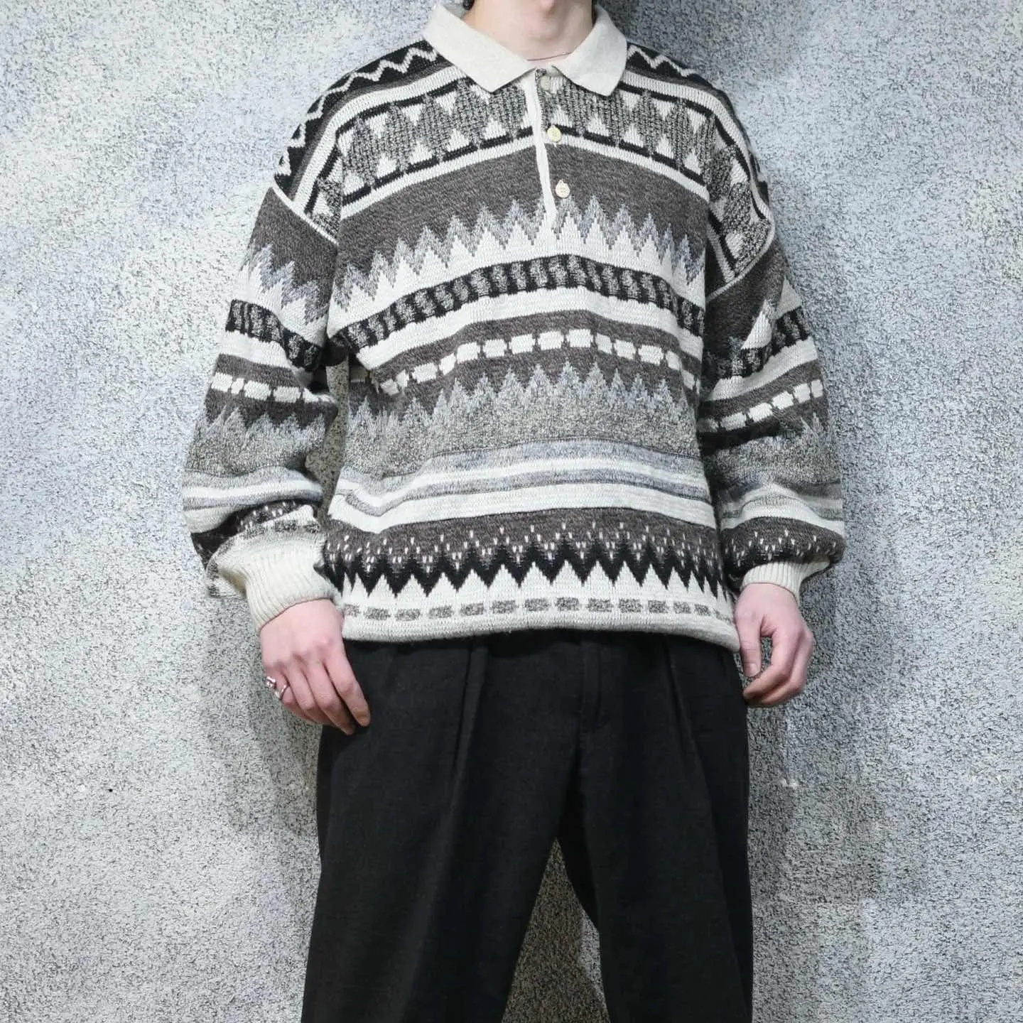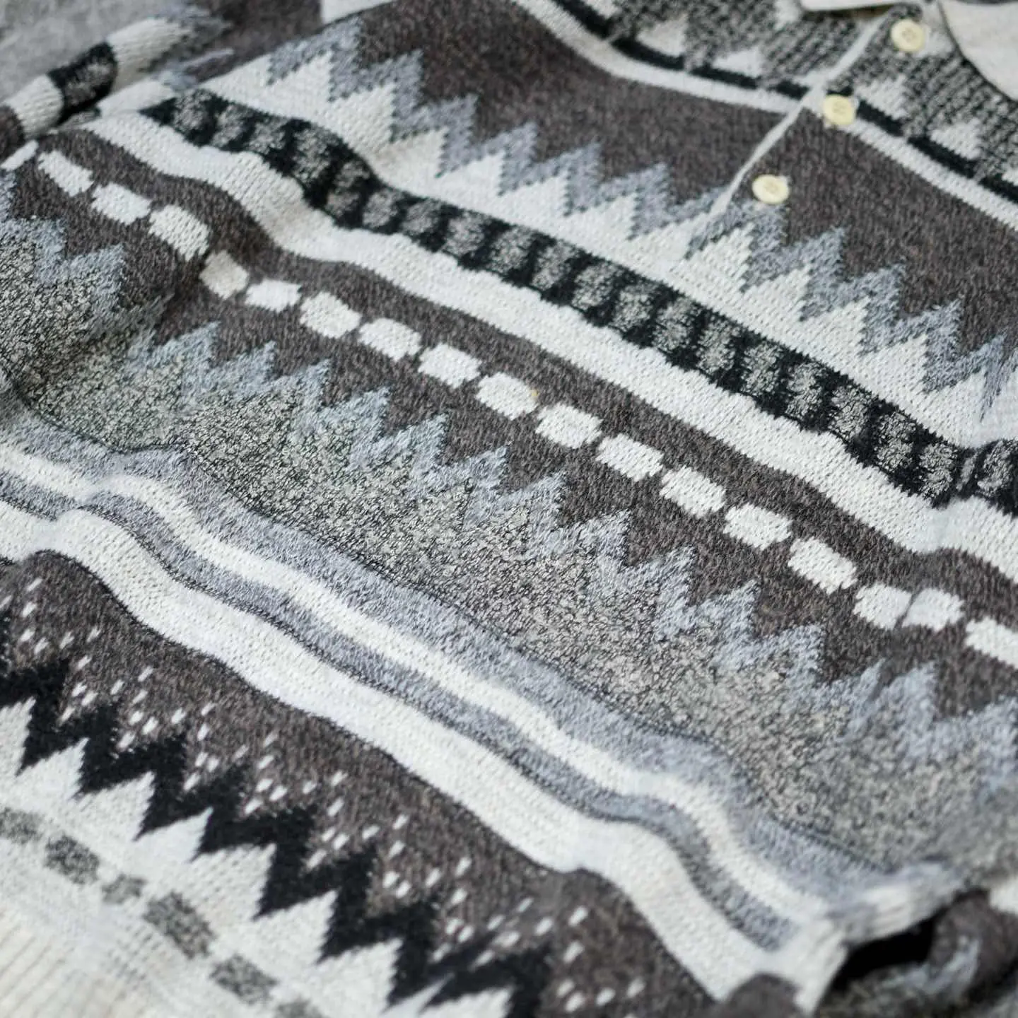 着丈71cm 肩幅67cm 身幅65cm 袖丈61cm fabric/acrylic・wool・nylon 着用画像 177cm/64kg 密かに力を入れているカテゴリー、"ニットポロ" その中でも一際惹かれた個体がこちら。 デザインの切り替えしの箇所の縫製が、 なんだか独特で、ギザギザ縫い。 そこに気付いていなければ、柄について 謳っていたであろうニットポロですが、 全てその縫製に魅力を持っていかれました。 服の細部に一癖あるのが好きな方、 そんな細部は関係なく、柄に惹かれた方、 共におすすめです。 ※撮影状況により、実物と多少色が異なる場合が ございます。 ※古着を取り扱っているため、気づかない汚れや ほつれ等がある場合がございます。 予めご了承ください。 ※サイズは着用感で選んでおり、表記サイズではございません。 古着 オーバーサイズ old vintage ヴィンテージ used 80's 90's アメリカ古着 ユーロ古着 メンズ レディース POLO RALPH LAUREN Eddie Bauer OLD GAP Eddie Bauer LANDS' END ランズエンド LLBean エルエルビーン オールドギャップ エディーバウアー ラルフローレン ブルックスブラザーズ Brooks Brothers グレー ウールニット 総柄ニット 柄ニット 灰色 セーター ニット プルオーバー などがお好きな方 #vintage #オーバーサイズ #old #used #90s #80s #古着 #ヴィンテージ #アメリカ古着 #ユーロ古着 #古着男子 #古着女子 #LLBean #エルエルビーン #EddieBauer #エディーバウアー #oldgap #オールドギャップ #LANDSEND #ランズエンド #NAUTICA #ノーティカ #ラルフローレン #POLORALPHLAUREN #ブルックスブラザーズ #BrooksBrothers #ニットポロ #プルオーバー #デザインニット #ニット #セーター #ウールニット #アクリルニット #総柄ニット #柄ニット
