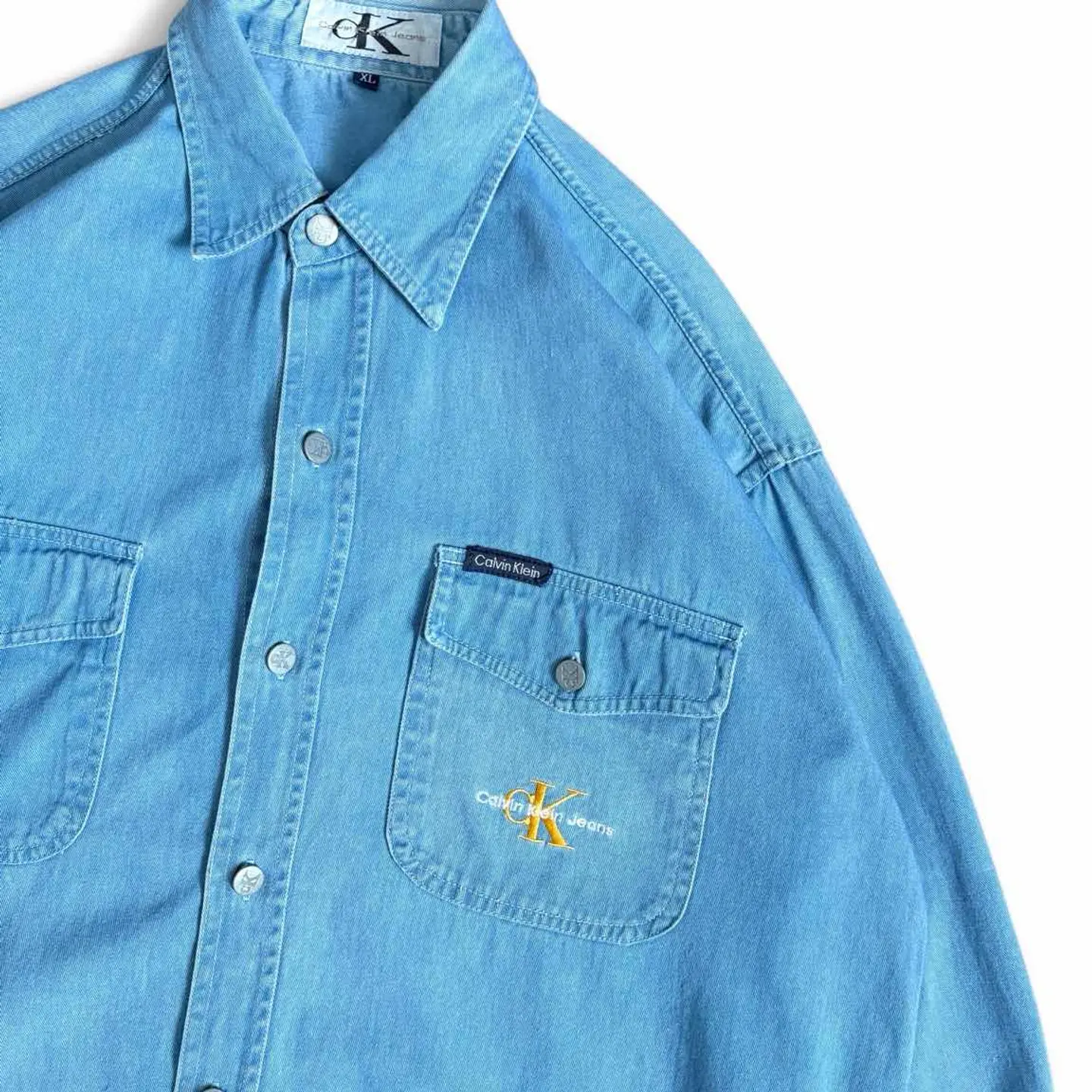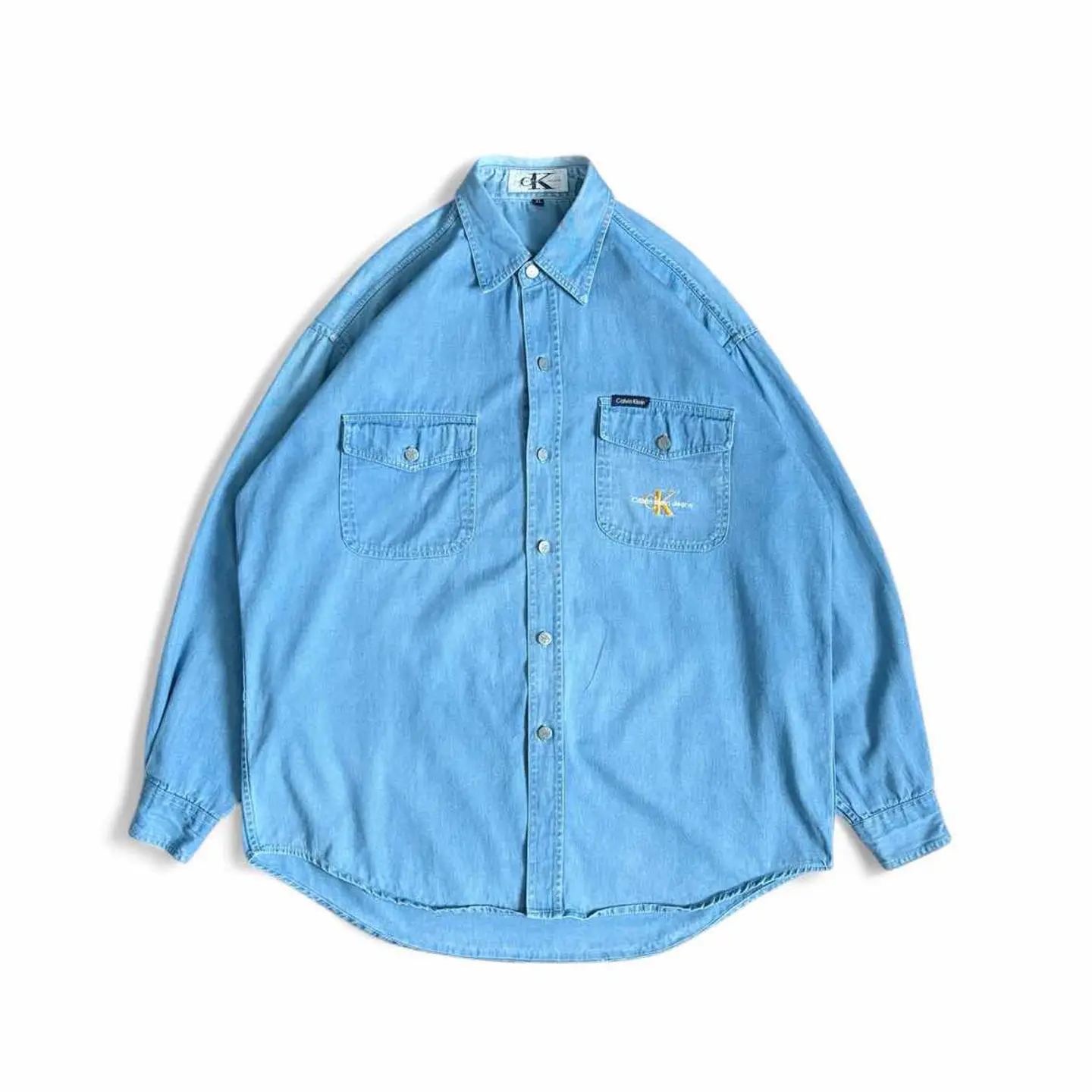 ○商品説明 90s CalvinKlein これからの季節にピッタリな一枚になります。 イエローのCKの刺繍がイカしてます。 気になった方は是非。 ○サイズ 表記XL 平置き ・肩幅52cm ・身幅63cm ・袖丈57cm ・着丈81cm ○商品の状態 B A:使用感がほとんどなく、汚れやシミもなし B:多少使用感はあるが、汚れやシミも少ない C:使用感があり、汚れやシミがある D:使用感があり、大きな汚れや破れあり ○色 ライトブルー #90s#CalvinKlein#カルバンクライン#デニムシャツ