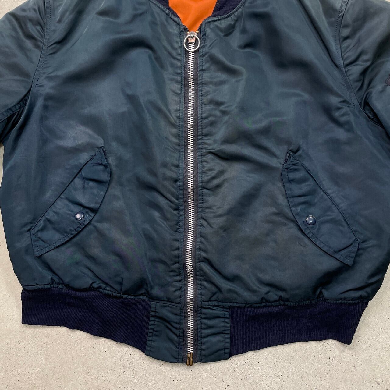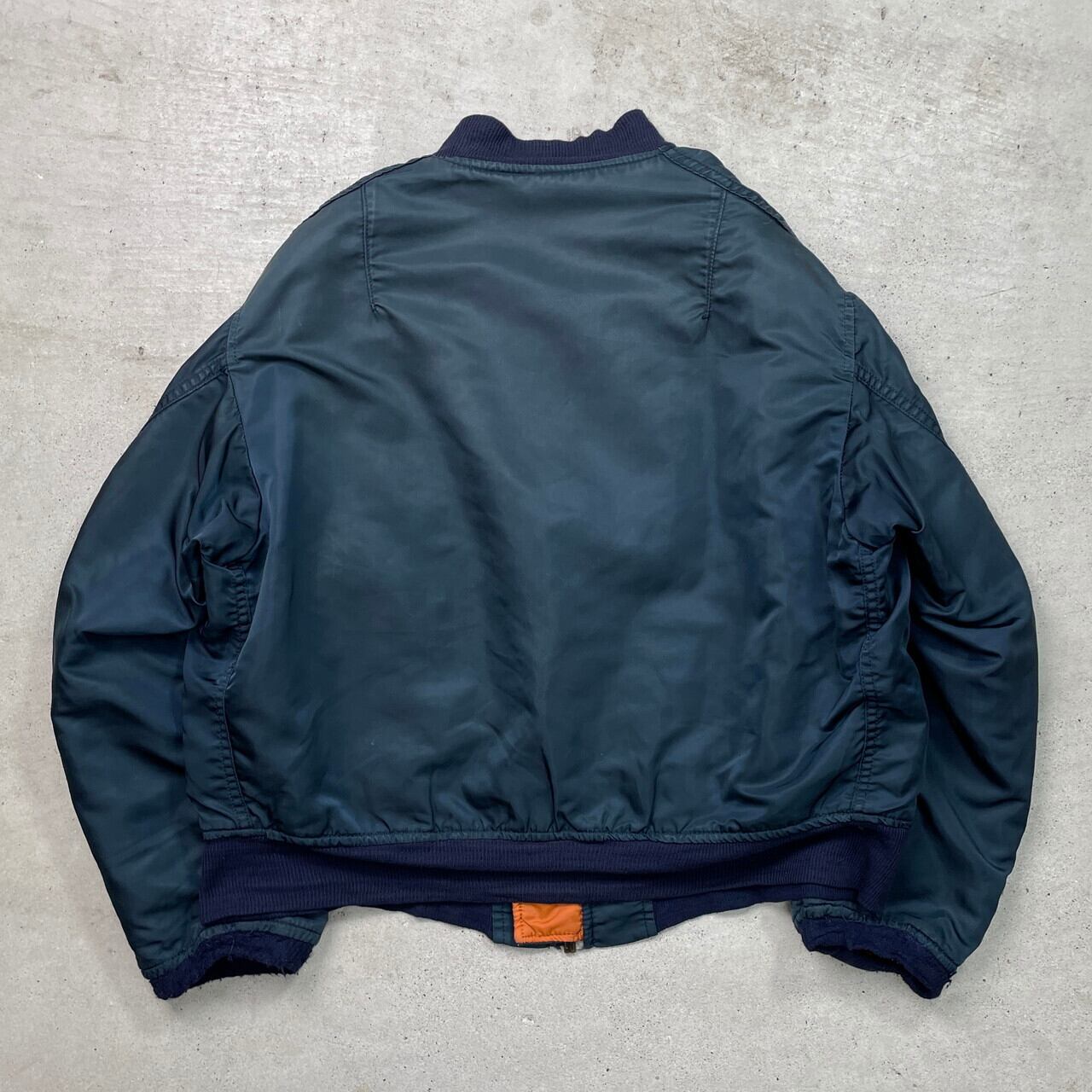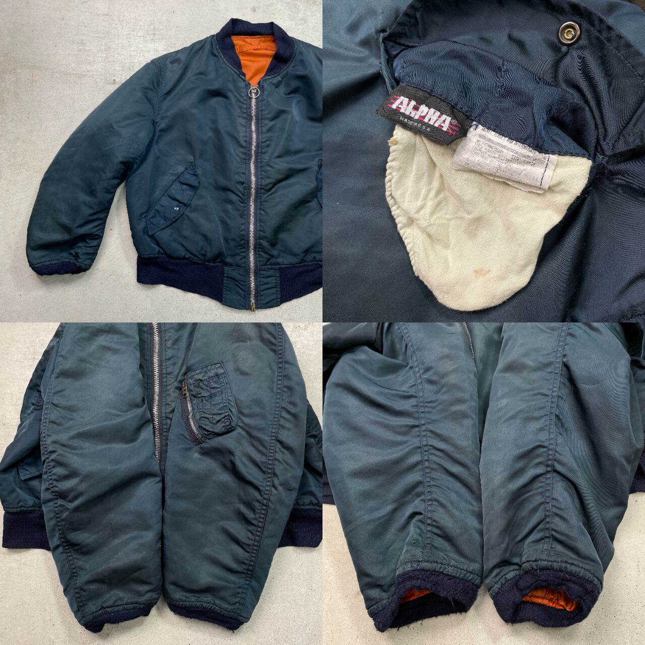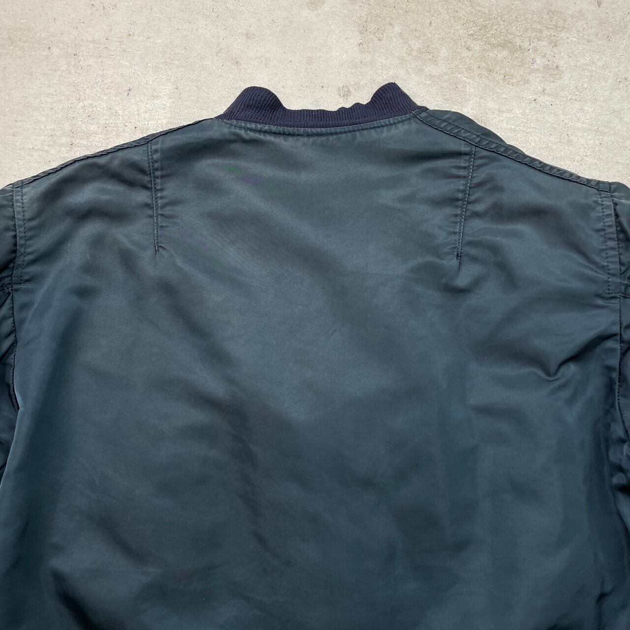■80年代 USA製 ALPHA MA-1 ミリタリー フライトジャケット 民間品 メンズL 古着 80s 中綿入り VINTAGE ヴィンテージ アルファインダストリーズ ボンバージャケット フェードネイビー 紺色 【ミリタリージャケット】/ネイビー 【ブランド】ALPHA 【サイズ】表記 LARGE モデル身長173cm 計測値をご確認ください。 着丈…61.5. 身幅…68 肩幅…50.5 袖丈…57.5 【生産国】USA製 【素材】ナイロン100% 【状態】 全体的にフェード、数か所ステッチ取れや小穴、表メインジップのジップ引手交換、リブにダメージ、左内ポケットスナップ欠損等の使用感がございます。 画像にてご確認ください。 【c250312010】 ※古着は洗濯、検品などのケアを行っております。(新品・デッドストックは洗濯していません。) ※モニターの発色により実物と異なる場合がございます。予めご了承ください。 ※ 海外直輸入USED品になります。