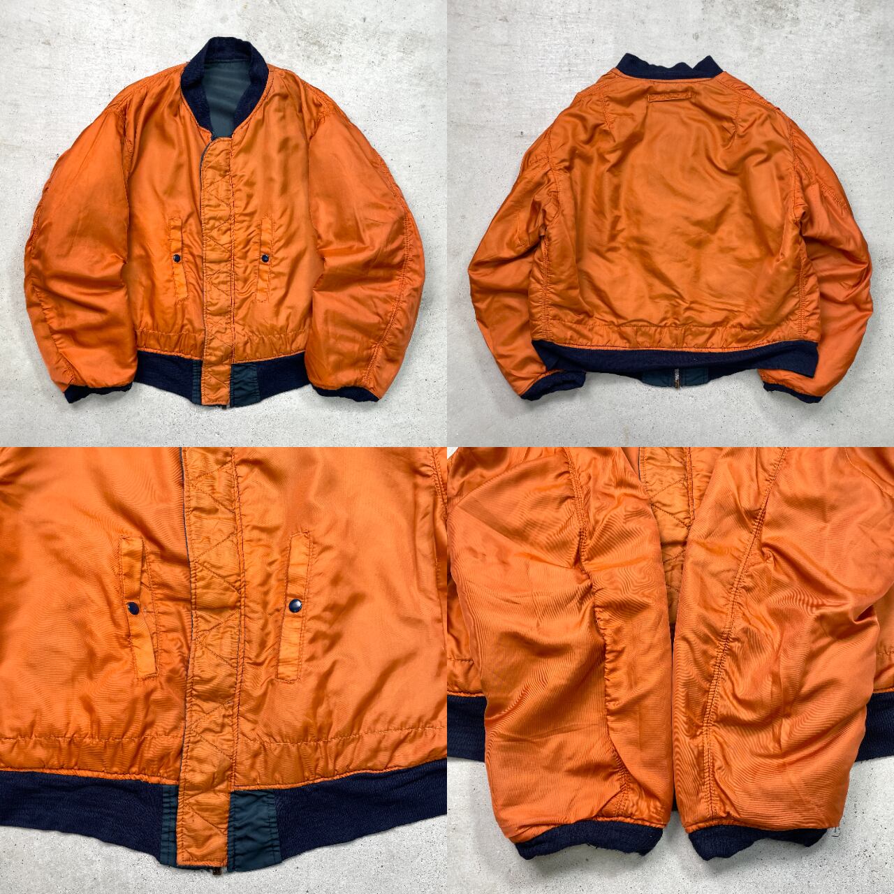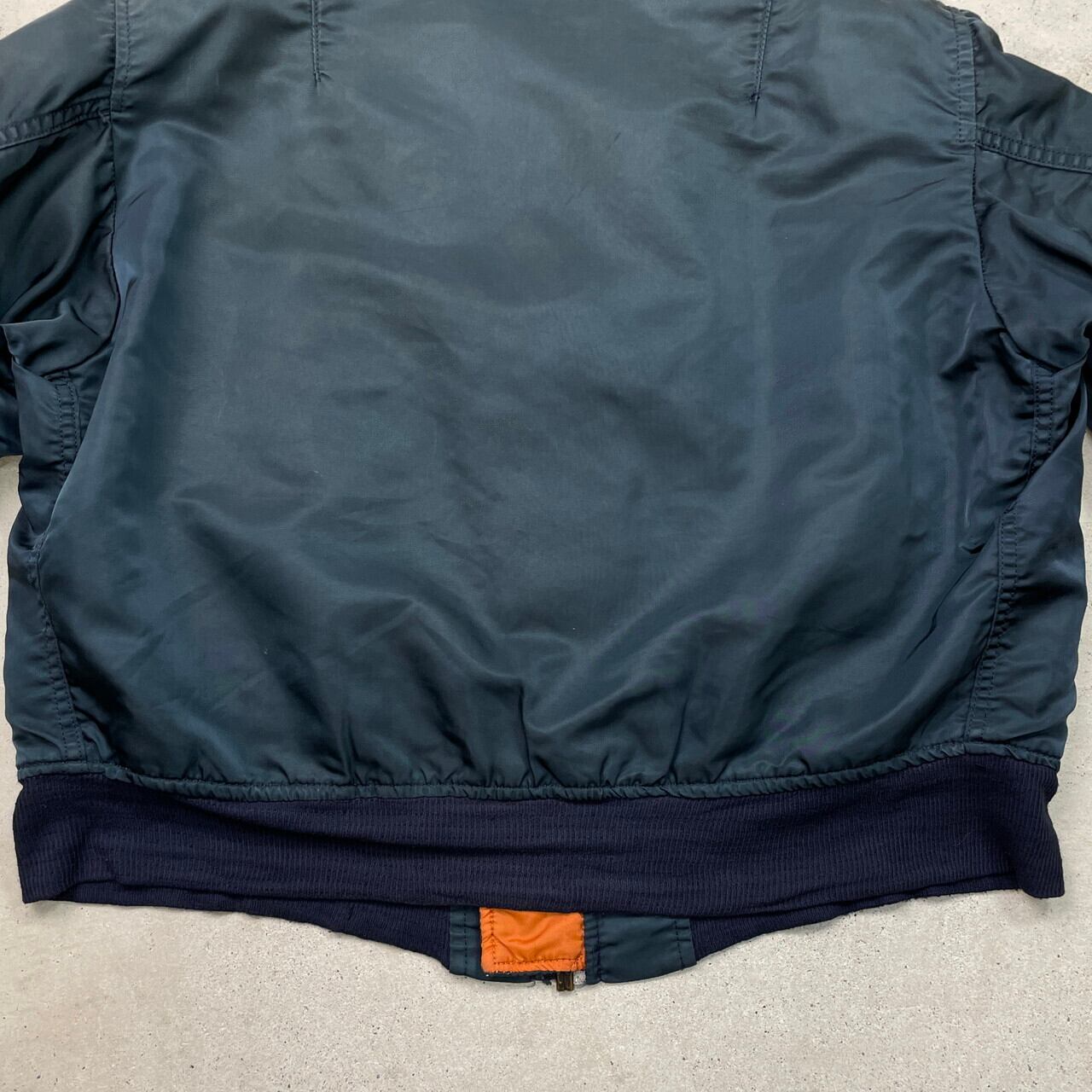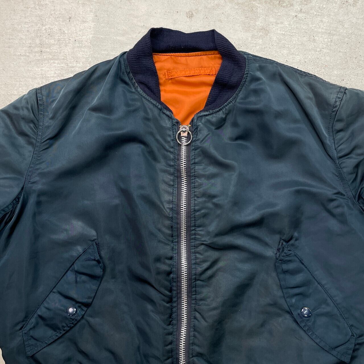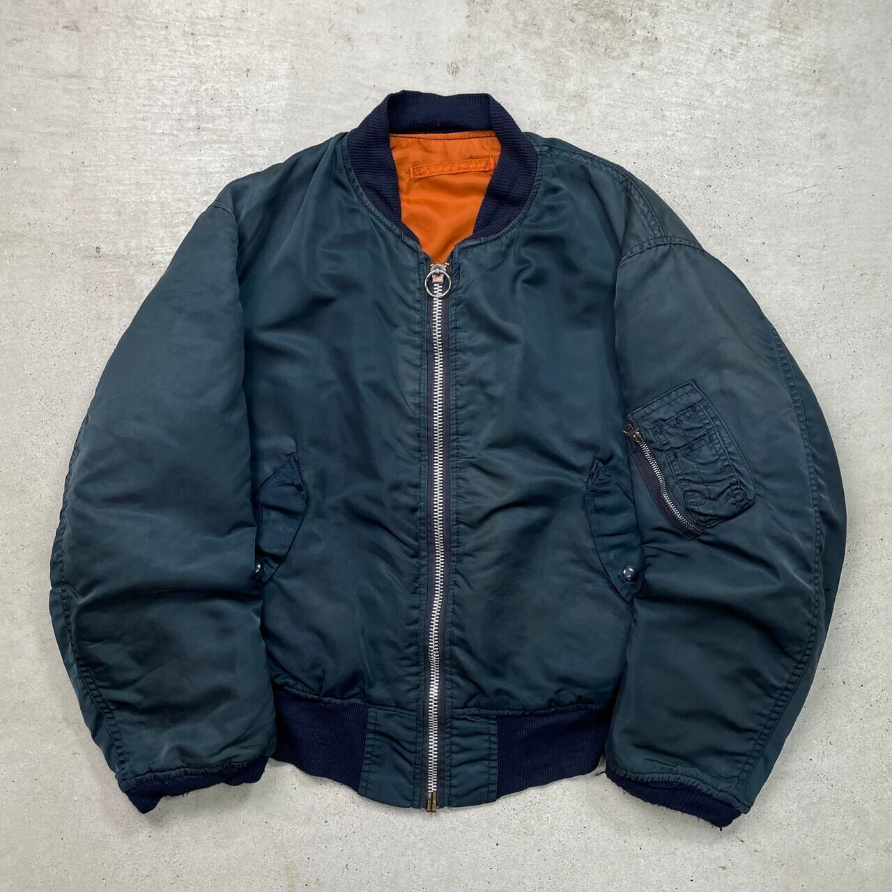 ■80年代 USA製 ALPHA MA-1 ミリタリー フライトジャケット 民間品 メンズL 古着 80s 中綿入り VINTAGE ヴィンテージ アルファインダストリーズ ボンバージャケット フェードネイビー 紺色 【ミリタリージャケット】/ネイビー 【ブランド】ALPHA 【サイズ】表記 LARGE モデル身長173cm 計測値をご確認ください。 着丈…61.5. 身幅…68 肩幅…50.5 袖丈…57.5 【生産国】USA製 【素材】ナイロン100% 【状態】 全体的にフェード、数か所ステッチ取れや小穴、表メインジップのジップ引手交換、リブにダメージ、左内ポケットスナップ欠損等の使用感がございます。 画像にてご確認ください。 【c250312010】 ※古着は洗濯、検品などのケアを行っております。(新品・デッドストックは洗濯していません。) ※モニターの発色により実物と異なる場合がございます。予めご了承ください。 ※ 海外直輸入USED品になります。