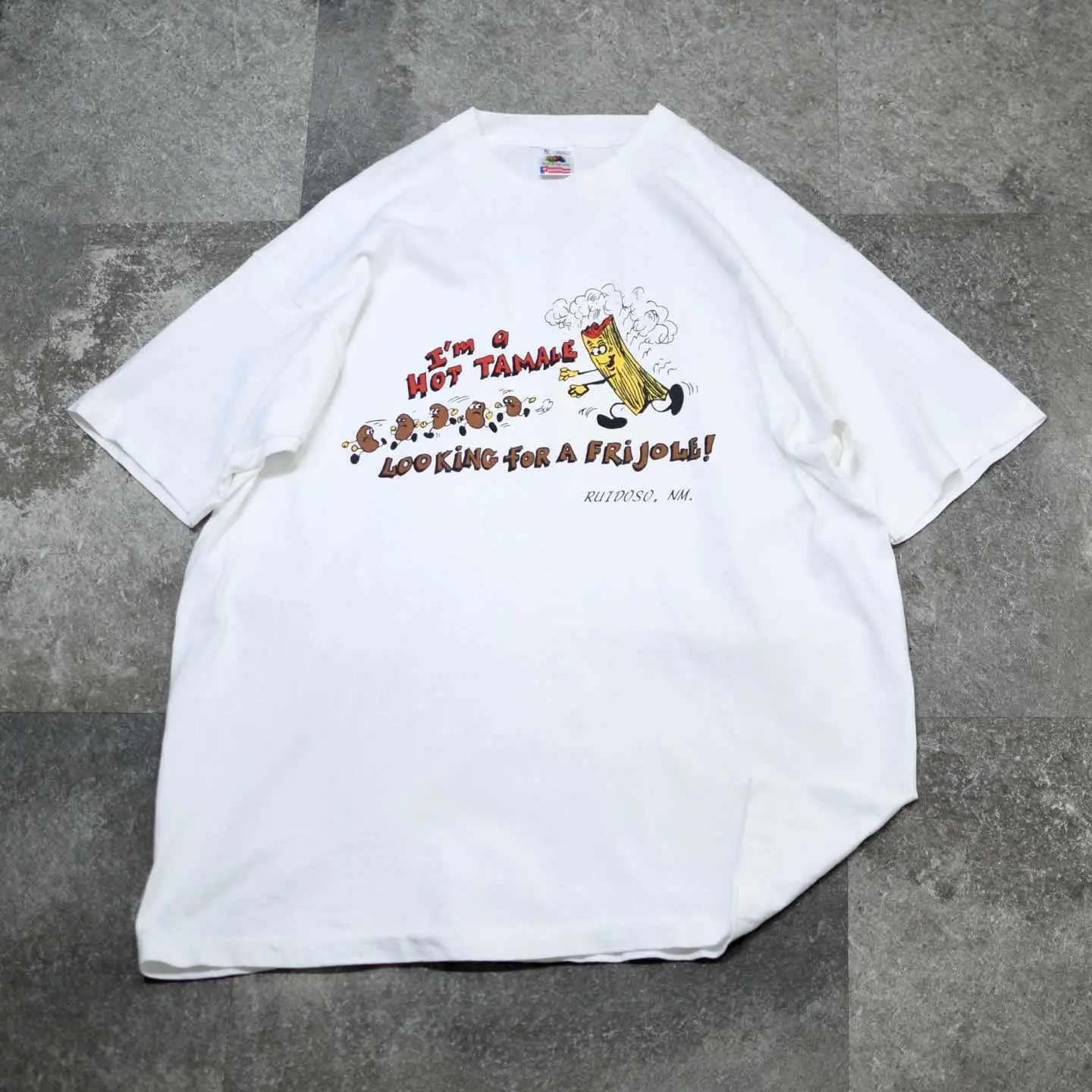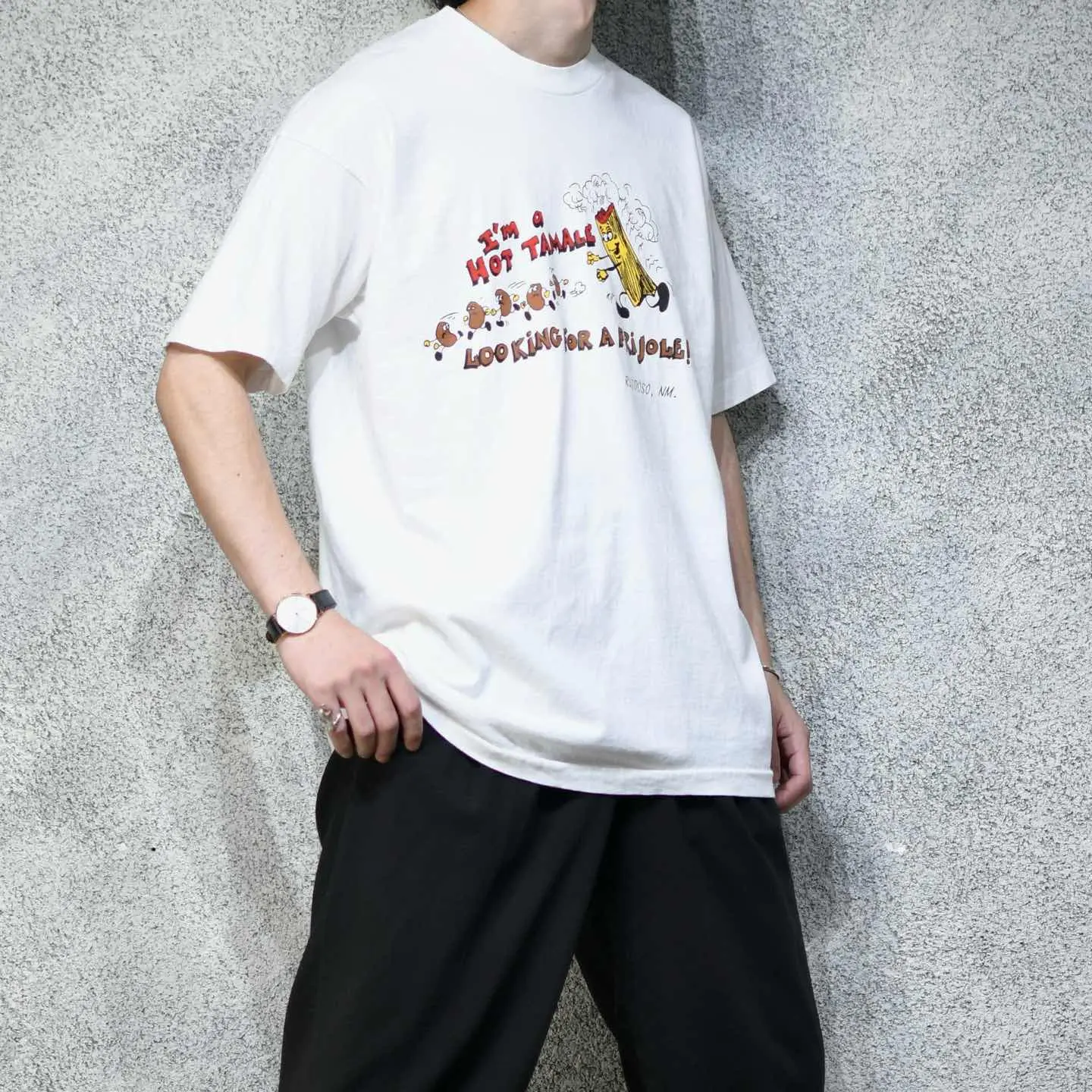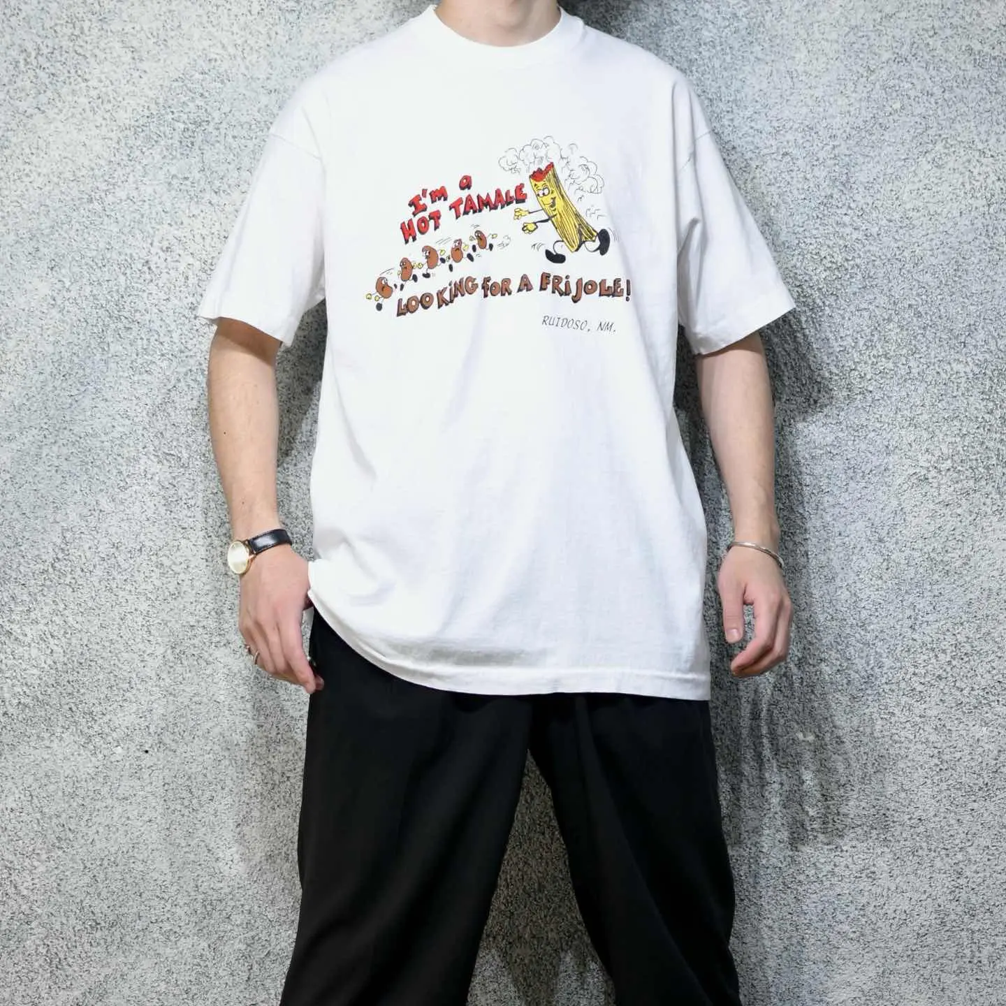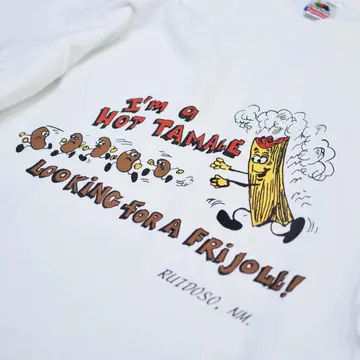 着丈77cm 肩幅61cm 身幅63cm 袖丈21cm(シングルステッチ) fabric/cotton made in USA 着用画像 177cm/64kg メキシコ料理"タマレ"と豆"フリホーレ"を テーマにした、海外らしいユーモアあるプリント。 こんなよく分からないけど、面白いアイテムが 見つかるのがTシャツですし、古着の中でも 個性の出る、心躍るアイテムが多いTシャツ。 プリントの配色や、ゆるく着れるサイズ感が また良い、、、 ※撮影状況により、実物と多少色が異なる場合が ございます。 ※古着を取り扱っているため、気づかない汚れや ほつれ等がある場合がございます。 予めご了承ください。 ※サイズは着用感で選んでおり、表記サイズではございません。 古着 オーバーサイズ old vintage ヴィンテージ used 80's 90's アメリカ古着 ユーロ古着 メンズ レディース POLO RALPH LAUREN Eddie Bauer OLD GAP Eddie Bauer LANDS' END ランズエンド LLBean エルエルビーン オールドギャップ エディーバウアー ラルフローレン ブルックスブラザーズ Brooks Brothers ホワイト 白 白Tシャツ 半袖Tシャツ ユーモア ジョーク などがお好きな方 #vintage #オーバーサイズ #old #used #90s #80s #古着 #ヴィンテージ #アメリカ古着 #ユーロ古着 #古着男子 #古着女子 #LLBean #エルエルビーン #EddieBauer #エディーバウアー #oldgap #オールドギャップ #LANDSEND #ランズエンド #NAUTICA #ノーティカ #ラルフローレン #POLORALPHLAUREN #ブルックスブラザーズ #BrooksBrothers #Tシャツ #半袖Tシャツ #プリントTシャツ #ユーモア #白Tシャツ