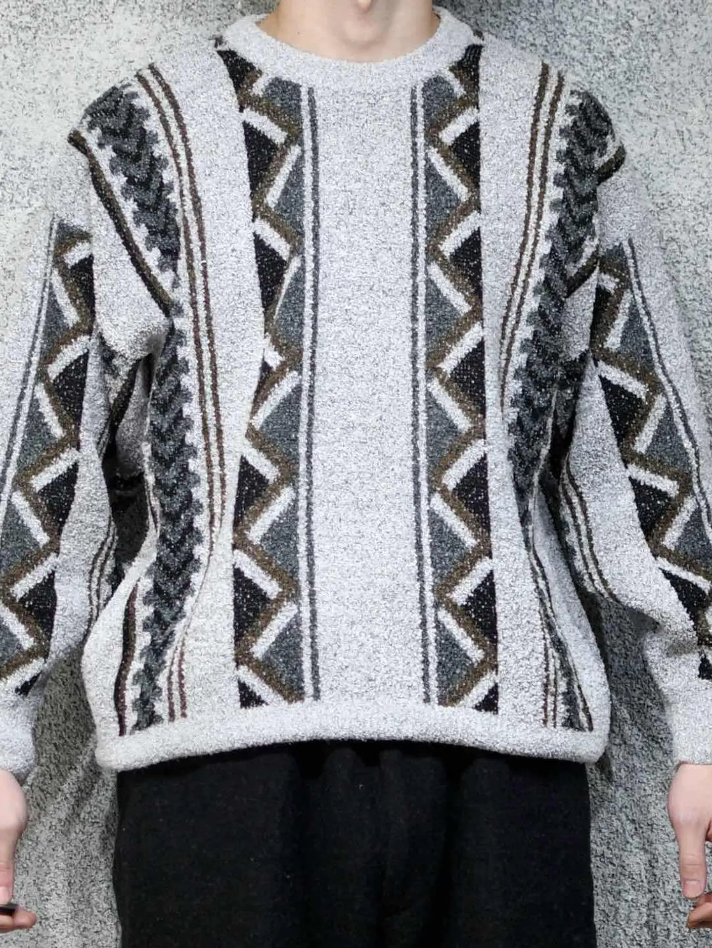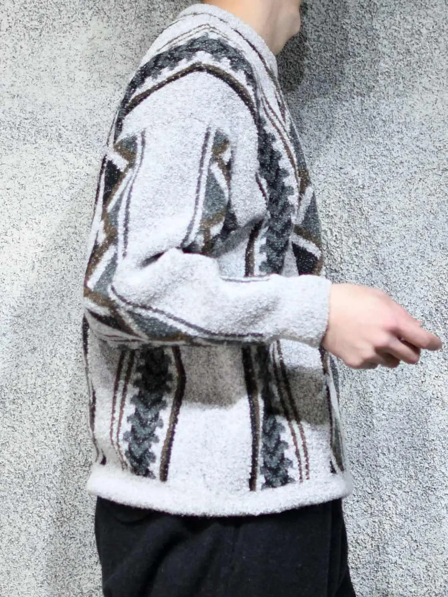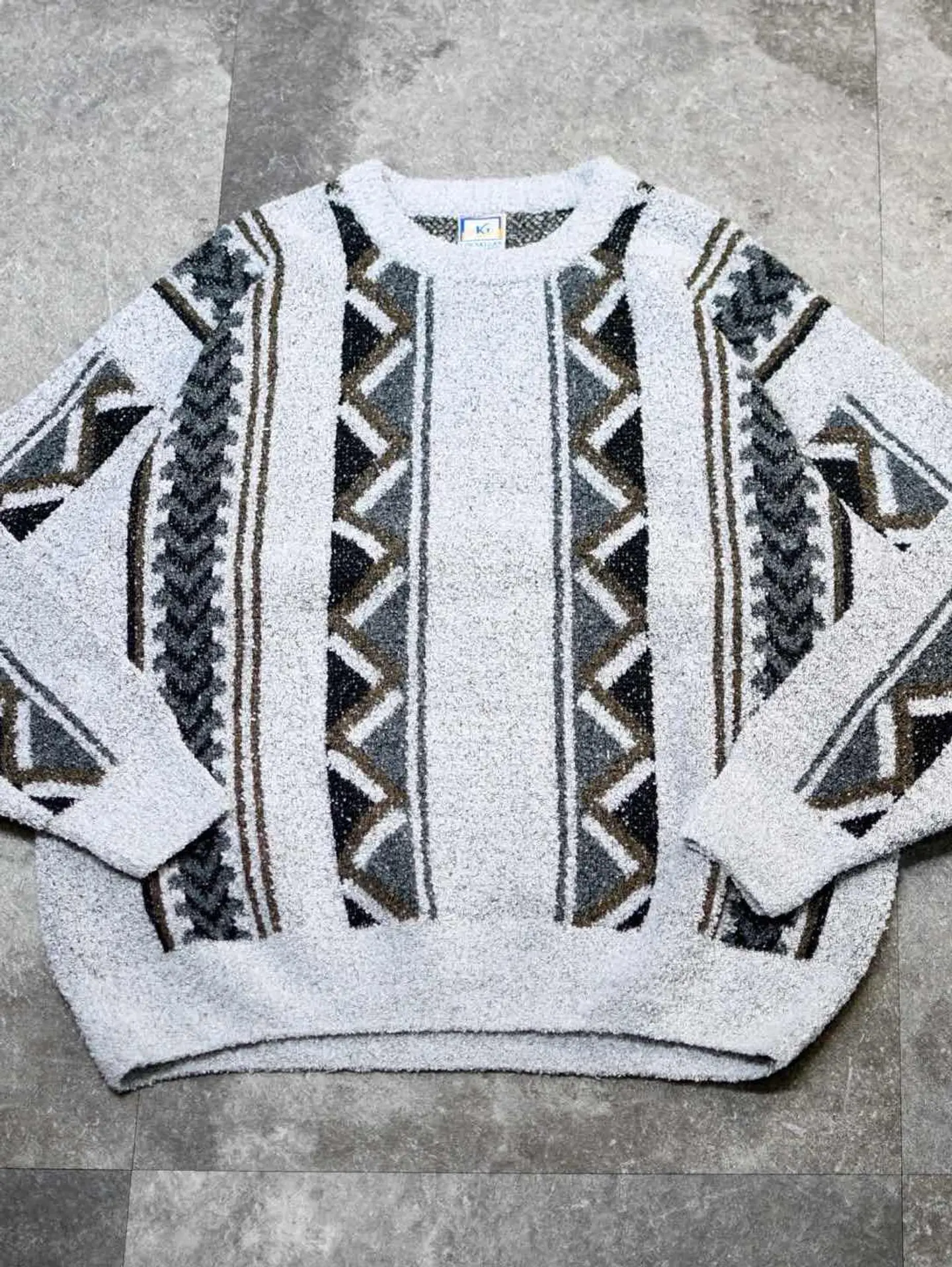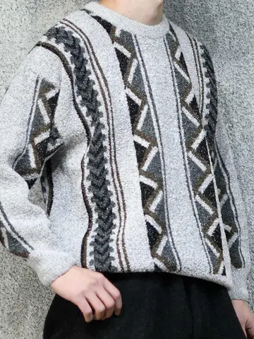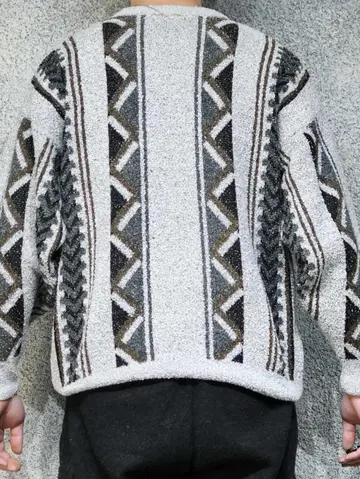 着丈65cm 肩幅62cm 身幅62cm 袖丈53cm fabric/acryl・nylon 着用画像 177cm/64kg パイル生地の様な生地感が特徴的で、 どこか新鮮味を感じたアクリルニット。 その生地感からか、デザインにも凹凸が加わり 他のデザインニットとは違った雰囲気を纏う逸品。 白をベースとするデザインニットは数少なく、 ここまでクオリティの高い個体も なかなか無いかと思います。 黒のコートやレザージャケットのインナーにしても コーデ全体の印象が暗くならない、頼れるニット。 ※撮影状況により、実物と多少色が異なる場合が ございます。 ※古着を取り扱っているため、気づかない汚れや ほつれ等がある場合がございます。 予めご了承ください。 ※サイズは着用感で選んでおり、表記サイズではございません。 古着 オーバーサイズ old vintage ヴィンテージ used 80's 90's アメリカ古着 ユーロ古着 メンズ レディース POLO RALPH LAUREN Eddie Bauer OLD GAP Eddie Bauer LANDS' END ランズエンド LLBean エルエルビーン オールドギャップ エディーバウアー ラルフローレン ブルックスブラザーズ Brooks Brothers ホワイト 白 グレー 灰色 柄 総柄 などがお好きな方 #vintage #オーバーサイズ #old #used #90s #80s #古着 #ヴィンテージ #アメリカ古着 #ユーロ古着 #古着男子 #古着女子 #LLBean #エルエルビーン #EddieBauer #エディーバウアー #oldgap #オールドギャップ #LANDSEND #ランズエンド #NAUTICA #ノーティカ #ラルフローレン #POLORALPHLAUREN #ブルックスブラザーズ #BrooksBrothers #アクリルニット #ニット #セーター #デザインニット