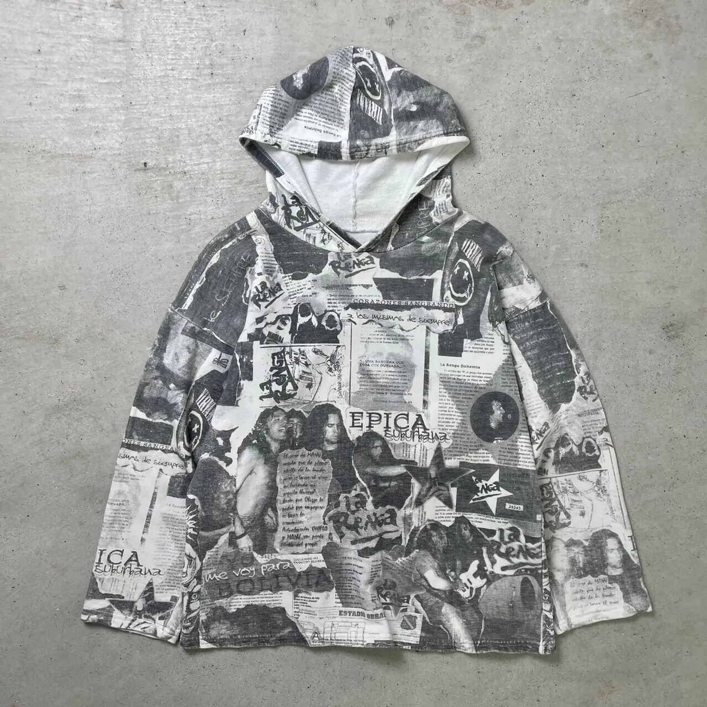 ■NIRVANA LaRenga EPICA オールオーバープリント バンドスウェットパーカー メンズM相当 古着 総柄 ペーパー柄 白黒【パーカー】/マルチカラー 【ブランド】不明 【サイズ】表記 不明(着用感メンズM相当) ※計測値をご確認ください。 着丈…59.5 身幅…55 肩幅…60 袖丈…45.5 【生産国】不明 【素材】不明(おそらくコットン,ポリエステルの混紡かと思われます。) 【状態】 全体的に汚れやシミが御座います。 画像にてご確認ください。 【c250401037】 ※古着は洗濯、検品などのケアを行っております。(新品・デッドストックは洗濯していません。) ※モニターの発色により実物と異なる場合がございます。予めご了承ください。 ※ 海外直輸入USED品になります。