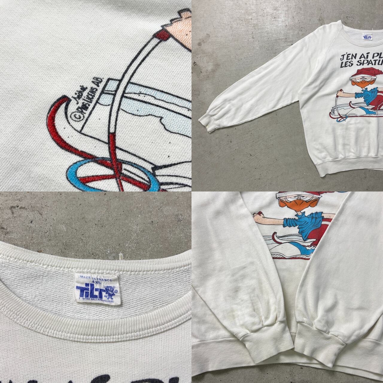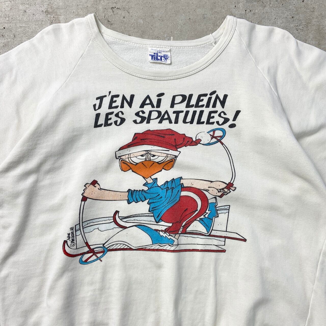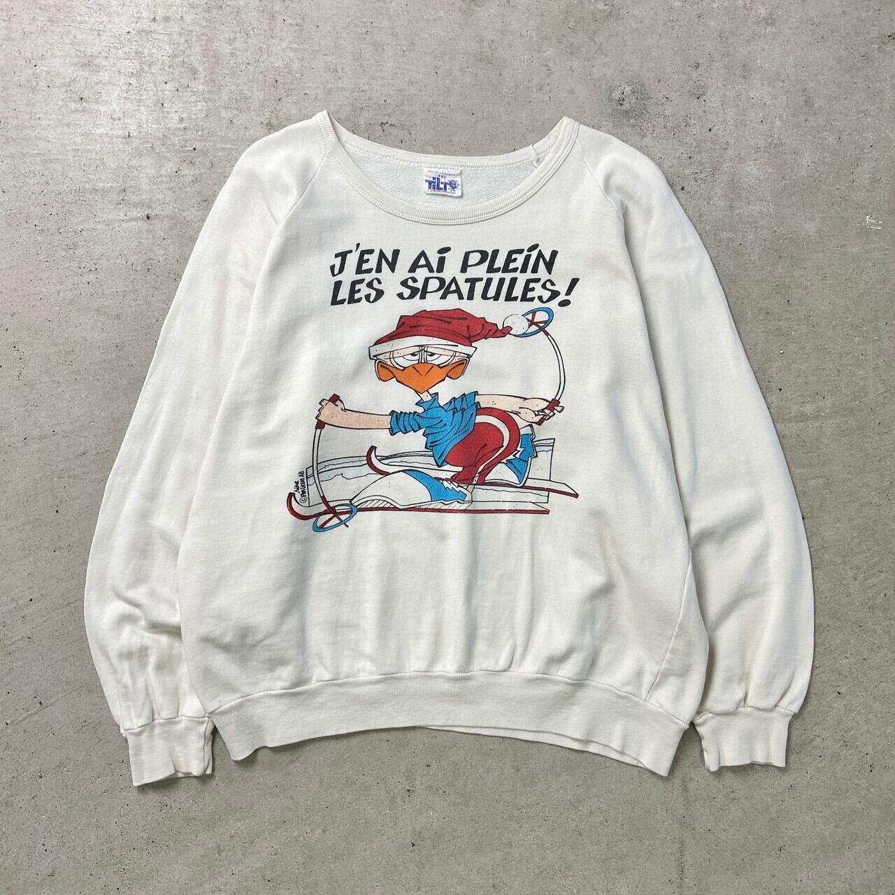 ■80年代 フランス製 ユーロ メッセージプリントスウェットシャツ メンズM相当 古着 80s ラグランスリーブ ヴィンテージ VINTAGE キャラクター 白色 【スウェット】/ホワイト 【ブランド】TiLT 【サイズ】表記 4×5 ※計測値をご確認ください。 着丈…54 身幅…60 裄丈…69.5 袖丈(袖下計測)…49 【生産国】フランス製 【素材】ポリエステル85%、不明15% 【状態】右袖裏に若干のシミ汚れがあります。 目立ったダメージはございません。 画像にてご確認ください。 【c250329010】 ※古着は洗濯、検品などのケアを行っております。(新品・デッドストックは洗濯していません。)