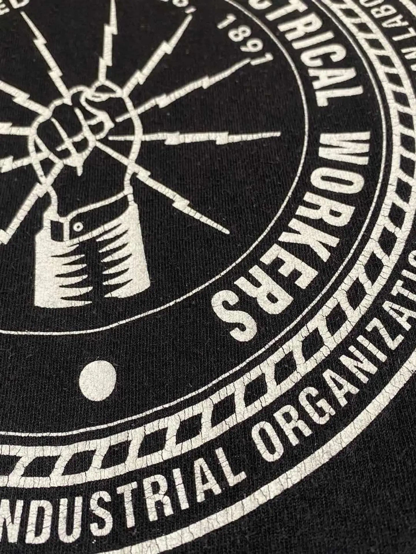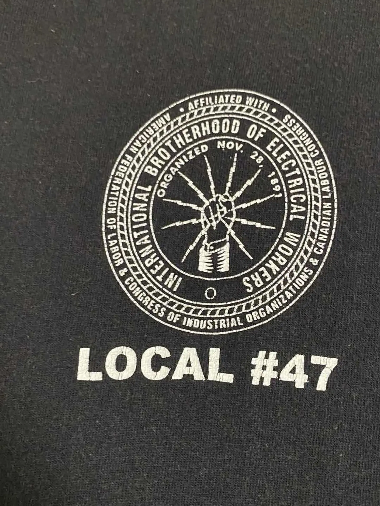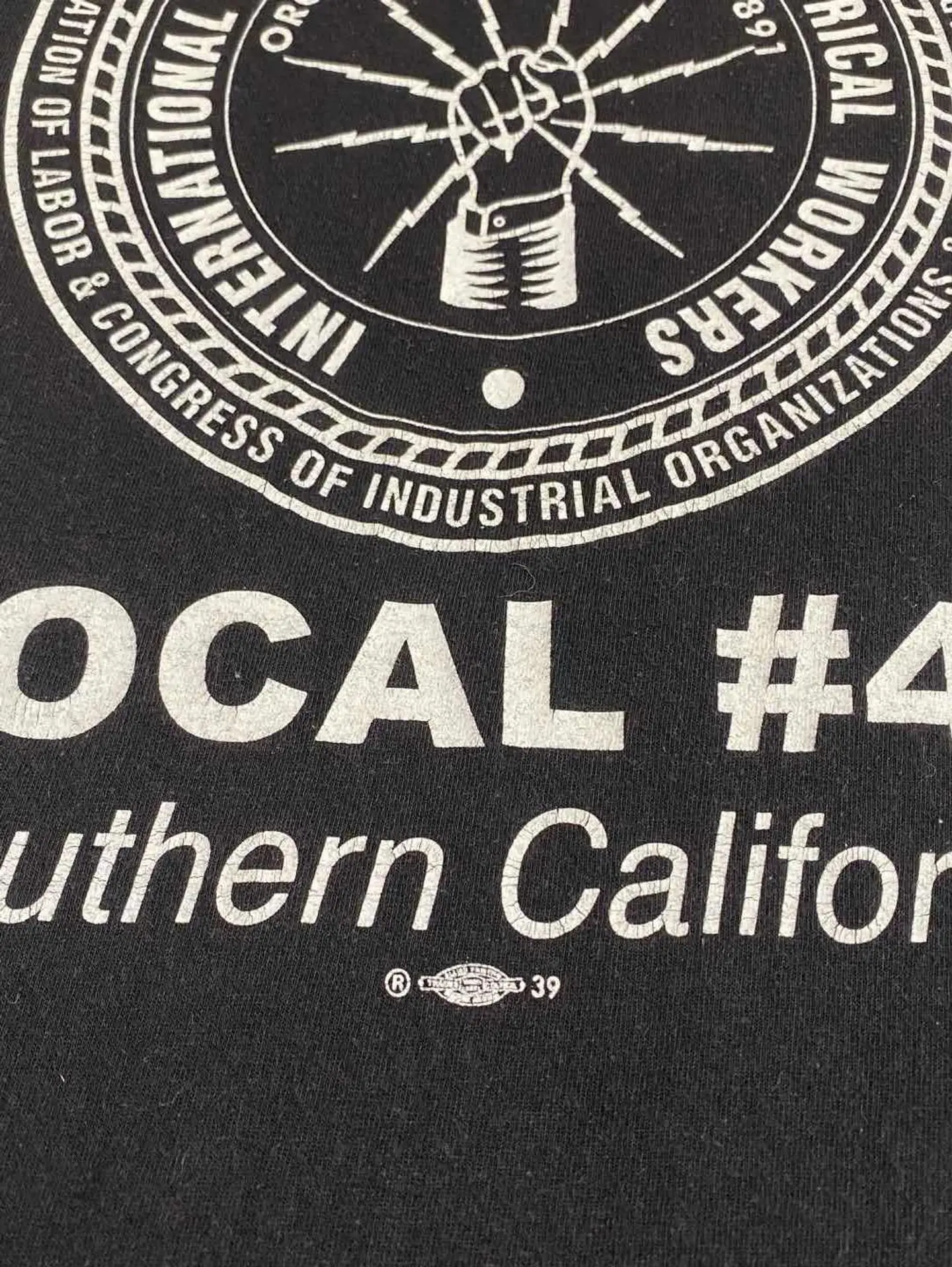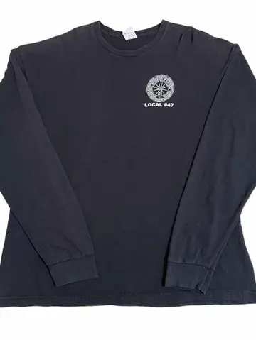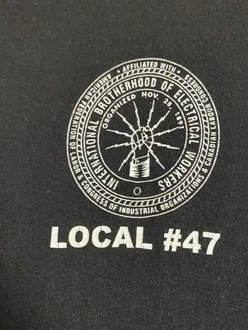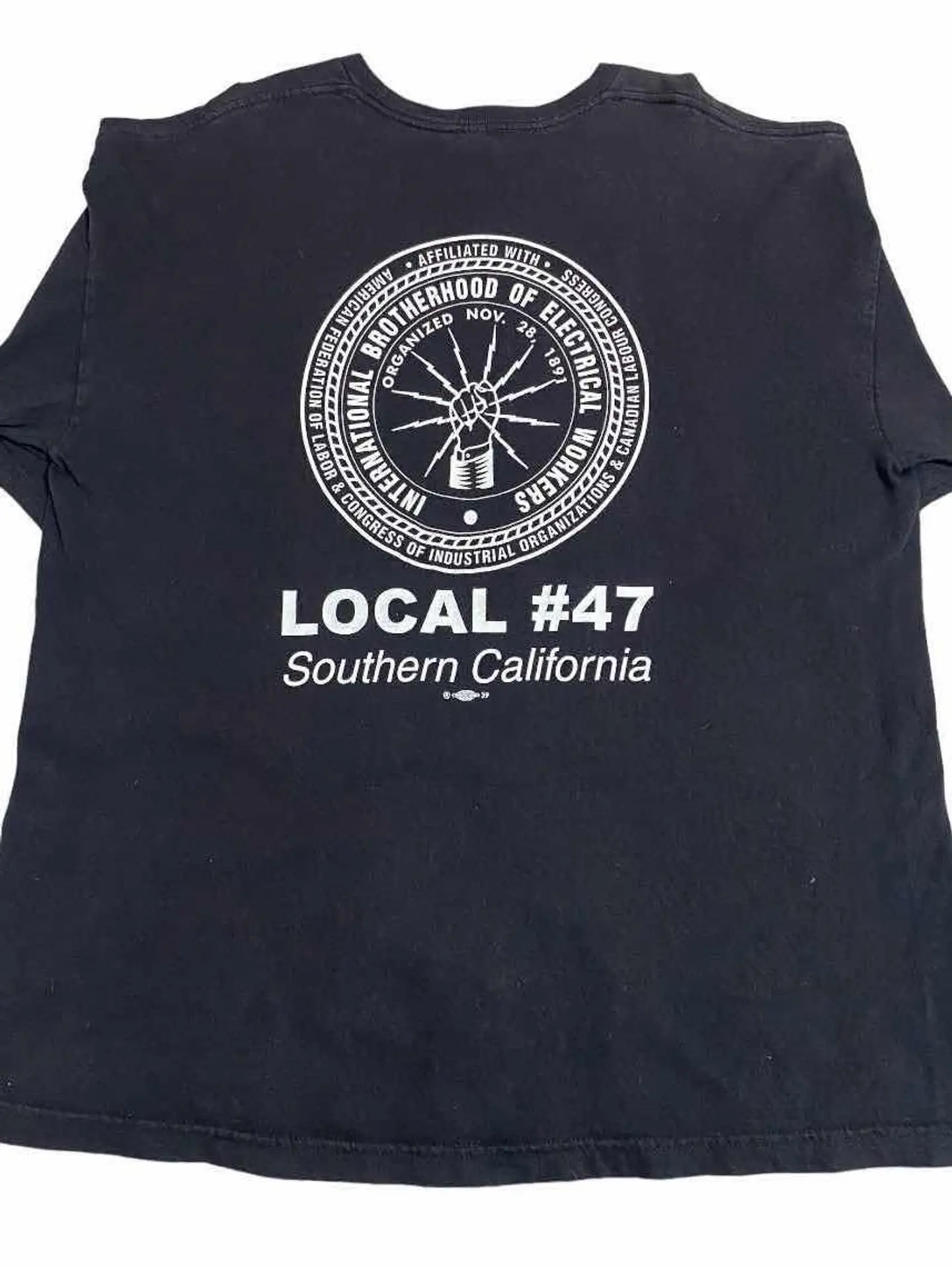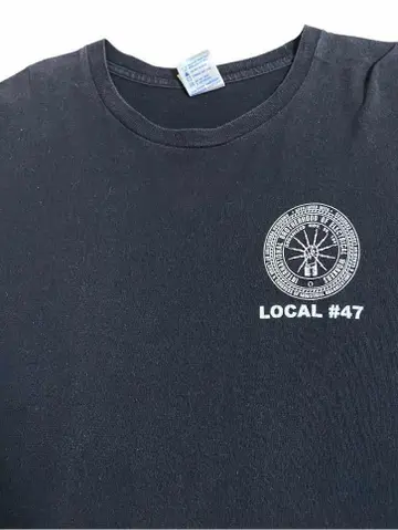 【商品詳細】 「IBEW(International Brotherhood of Electrical Workers)=電力労働者の国際的兄弟」という名の労働組合の記念tシャツです。 振り上げた拳(労働者の象徴)から放電するデザインは、労働者の団結と資本家への抵抗を旨とする労組のスピリッツを感じることができます。 ビッグサイズですが、オススメの一枚です。 【サイズ実寸】 着丈 73 肩幅 63 身幅 59 袖丈 67 【素材】 綿100% 【生産国】 アメリカ 【カラー】 ブラック ホワイト