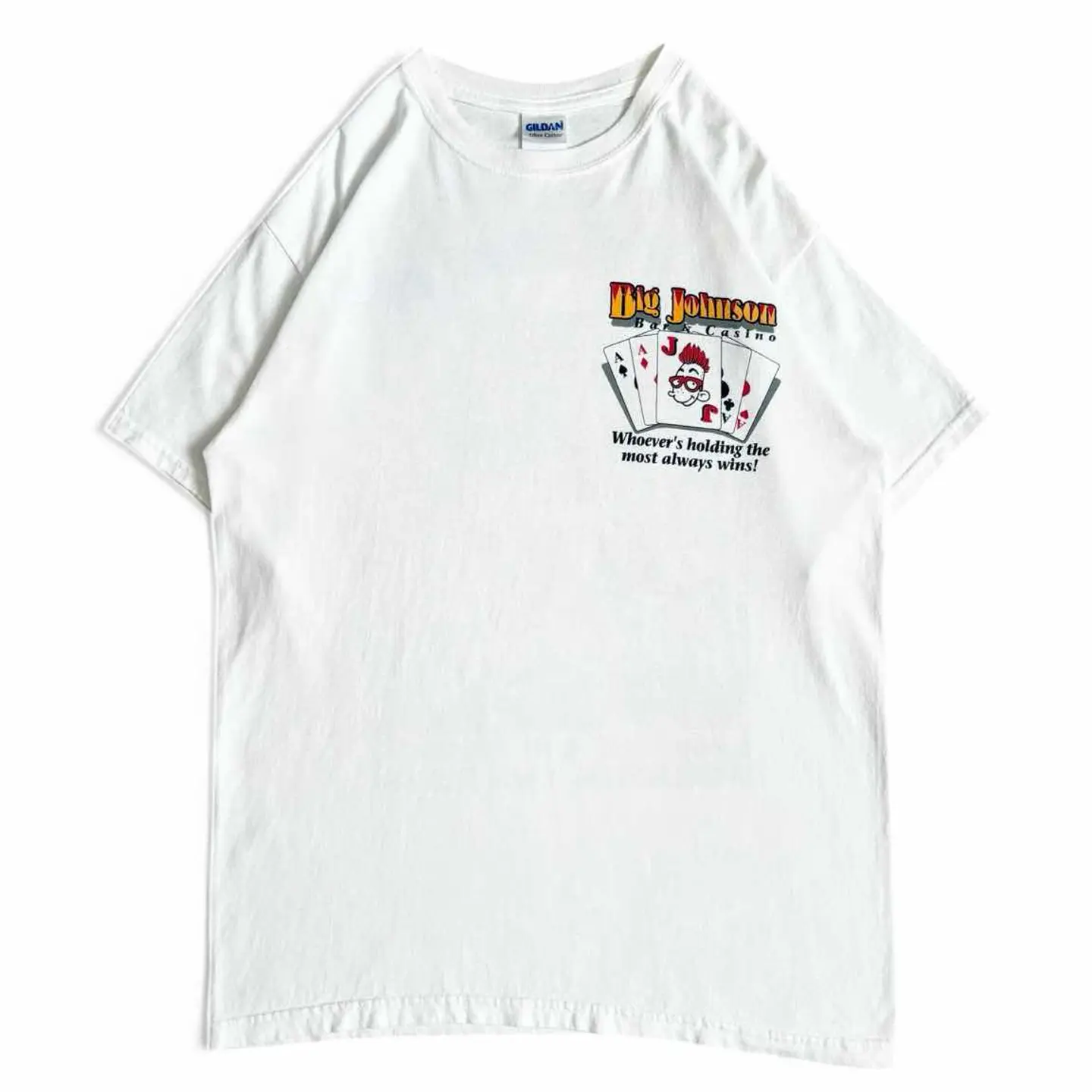 ○商品説明 GILDAN デザインが良い一枚。 こういう系のデザインは個人的に 好きですね。 ビビッときた方は是非。 ○サイズ 表記 M 平置き ・肩幅48cm ・身幅50cm ・袖丈19cm ・着丈69cm ○商品の状態 B A:使用感がほとんどなく、汚れやシミもなし B:多少使用感はあるが、汚れやシミも少ない C:使用感があり、汚れやシミがある D:使用感があり、大きな汚れや破れあり ○色 ホワイト #GILDAN#ギルダン#カジノ#Tシャツ