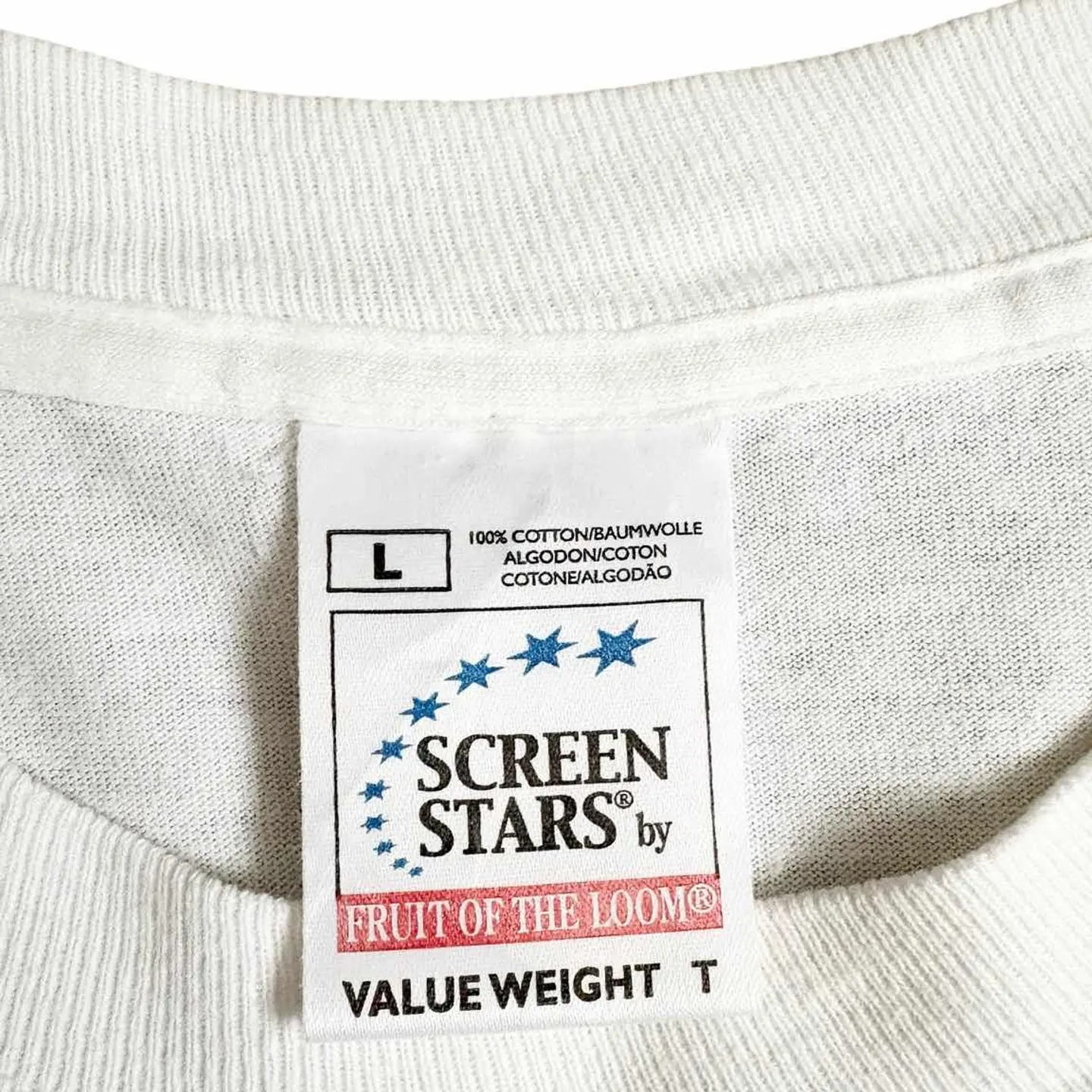○商品説明 SCREENSTARS おそらく何かの企業ものかと思います。 オシャレした青リンゴちゃんが 車に轢かれそうになって慌てていますね笑 デザインが◎ 気になった方は是非。 ○サイズ 表記 L 平置き ・肩幅56cm ・身幅55cm ・袖丈21cm ・着丈69cm ○商品の状態 B A:使用感がほとんどなく、汚れやシミもなし B:多少使用感はあるが、汚れやシミも少ない C:使用感があり、汚れやシミがある D:使用感があり、大きな汚れや破れあり ○色 ホワイト #SCREENSTARS#スクリーンスターズ #FRUITOFTHELOOM#フルーツオブザルーム#企業#Tシャツ