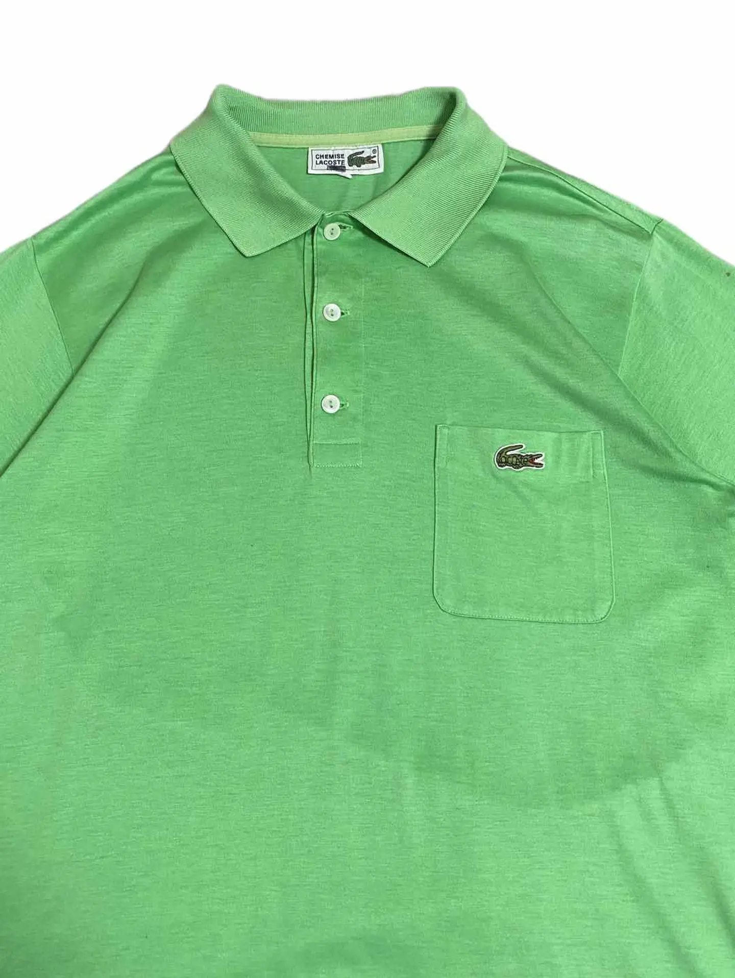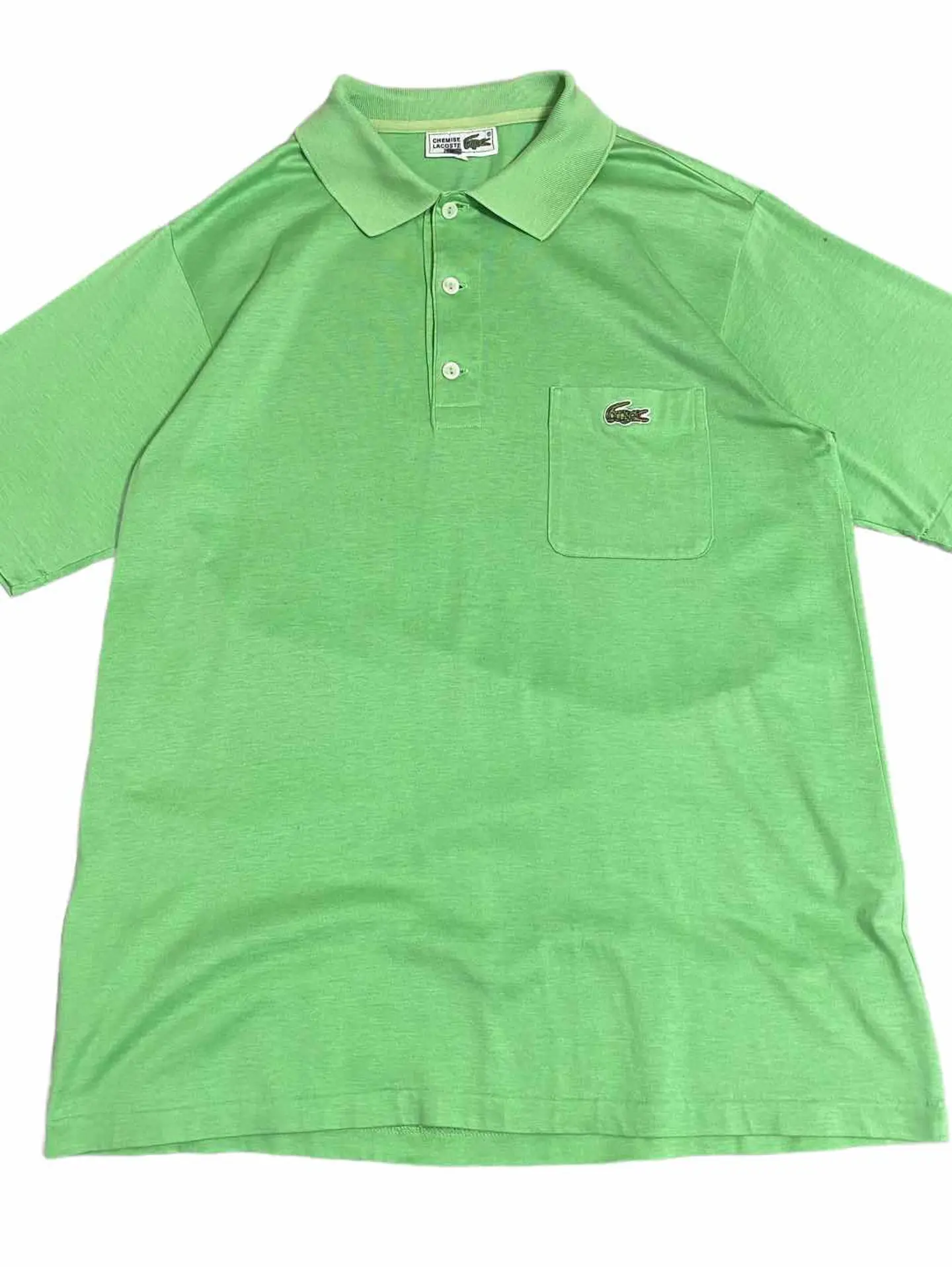 【商品詳細】 CHEMISE LACOSTE ポロシャツ 右肩後ろ部分に汚れはありますが それ以外は問題なく着れるコンディションです 【サイズ実寸】 着丈 67 肩幅 41 身幅 49 袖丈 24 【素材】 綿100% 【カラー】 ライトグリーン