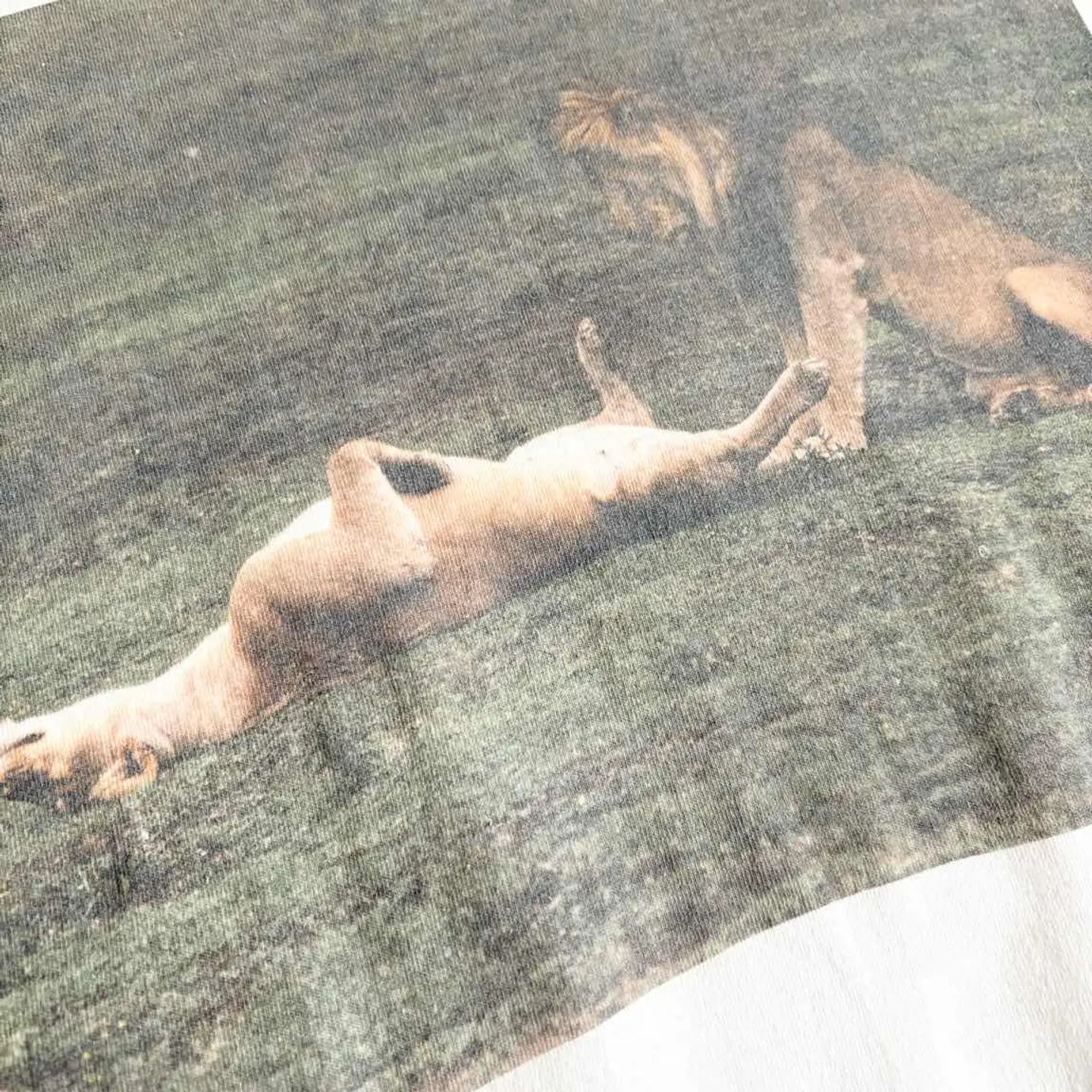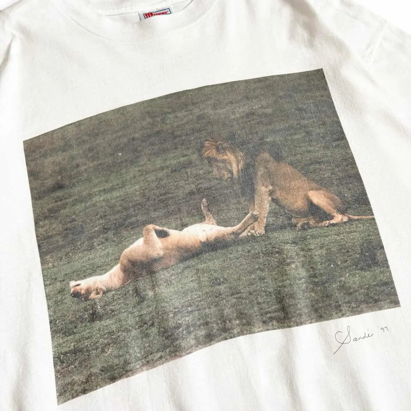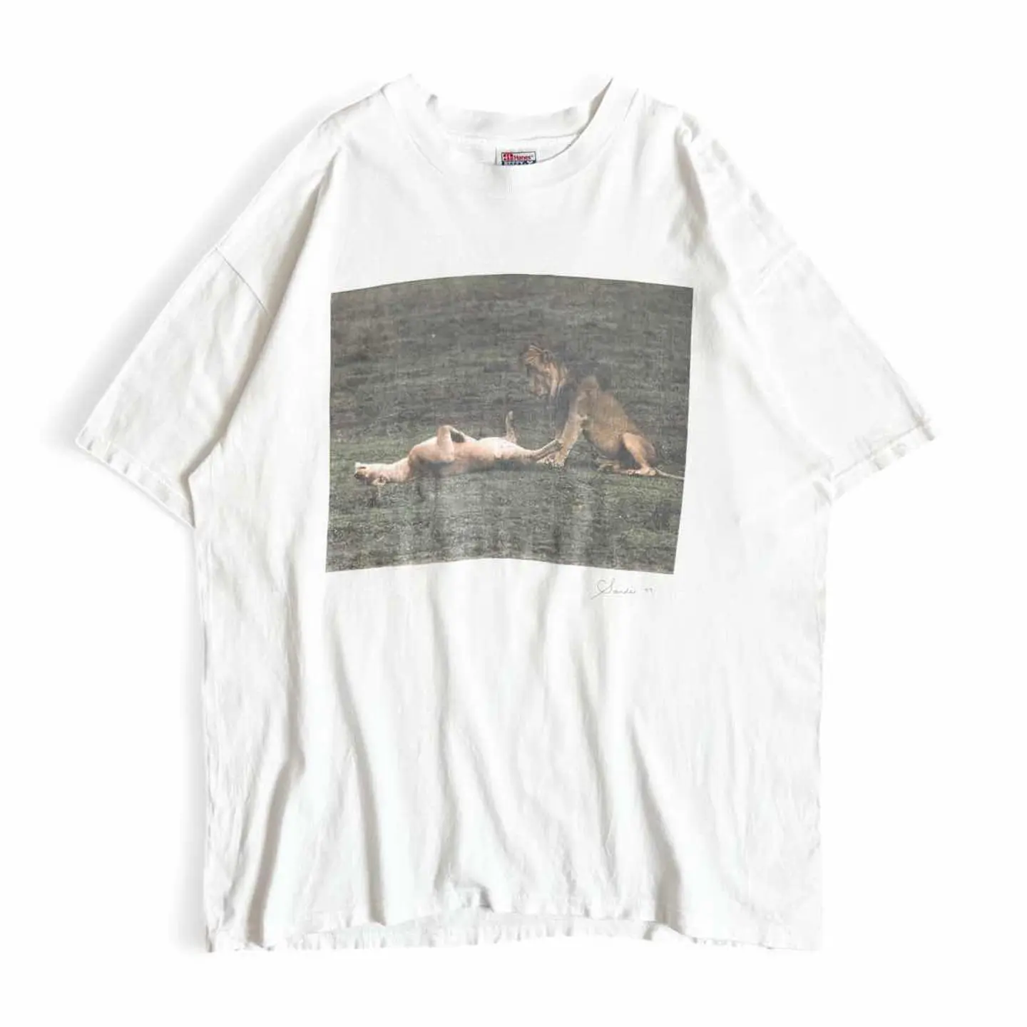 ○商品説明 USA製 Hanes ライオンのメスとオスがプリントされています。 ◯◯中なのでしょうか笑 考えれば考えるほど訳わからんし面白いです笑 気になった方は是非。 ○サイズ 表記 XL 平置き ・肩幅60cm ・身幅62cm ・袖丈22cm ・着丈77cm ○商品の状態 B A:使用感がほとんどなく、汚れやシミもなし B:多少使用感はあるが、汚れやシミも少ない C:使用感があり、汚れやシミがある D:使用感があり、大きな汚れや破れあり ○色 ホワイト #USA製#Hanes#ヘインズ#animal#Tシャツ