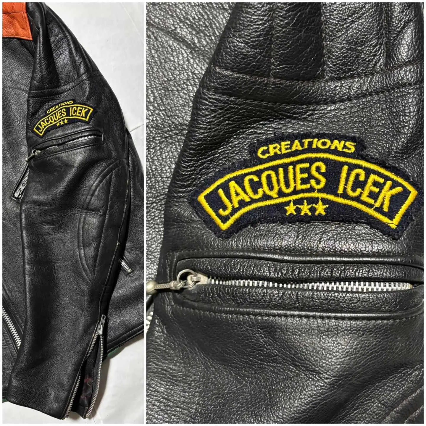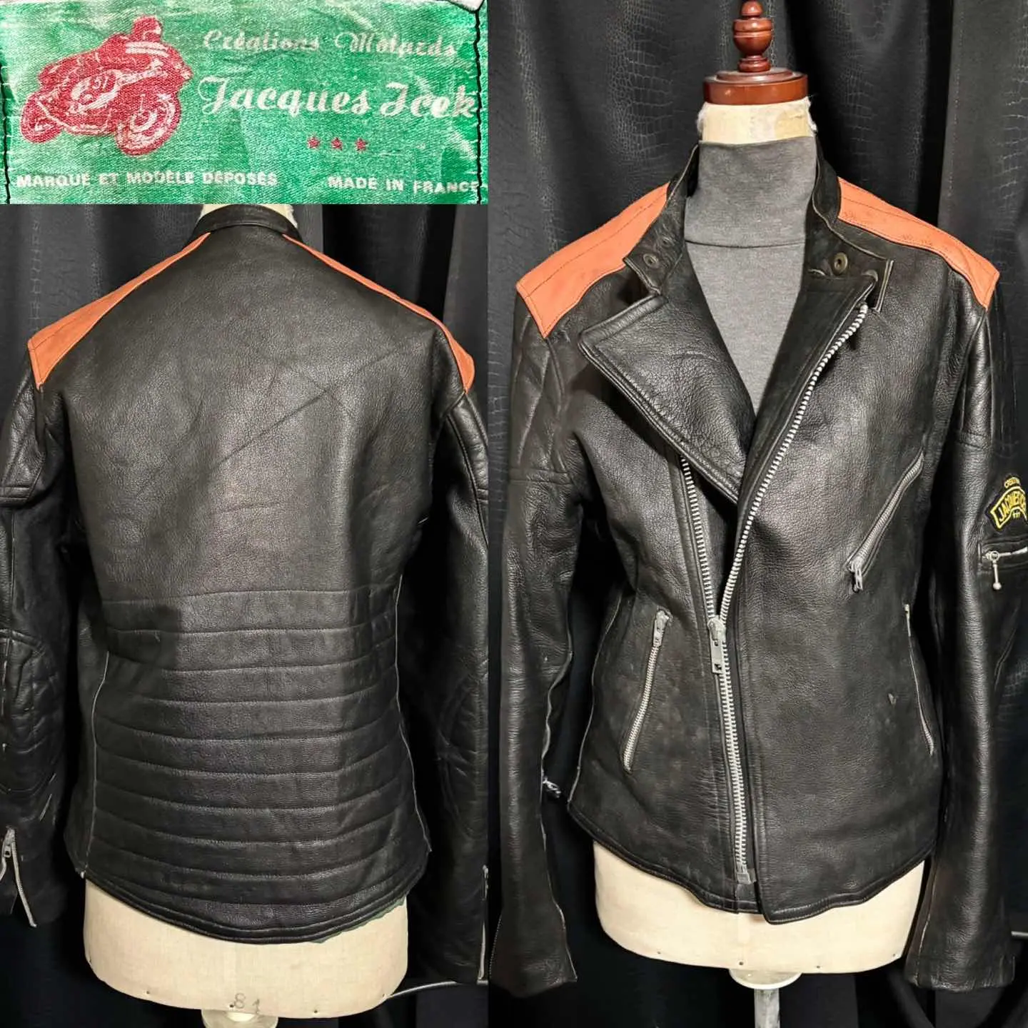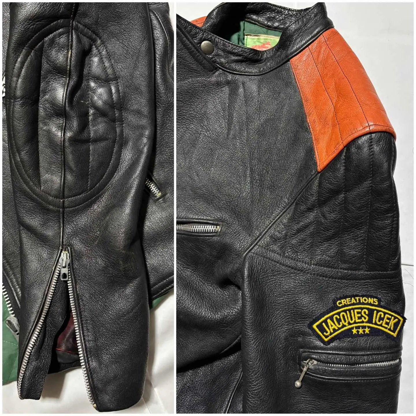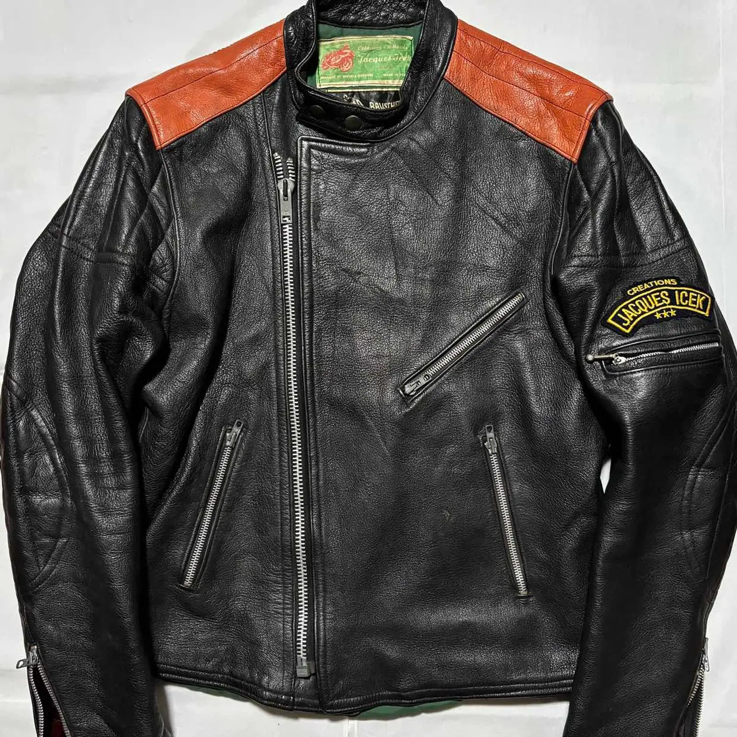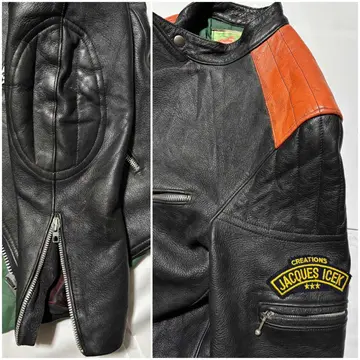 ■ JACQUES ICEK 70年代 ヴィンテージ 革 ライダース バイカー ジャケット フランス製 送料無料 格安‼️ ■60〜70年代にかけて展開のフランスのバイカージャケットブランド フランス製で当時の高額モデルと思われます 同ブランドはネット古着店で8万円程の物もあり高額相場(当方検索結果) 肩のオレンジの切替やプロテクター的なステッチが目を惹きます ブラック黒系 ロック アメカジ ワーク ミリタリー 系にも schott ショット vanson バンソン Harley-Davidson ハードダビッドソン Lewis Leathers ルイスレザー 666 BELSTAFF ベルスタッフ AVIREX アヴィレックス 好きに ■サイズ 本体表記は51にも見えますがフランスサイズは偶数刻みなので50の0部分の刺繍糸が取れたと思われます フランスM相当ですが海外サイズなので日本のL位に感じます ■着丈約64cm 肩幅約46cm 身幅約(脇下)53cm 袖丈約65cm 衣類は立体で伸縮等もあり測定位置など手法や主観が個々異なれば当然差が生じます メルカリの測定イラストと同位置数値ですが当方主観の平置き採寸ですので人により異なる場合もある事から確約出来る数値では無くあくまで参照用です ご自身の測定値との相違を申されても対応致しかねますので本体のサイズ表記を元にご自身の責任でご判断下さい ■当方主観では50年程前の品としてはまずまずまともな方に感じます これ位古いと裏地や袖口裏地が破れている物が多いですがこちらは若干の擦れ感はありますが破れなし(アップ画像参照 まだらに写っているのは光沢希少の為) 革なので当然シワや擦れ感の革風合いはありますが年代物としてはまともに感じます(一例オレンジ部分の色感同アップ画像参照) ビンテージ好きにお薦めですがその辺りに嗜好無く綺麗さに拘る方には趣向や価値観が異なる場合があります 後にご自身の主観との相違を申されても対応致しかねますが年代物の古着好む方ならまともな方に感じて頂けると思います USEDを安価に取引する場の趣向にご理解のある方でお願いします。 #ライダース #レザージャケット #ヴィンテージレザー #古着