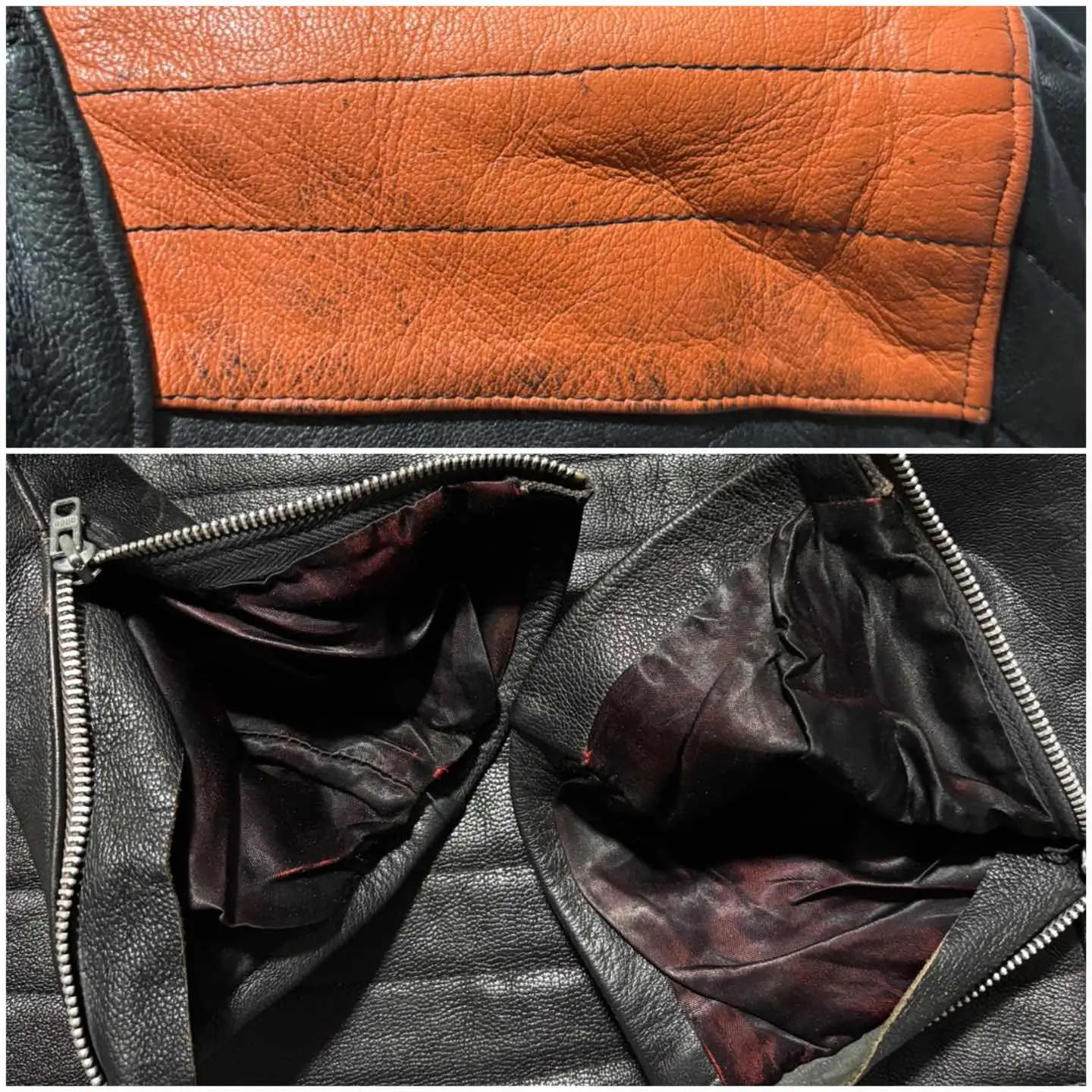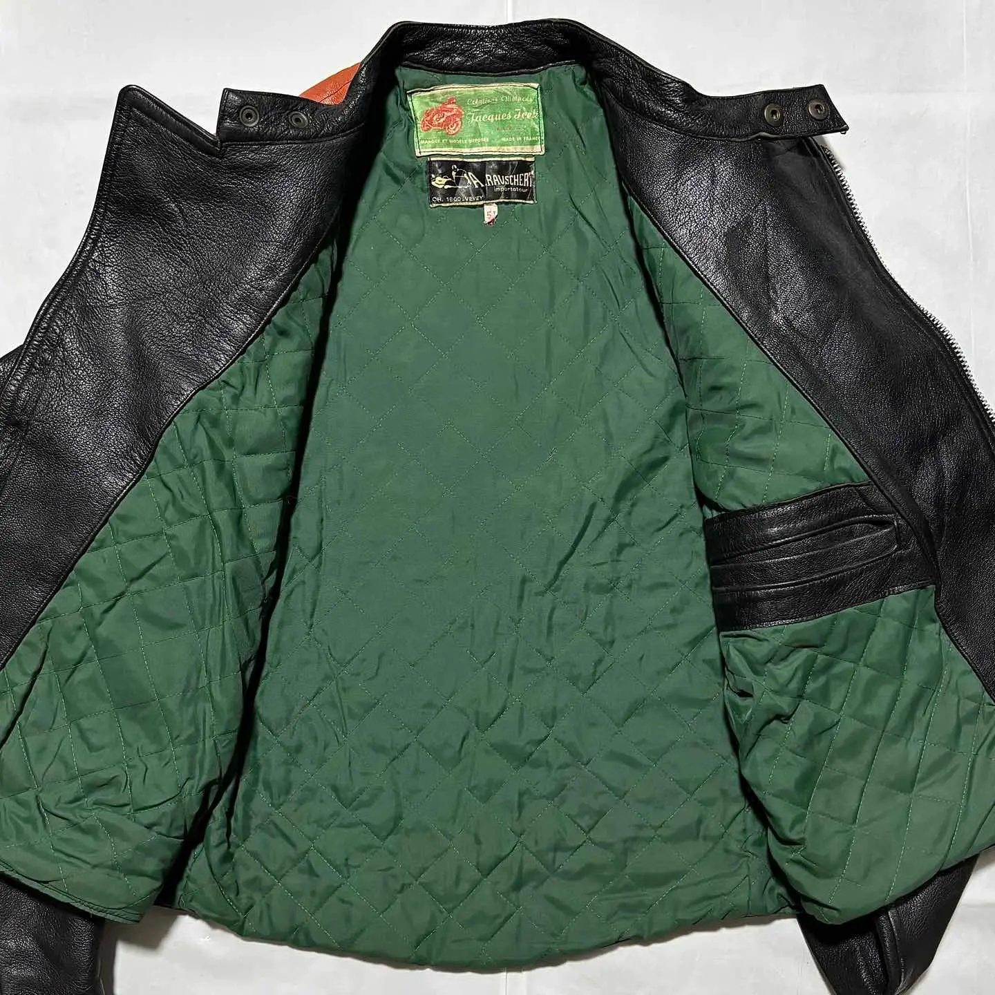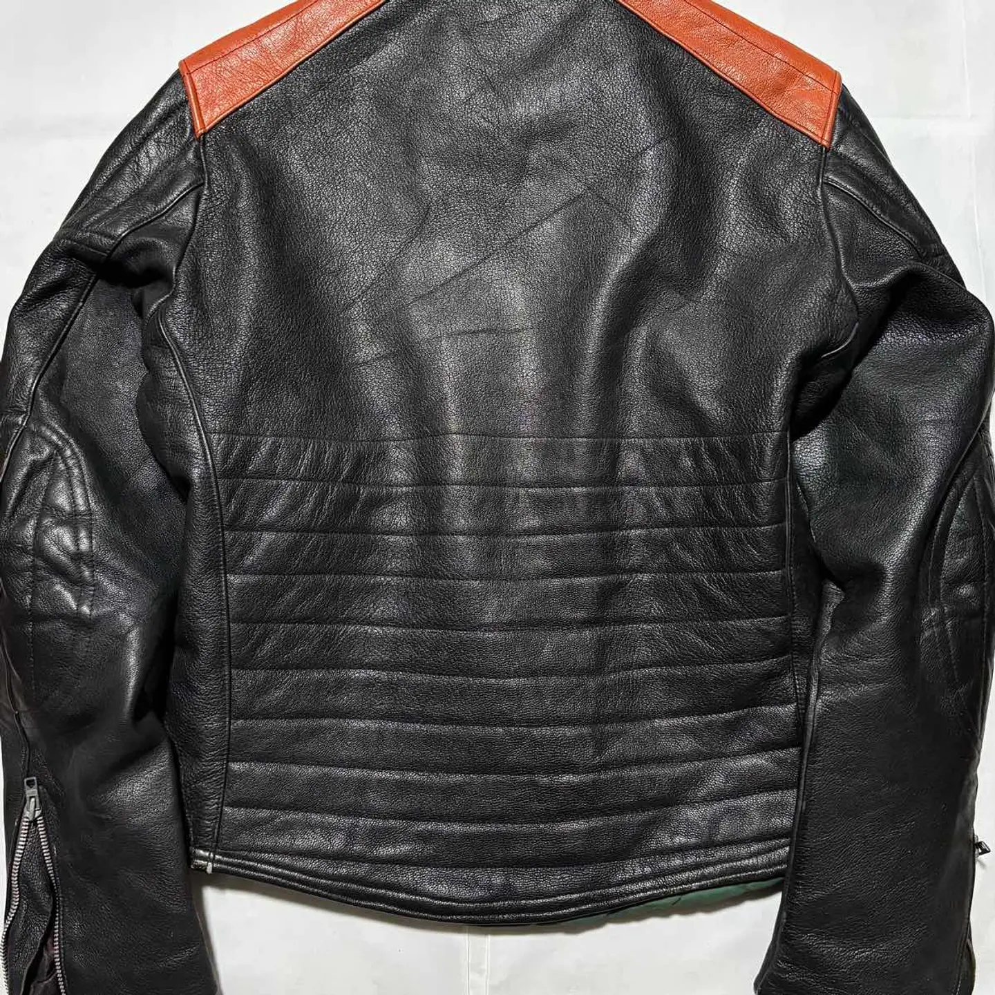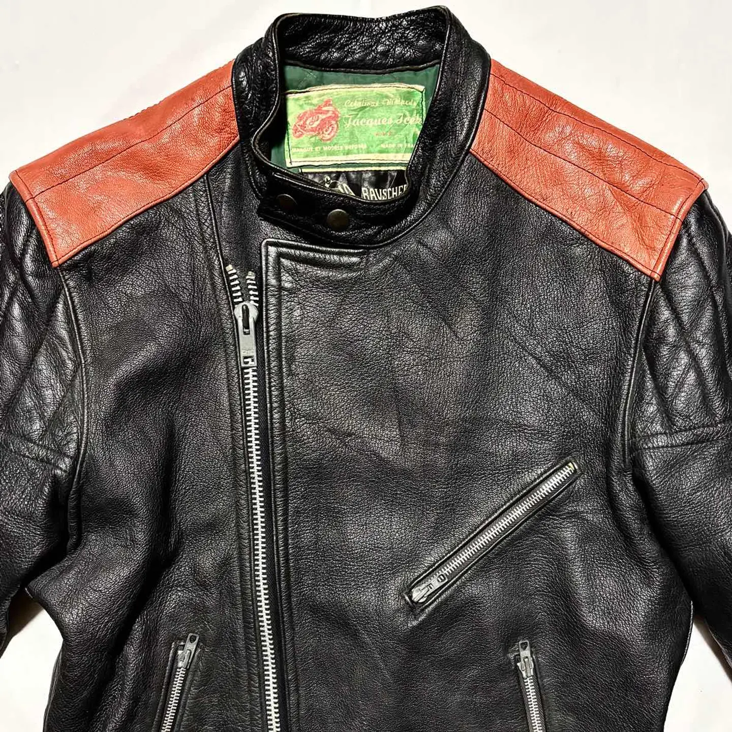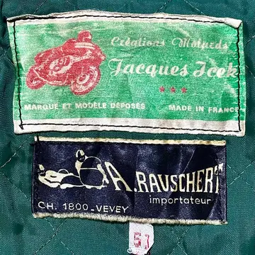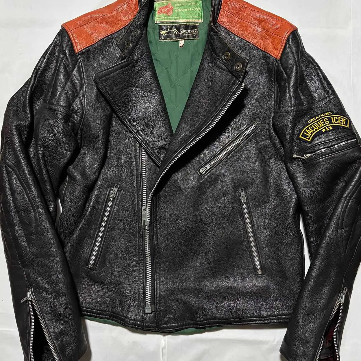 ■ JACQUES ICEK 70年代 ヴィンテージ 革 ライダース バイカー ジャケット フランス製 送料無料 格安‼️ ■60〜70年代にかけて展開のフランスのバイカージャケットブランド フランス製で当時の高額モデルと思われます 同ブランドはネット古着店で8万円程の物もあり高額相場(当方検索結果) 肩のオレンジの切替やプロテクター的なステッチが目を惹きます ブラック黒系 ロック アメカジ ワーク ミリタリー 系にも schott ショット vanson バンソン Harley-Davidson ハードダビッドソン Lewis Leathers ルイスレザー 666 BELSTAFF ベルスタッフ AVIREX アヴィレックス 好きに ■サイズ 本体表記は51にも見えますがフランスサイズは偶数刻みなので50の0部分の刺繍糸が取れたと思われます フランスM相当ですが海外サイズなので日本のL位に感じます ■着丈約64cm 肩幅約46cm 身幅約(脇下)53cm 袖丈約65cm 衣類は立体で伸縮等もあり測定位置など手法や主観が個々異なれば当然差が生じます メルカリの測定イラストと同位置数値ですが当方主観の平置き採寸ですので人により異なる場合もある事から確約出来る数値では無くあくまで参照用です ご自身の測定値との相違を申されても対応致しかねますので本体のサイズ表記を元にご自身の責任でご判断下さい ■当方主観では50年程前の品としてはまずまずまともな方に感じます これ位古いと裏地や袖口裏地が破れている物が多いですがこちらは若干の擦れ感はありますが破れなし(アップ画像参照 まだらに写っているのは光沢希少の為) 革なので当然シワや擦れ感の革風合いはありますが年代物としてはまともに感じます(一例オレンジ部分の色感同アップ画像参照) ビンテージ好きにお薦めですがその辺りに嗜好無く綺麗さに拘る方には趣向や価値観が異なる場合があります 後にご自身の主観との相違を申されても対応致しかねますが年代物の古着好む方ならまともな方に感じて頂けると思います USEDを安価に取引する場の趣向にご理解のある方でお願いします。 #ライダース #レザージャケット #ヴィンテージレザー #古着