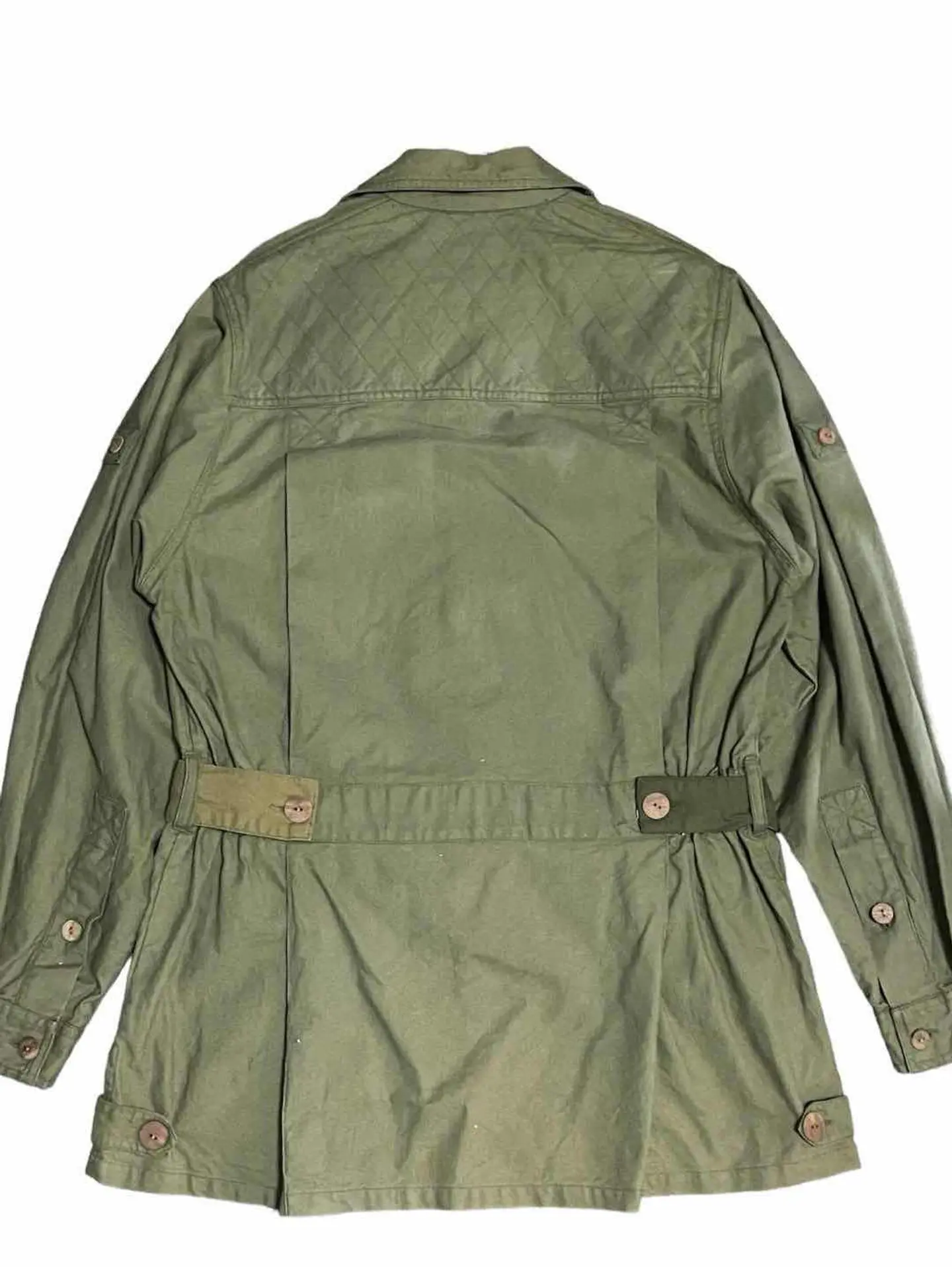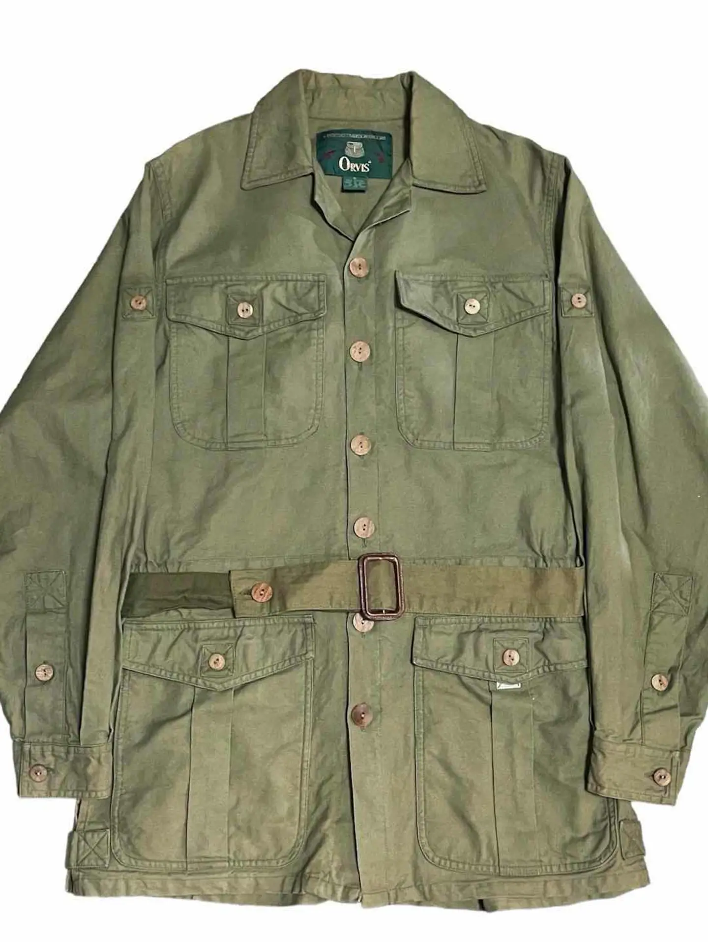 90s ORVIS サファリジャケット グッドレギュラー 名品の多い90sORVISの中でもトップピースでしょう。 サイズも希少なS このタグでサファリジャケットはまず出てきません。 若干の焼けはありますが古着慣れされた方であれば問題ないコンディションかと。 写真8枚目のボタンのみ外れません。 サイズ 表記 S 実寸 身幅54cm 着丈77cm 肩幅43cm