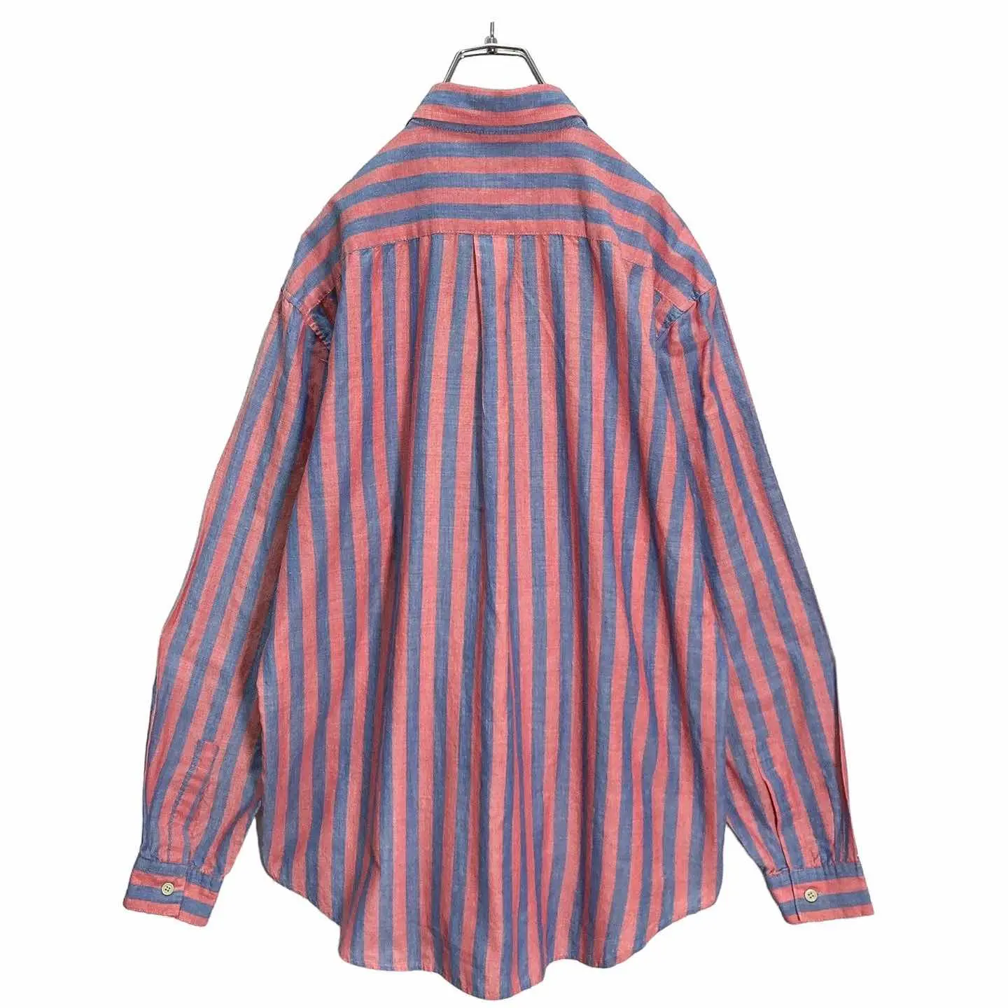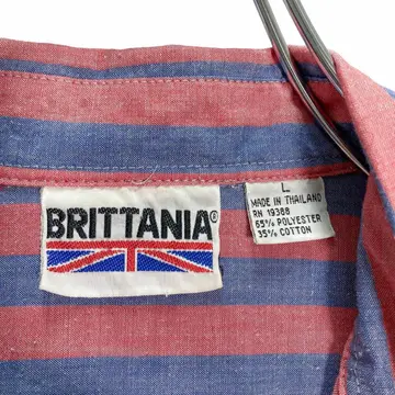 【商品名】80-90s BRITTANIA Red × Blue L/S BD stripe shirt 【ブランド】 【コンディション】B ______________________ 80~90年代BRITANIAのBDストライプシャツ。 淡いブルーとレッドのカラーリングが 比較的珍しく、そして印象的な1着。 イギリス国旗を取り入れたワンポイントロゴも 非常に秀逸です。 生地はポリコットンで柔らかく薄手の 肌触りも良いアイテム。 表記サイズはLサイズ。オススメです。 サイズ:L 着丈78 身幅59.5 肩幅51.5 袖丈61.5