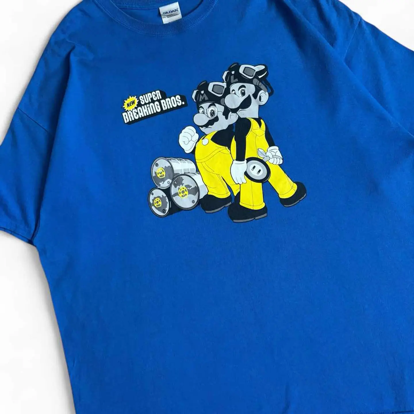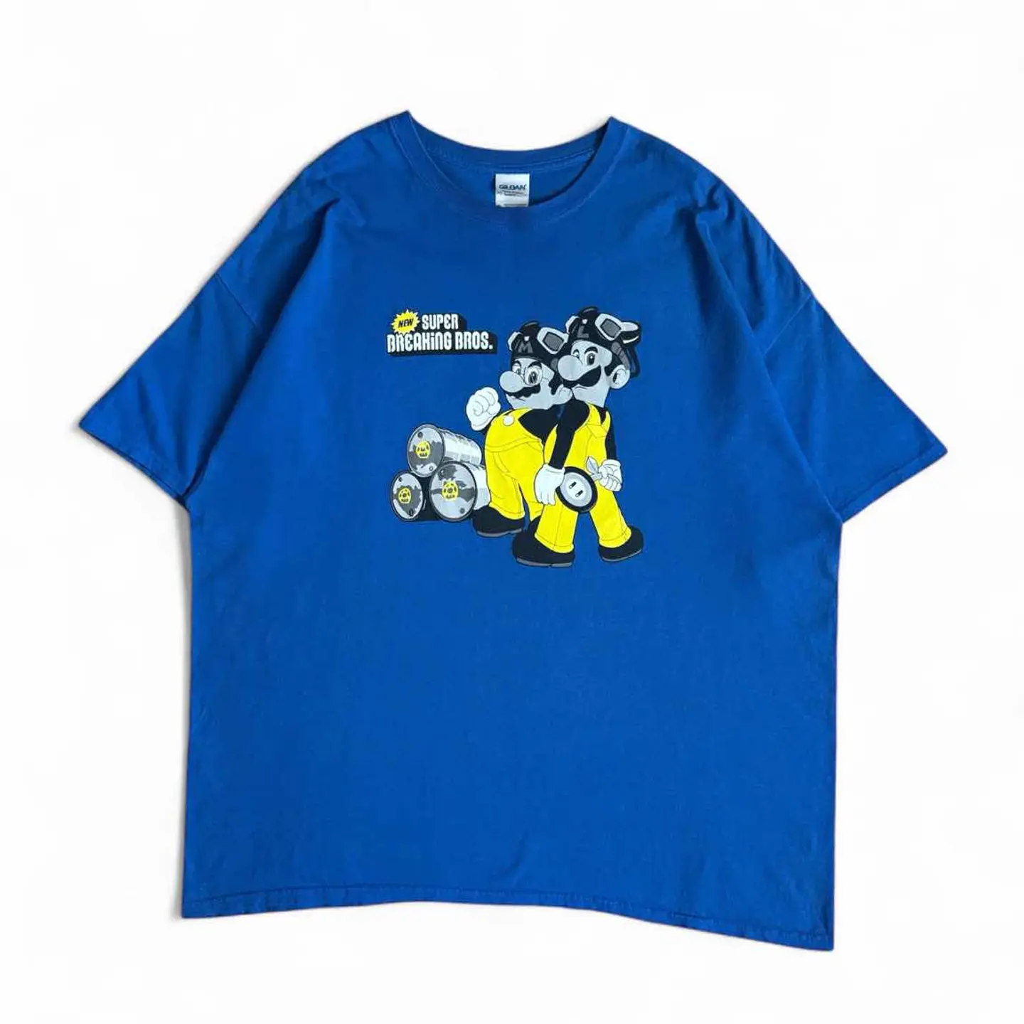 ○商品説明 GILDAN SuperBreakingBros 任天堂の「スーパーマリオブラザーズ」のパロディ になります。 「SUPER MARIO BROS.」の文字が 「BREAKING(壊す)」に変えており、 マリオ+工事や破壊活動をテーマにしたパロディです。 地面にはドクロマーク付きのドラム缶が積まれていて 危険物を連想させます。 ビビッときた方は是非。 ○サイズ 表記2XL 平置き ・肩幅63cm ・身幅65cm ・袖丈20cm ・着丈72cm ○商品の状態 B A:使用感がほとんどなく、汚れやシミもなし B:多少使用感はあるが、汚れやシミも少ない C:使用感があり、汚れやシミがある D:使用感があり、大きな汚れや破れあり ○色 ブルー #GILDAN#ギルダン#SuperBreakingBros#パロディ#マリオ#Tシャツ
