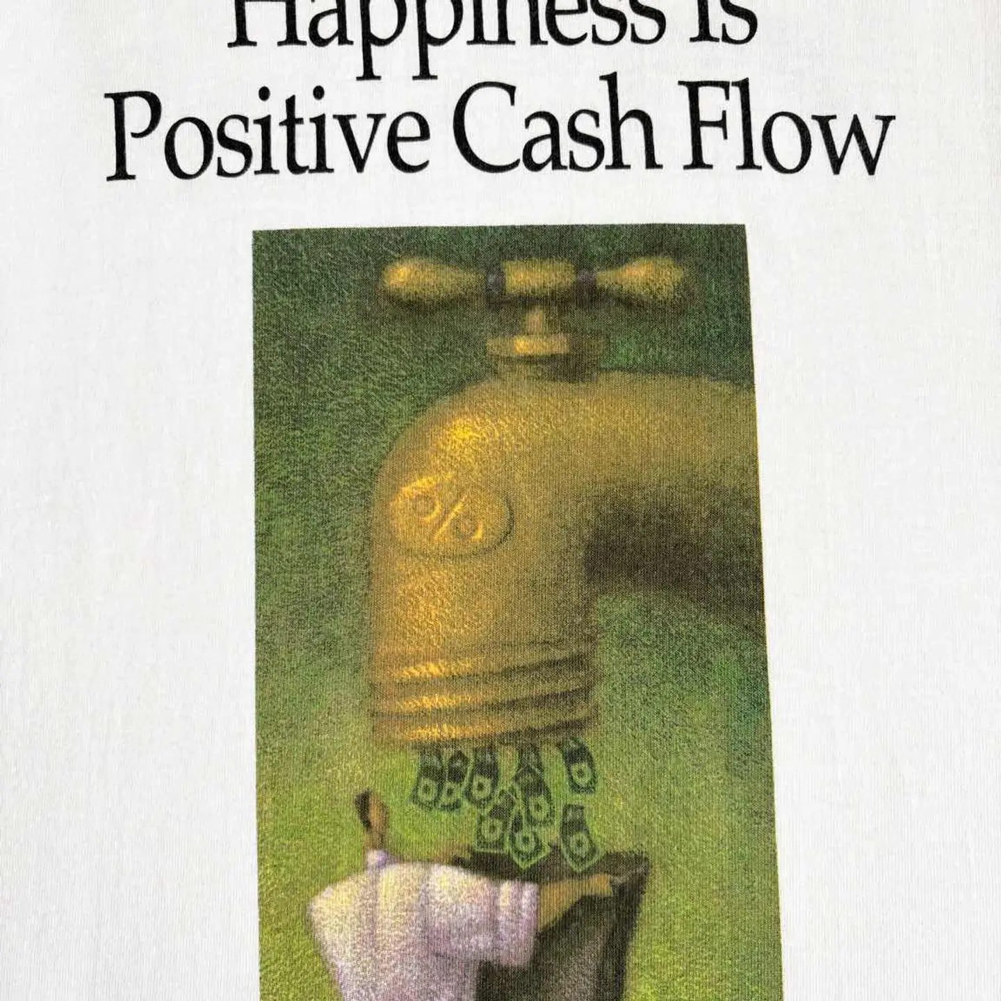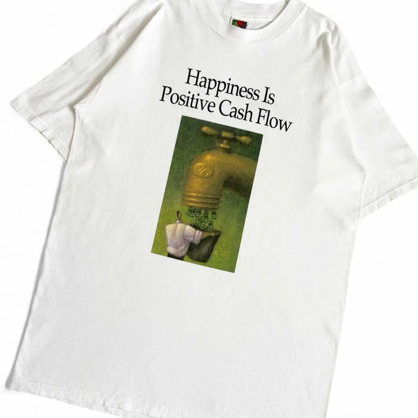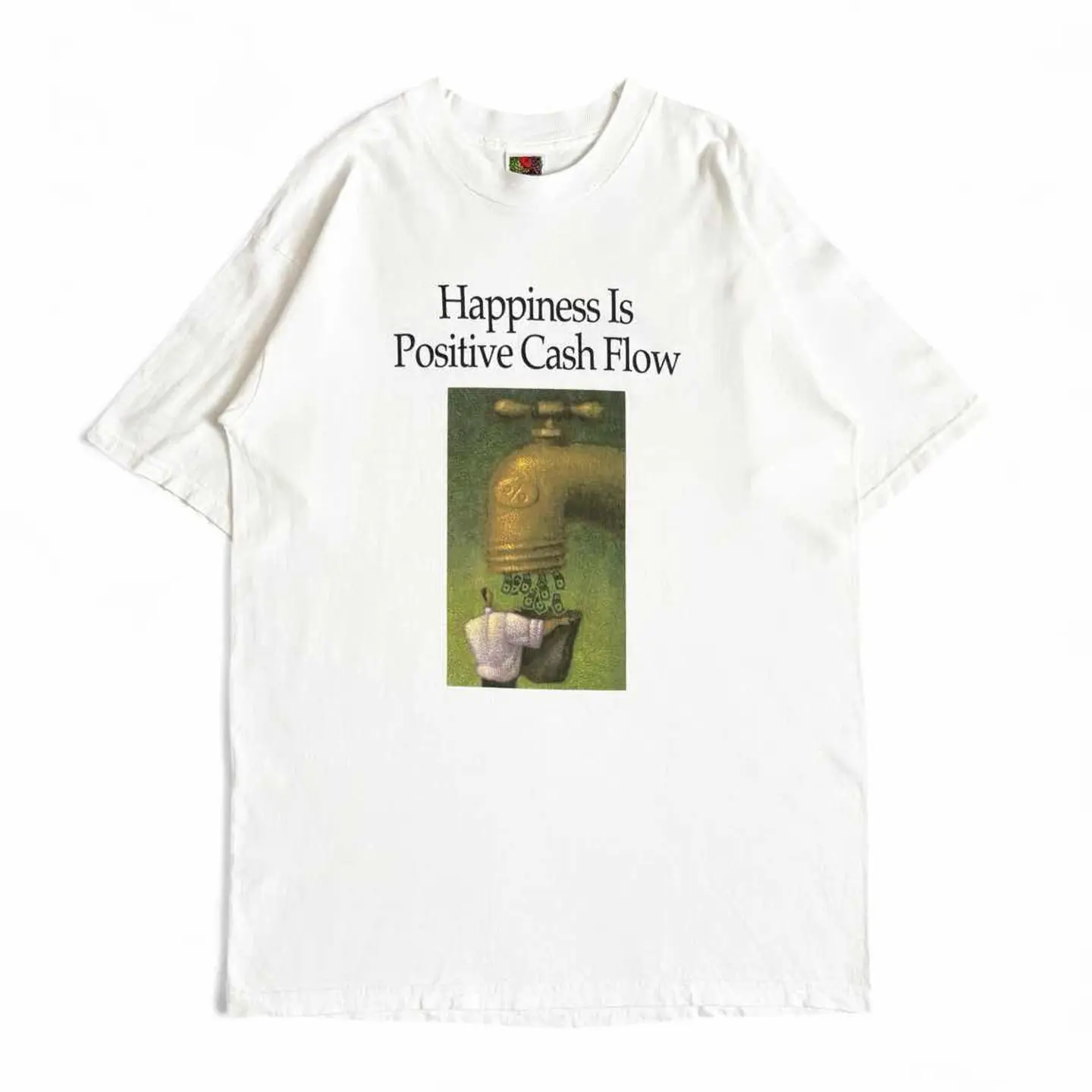 ○商品説明 FRUITOFTHELOOM Happiness Is Positive Cash Flow 幸福とは、プラスのキャッシュフローである 幸福という、ビジネスや金融分野での価値観を表現した シンプルなメッセージ。 巨大な金色の蛇口からドル紙幣が流れ出すデザイン。 蛇口には「%」のマークがあり、金利や投資利益を表現 しています。 その下でサラリーマン風の人物が、スーツケースのような入れ物で紙幣を受け取っている様子。 気になった方は是非。 ○サイズ 表記L 平置き ・肩幅51cm ・身幅52cm ・袖丈22cm ・着丈72cm ○商品の状態 B A:使用感がほとんどなく、汚れやシミもなし B:多少使用感はあるが、汚れやシミも少ない C:使用感があり、汚れやシミがある D:使用感があり、大きな汚れや破れあり ○色 ホワイト #FRUITOFTHELOOM#フルーツオブザルーム#money#マネー#Tシャツ