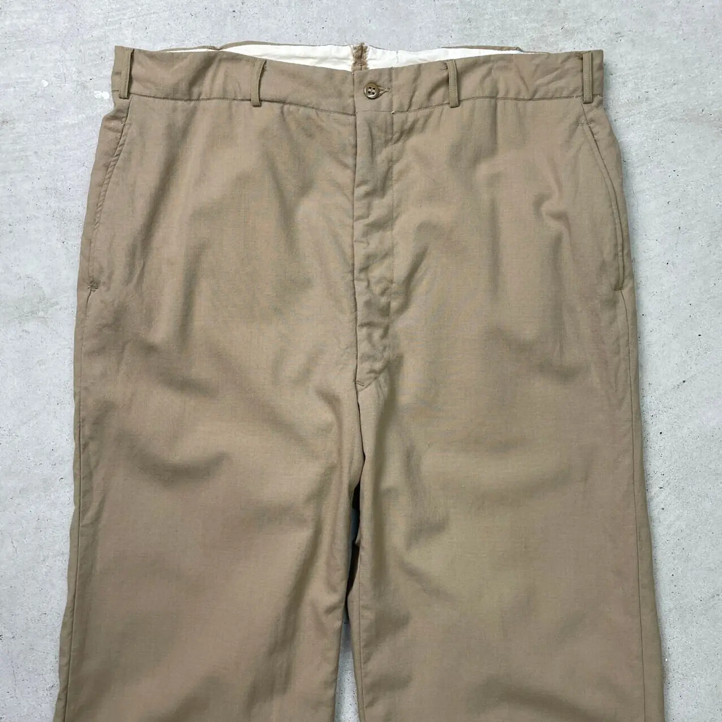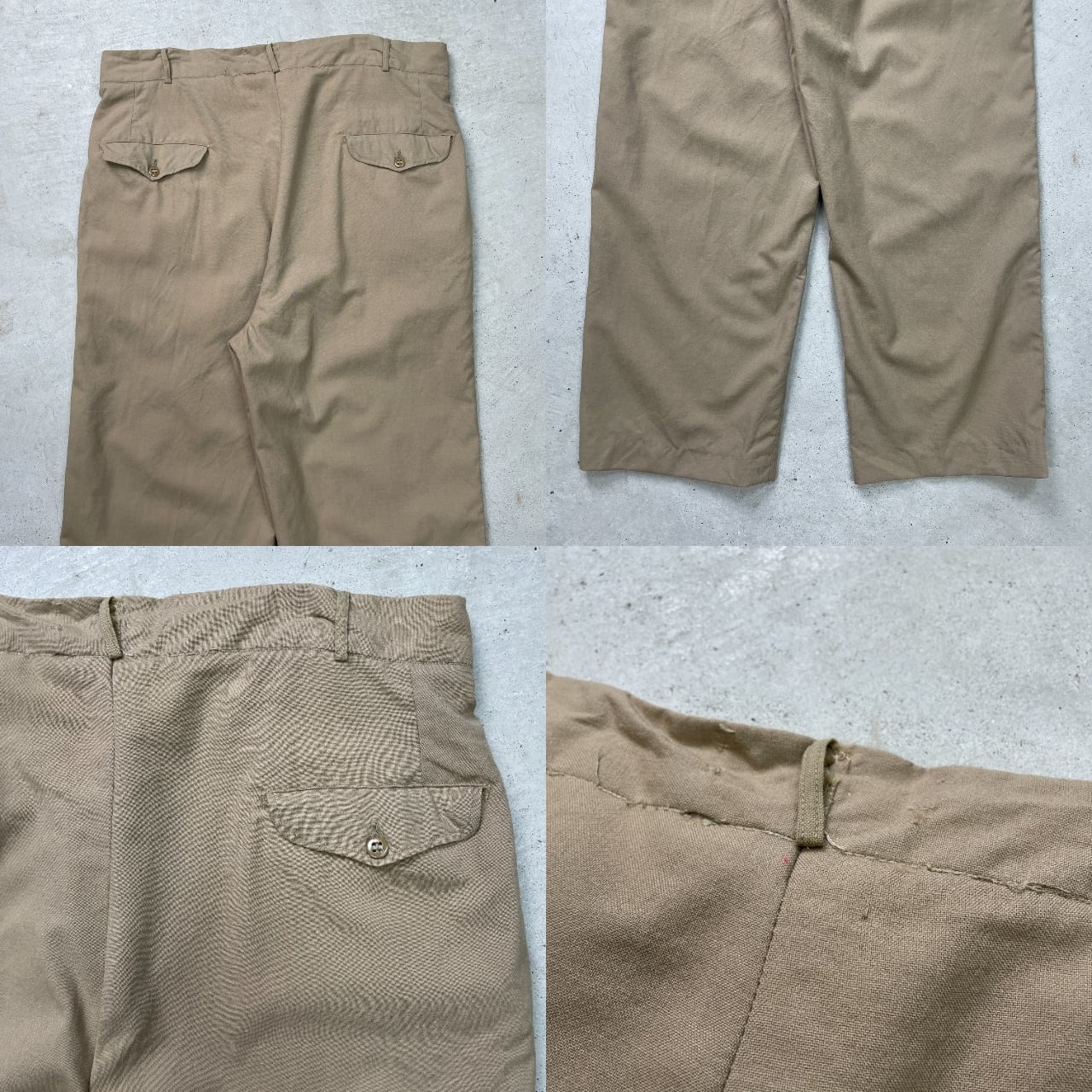 ■50年代 米軍実品 トロピカル トラウザーパンツ スラックスパンツ メンズW36 古着 50s アメカジ ミリタリー サマーウール VINTAGE ヴィンテージ KHAKI ベージュ 【ミリタリーパンツ】/ベージュ 【サイズ】表記 W36 L36 裾上げされています ※計測値をご確認ください。 ウエスト(平置き×2)…90 ワタリ幅…31.5 股上…34 股下…65.5 裾幅…24.5 【生産国】不明 【素材】ウール100% 【状態】裾上げされています。 ステッチの緩みやフロントジップ付近に小穴、矢印が書かれている部分が御座います。 またバックポケット付近に擦れが御座います。 画像にてご確認ください。 【c250508052】 ※古着は洗濯、検品などのケアを行っております。(新品・デッドストックは洗濯していません。) ※モニターの発色により実物と異なる場合がございます。予めご了承ください。 ※ 海外直輸入USED品になります。