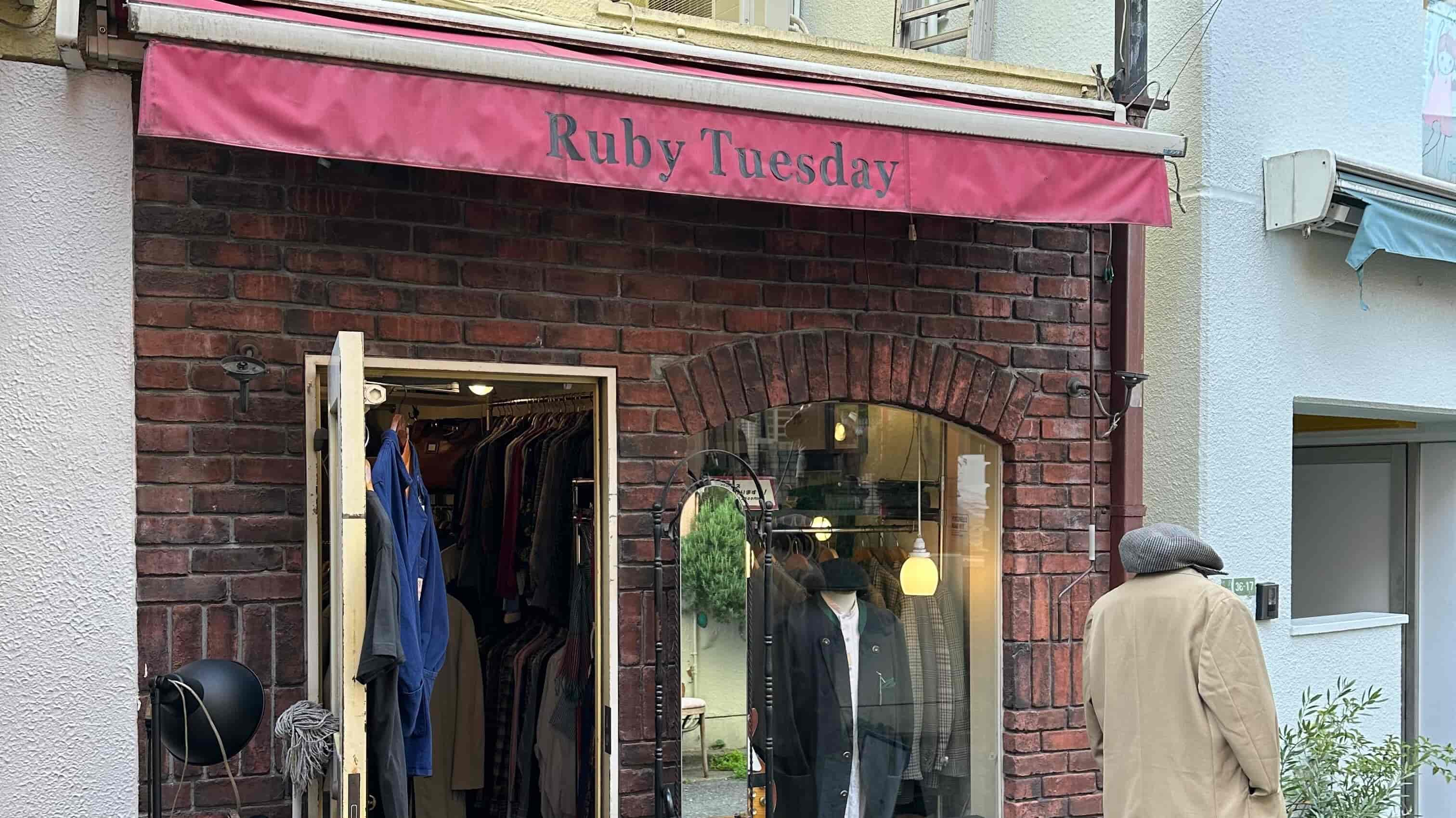 Ruby Tuesday(ルビーチューズデー)は下北沢に実店舗がある古着屋です。 ヨーロッパのシャツやジャケット、70年代から80年代の物を中心に扱っています。 年々入手が困難になってきているヴィンテージジャージ等も人気の商品です。 日本はもとよりヨーロッパからも買い付けを行って、店主が納得できる物しか店頭には出しません。 状態の良いものや長く着られるデザイン、素材のものを多く扱っています。 また、完全オーダーメイドでジーンズの制作も承っています。 お客さんそれぞれの個性を表現できる、そんなお店を目指しています。 (ホームページより引用)