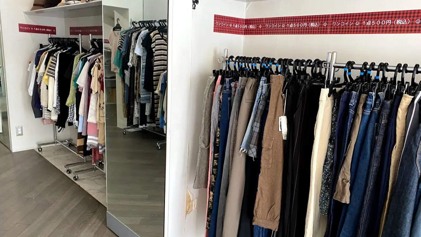 店内全て1点500円(税込)。ワンコインの無人古着店です。24時間営業。 いつでもご利用いただけます!
